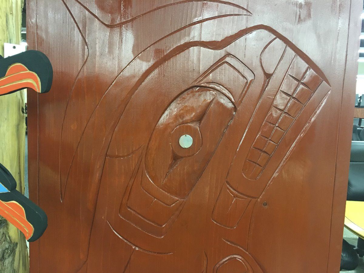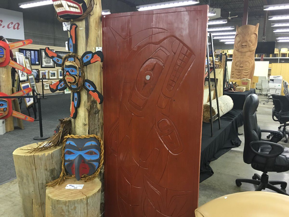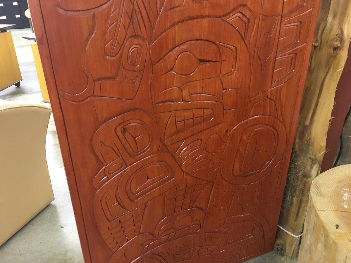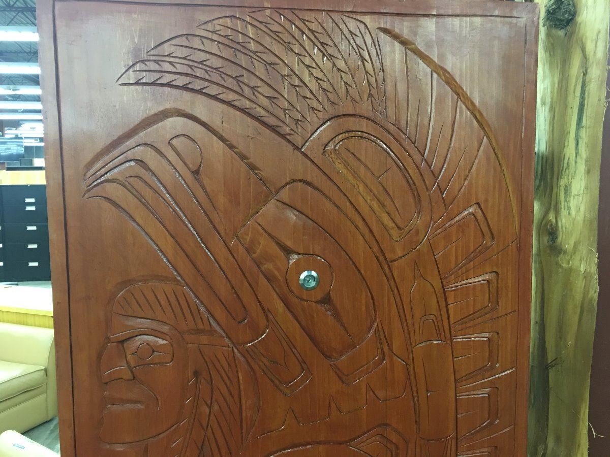 HAND CARVED EXTERIOR DOOR BY DARREN YELTON FEATURES ON THE INSIDE A KILLER WHALE & ON THE OUTSIDE A WELCOME CHIEF WITH EAGLE & BEAR. MEASURES 36"W X 80"T