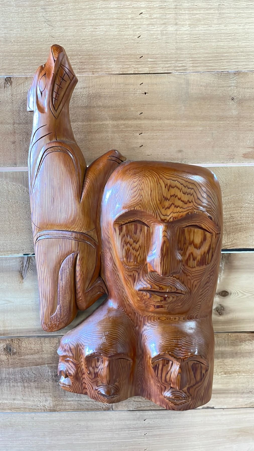 HAND CARVED FIRST NATIONS FIGURE RED CEDAR PANEL BY ROBERT REIDI 21" X 11" X 3"