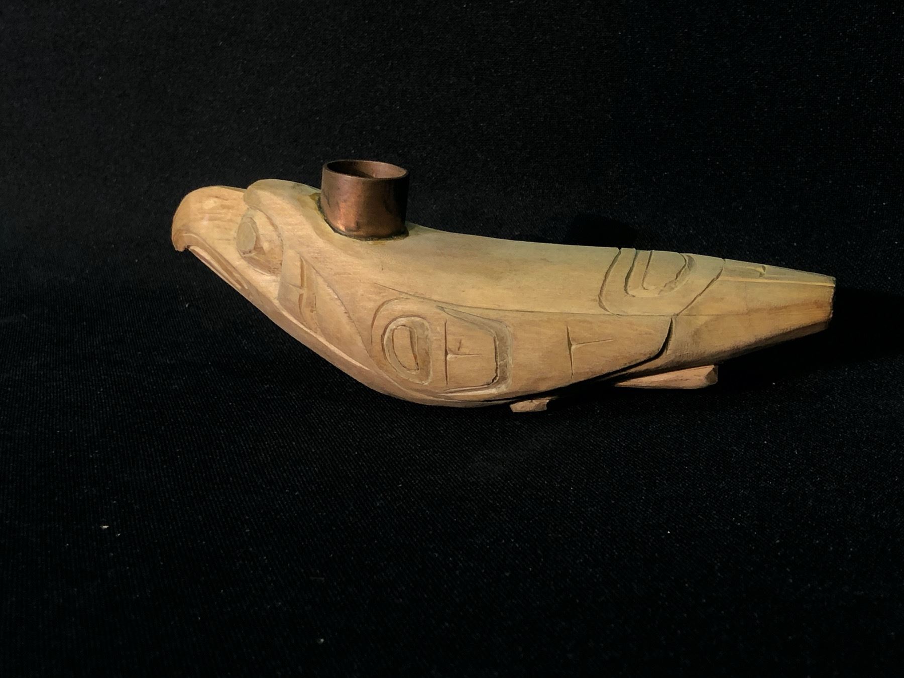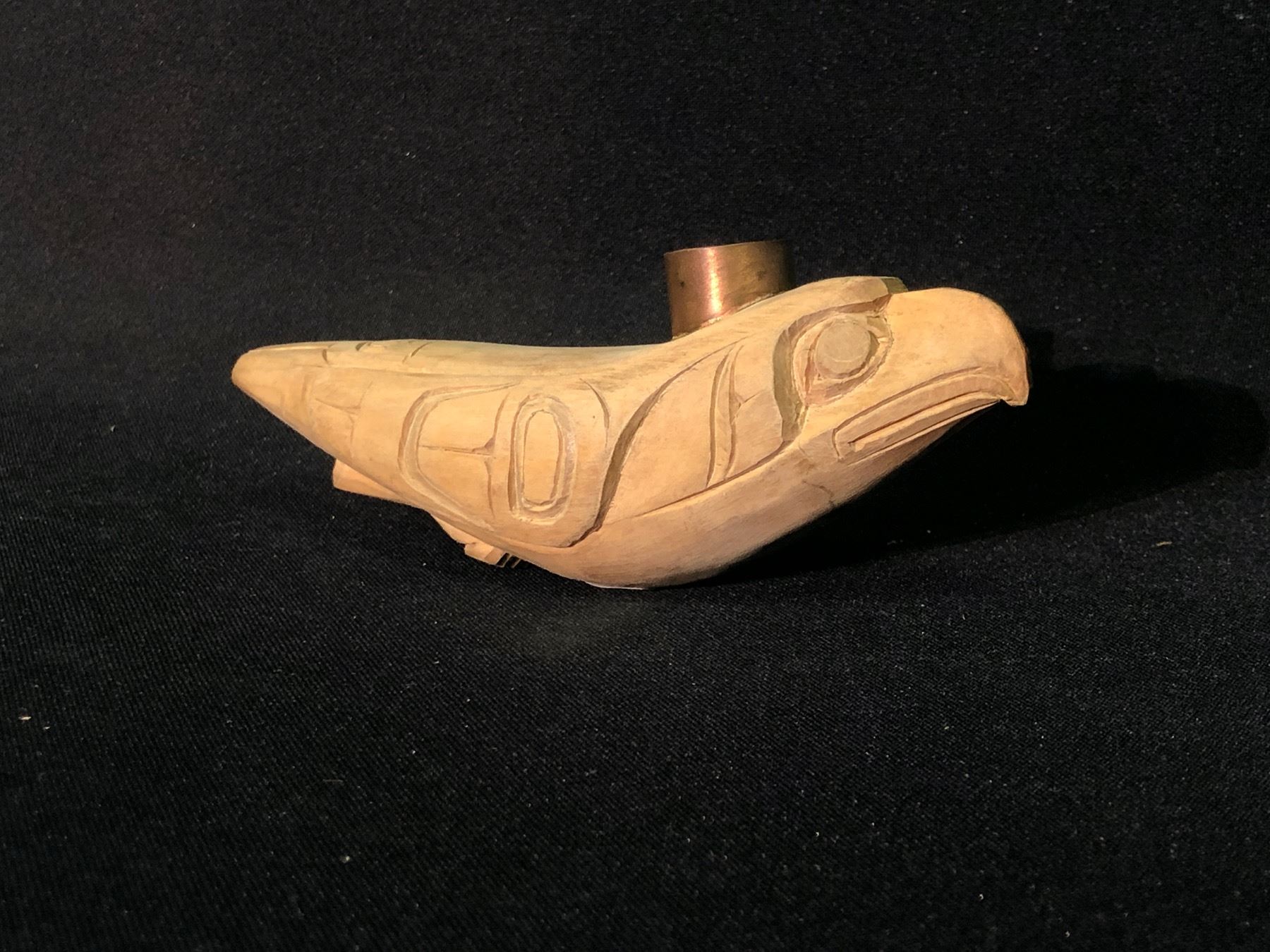 HAND CARVED FIRST NATIONS PIPE WITH COPPER FITTING AND STAND, RAVEN DESIGN, POSSIBLY FROM ALERT BAY, C. 1990S, 5.5" LONG
