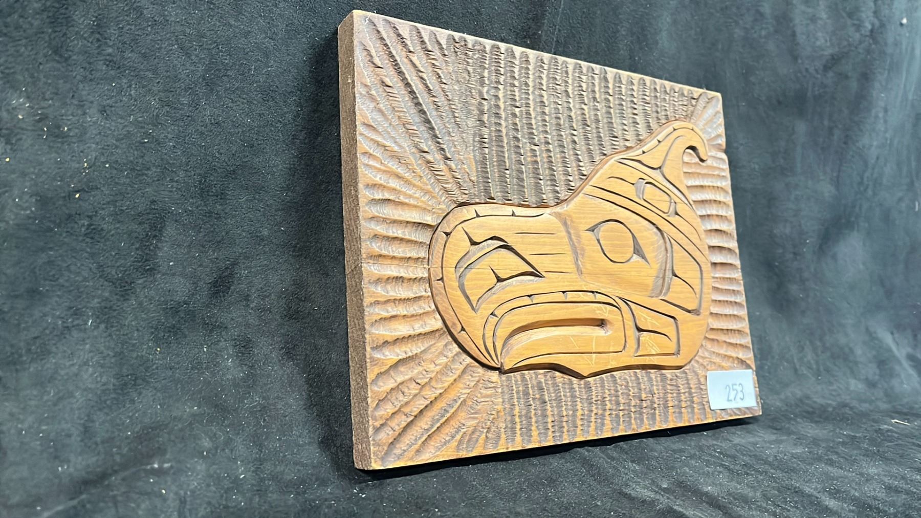 HAND CARVED FIRST NATIONS PLAQUE BY JIM MOUNTAIN 9" X 7"
