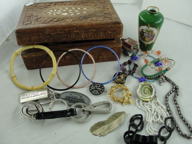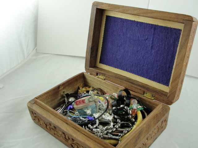 HAND CARVED WOOD JEWELLERY BOX FILLED WITH CONTENTS