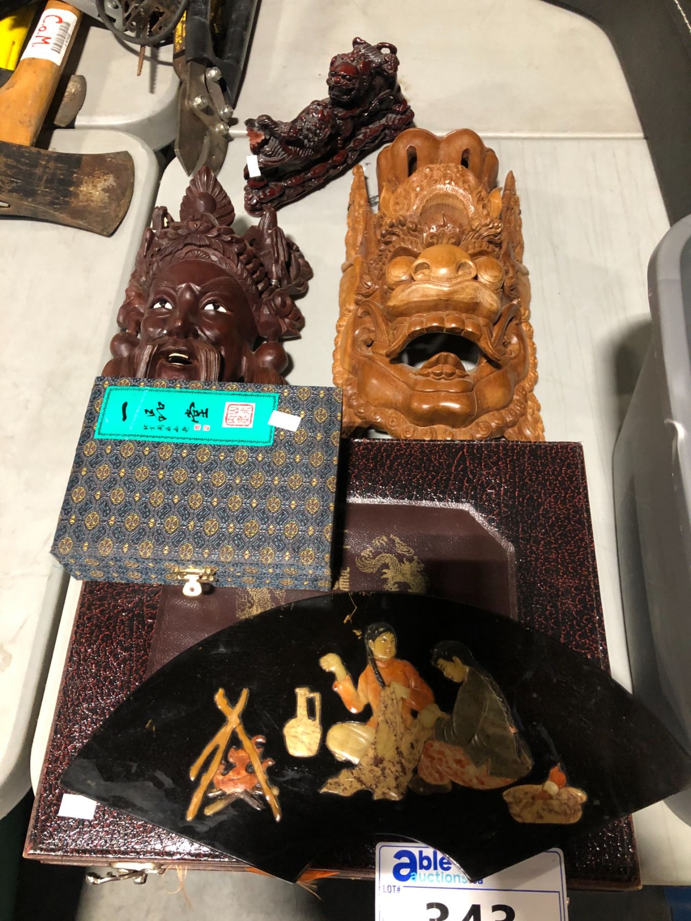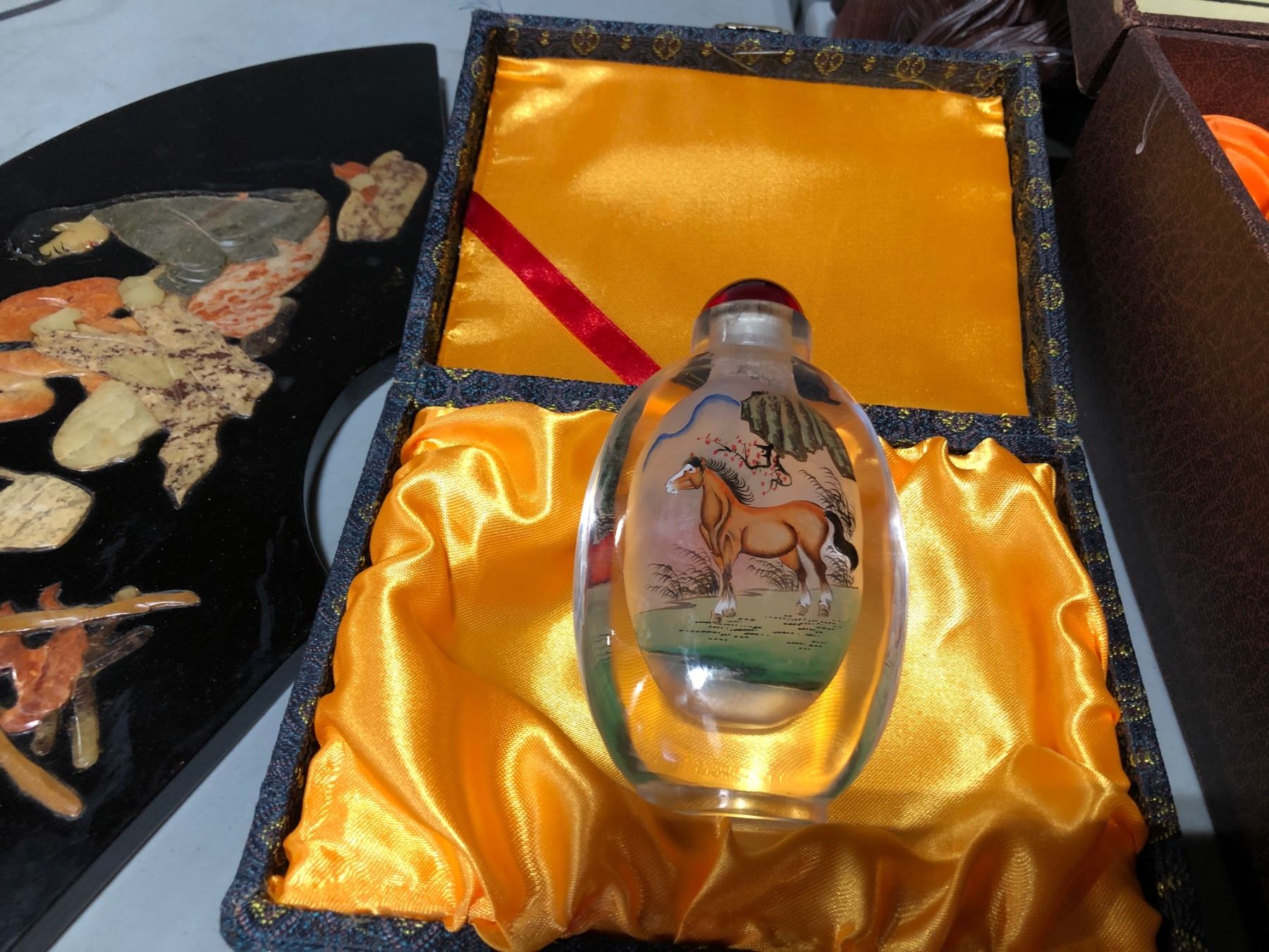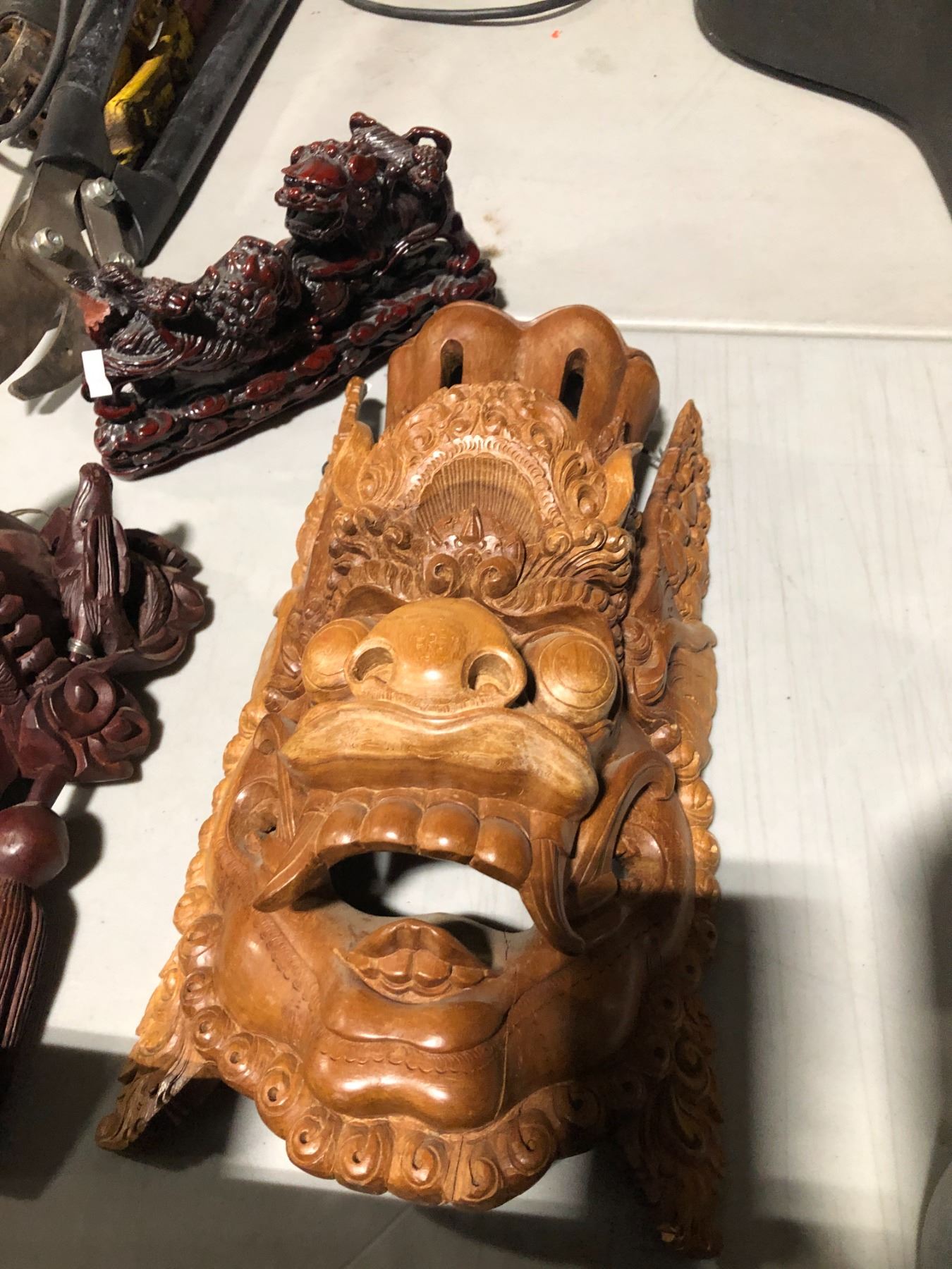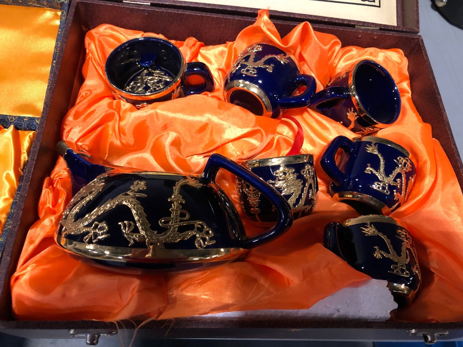 HAND CARVED WOODEN DRAGON, CHINESE TEA SET IN THE CASE AND FULONG MARK HAND CARVED DRAGONS WITH BROKEN TAIL, SNUFF BOTTLE IN CASE