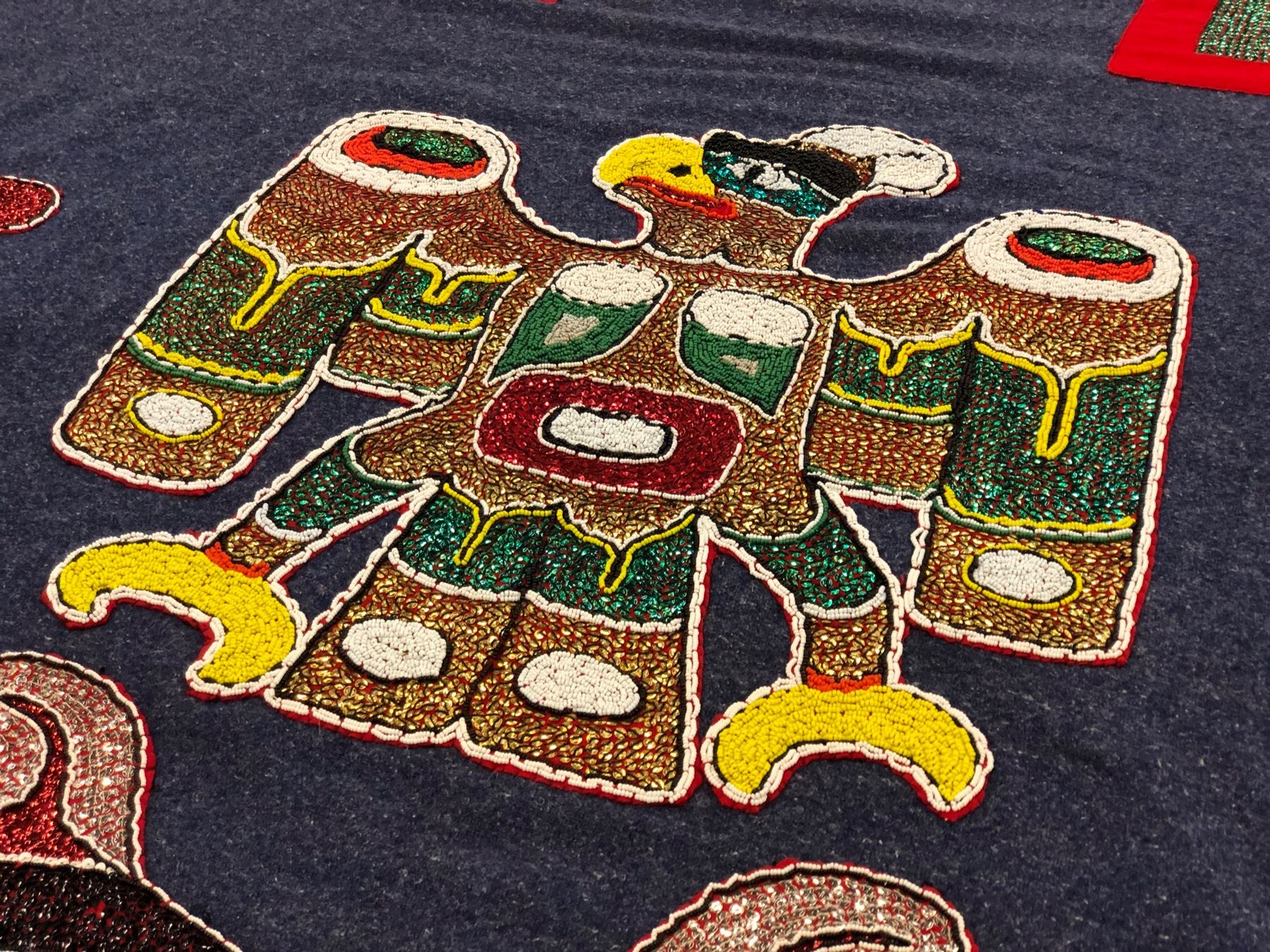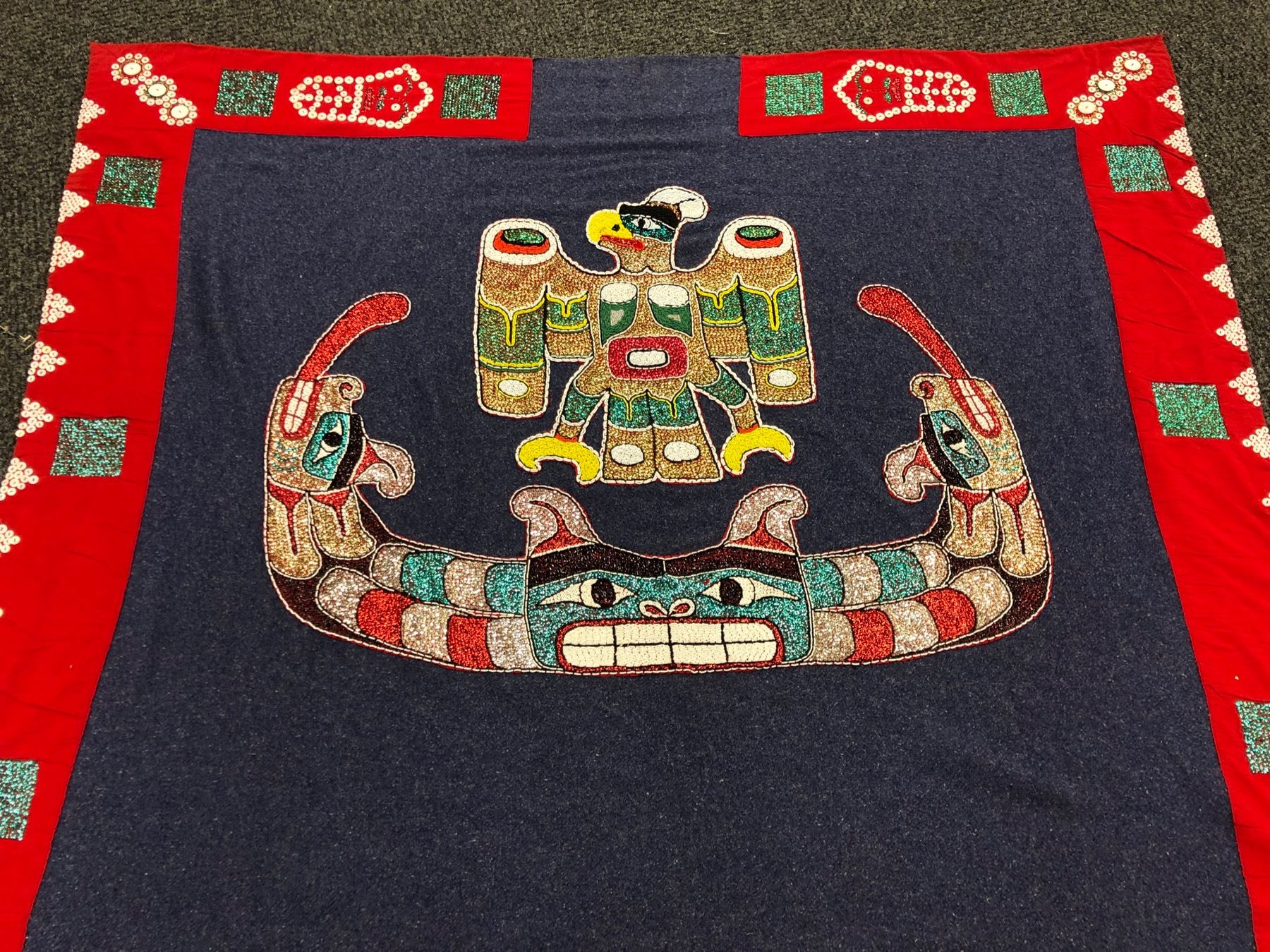 HAND CRAFTED FIRST NATIONS BLANKET WITH BALD EAGLE AND SERPENT DESIGNS, ABALONE BUTTONS, APPROX. 6' X 5', THIS BLANKET CAME FROM THE ESTATE OF A SUPREME COURT JUSTICE ON VANCOUVER, FOR WHOM THE BLANKET WAS ORIGINALLY MADE FOR