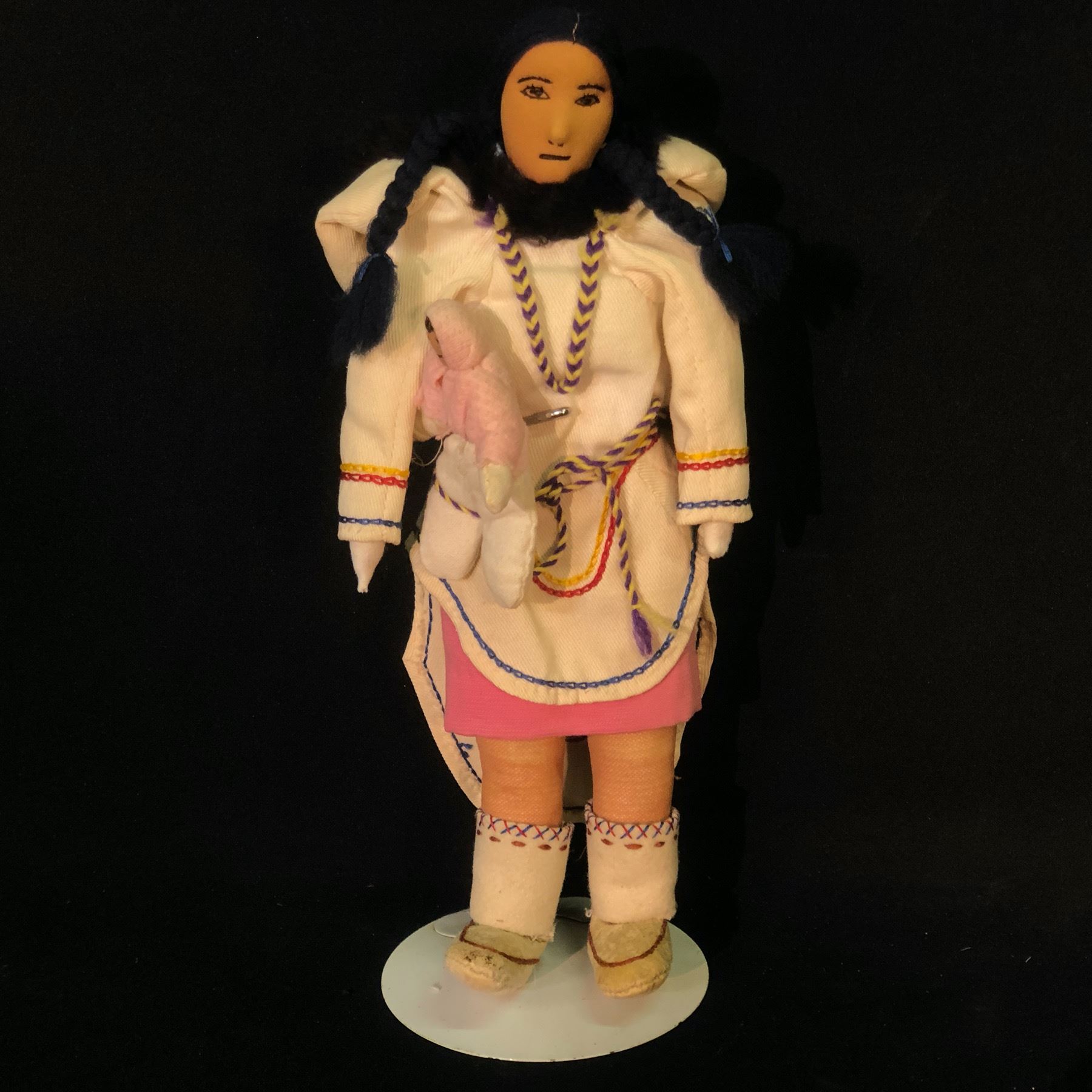 HAND MADE INUIT DOLL WITH CHILD ON STAND, 13" TALL INC. STAND