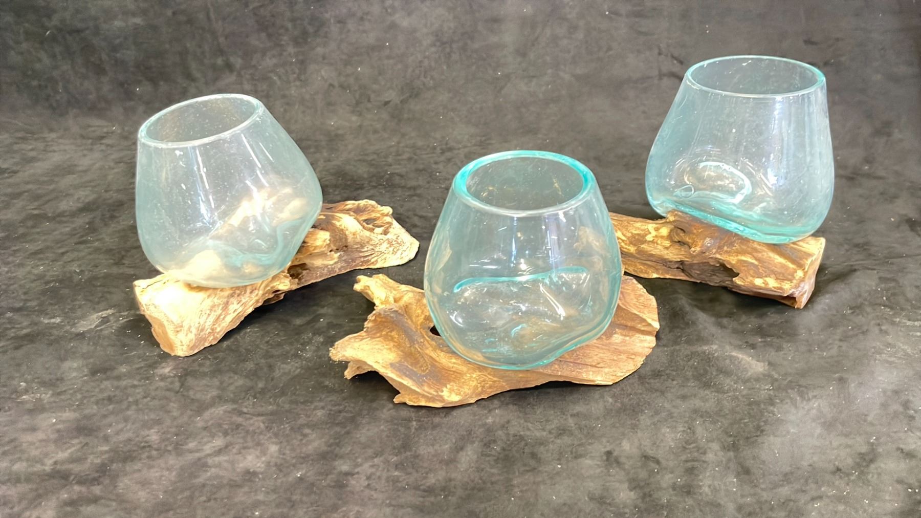 HAND MADE MOLTEN GLASS BOWLS ON TEAK BASES