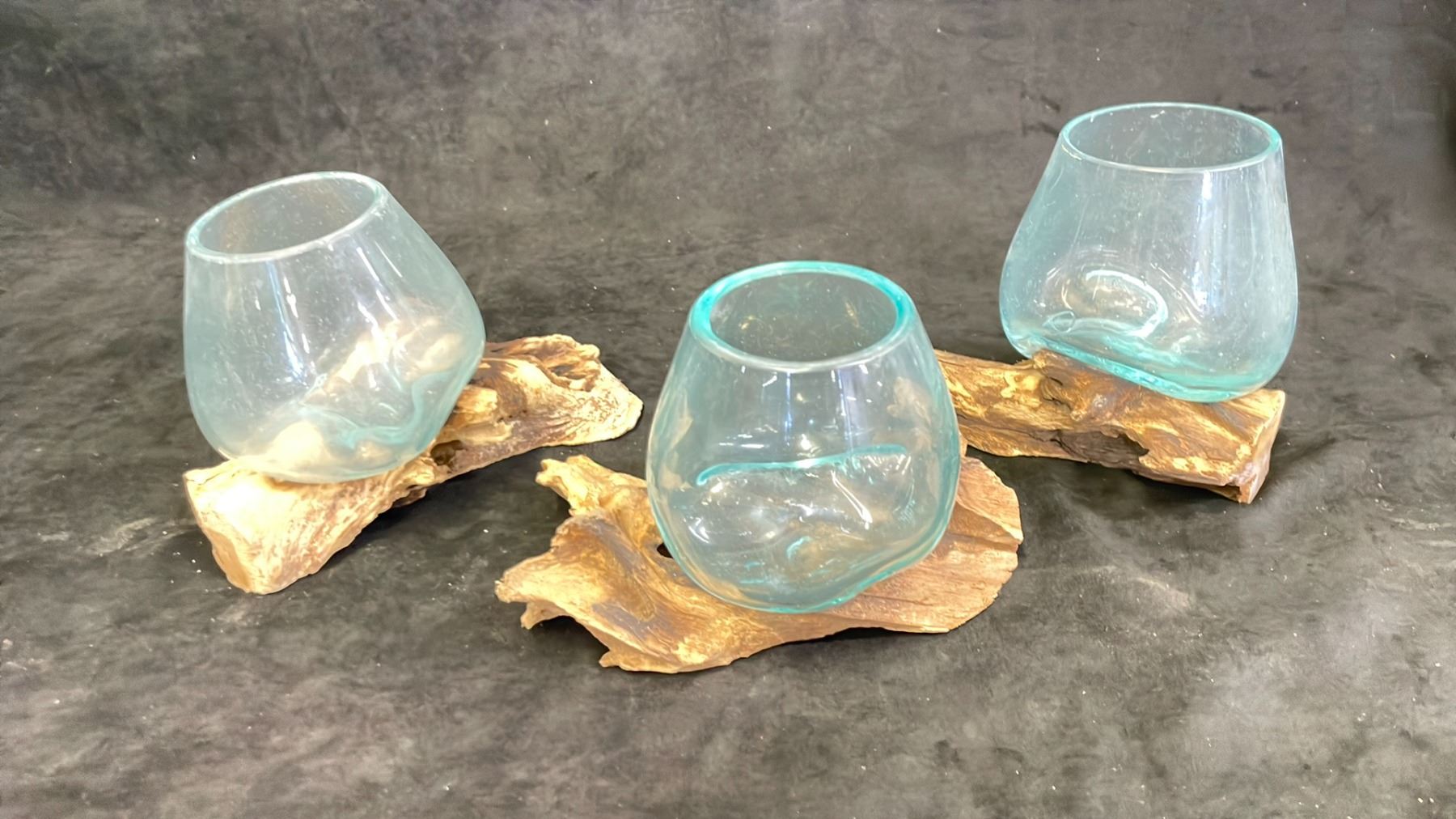 HAND MADE MOLTEN GLASS BOWLS ON TEAK BASES