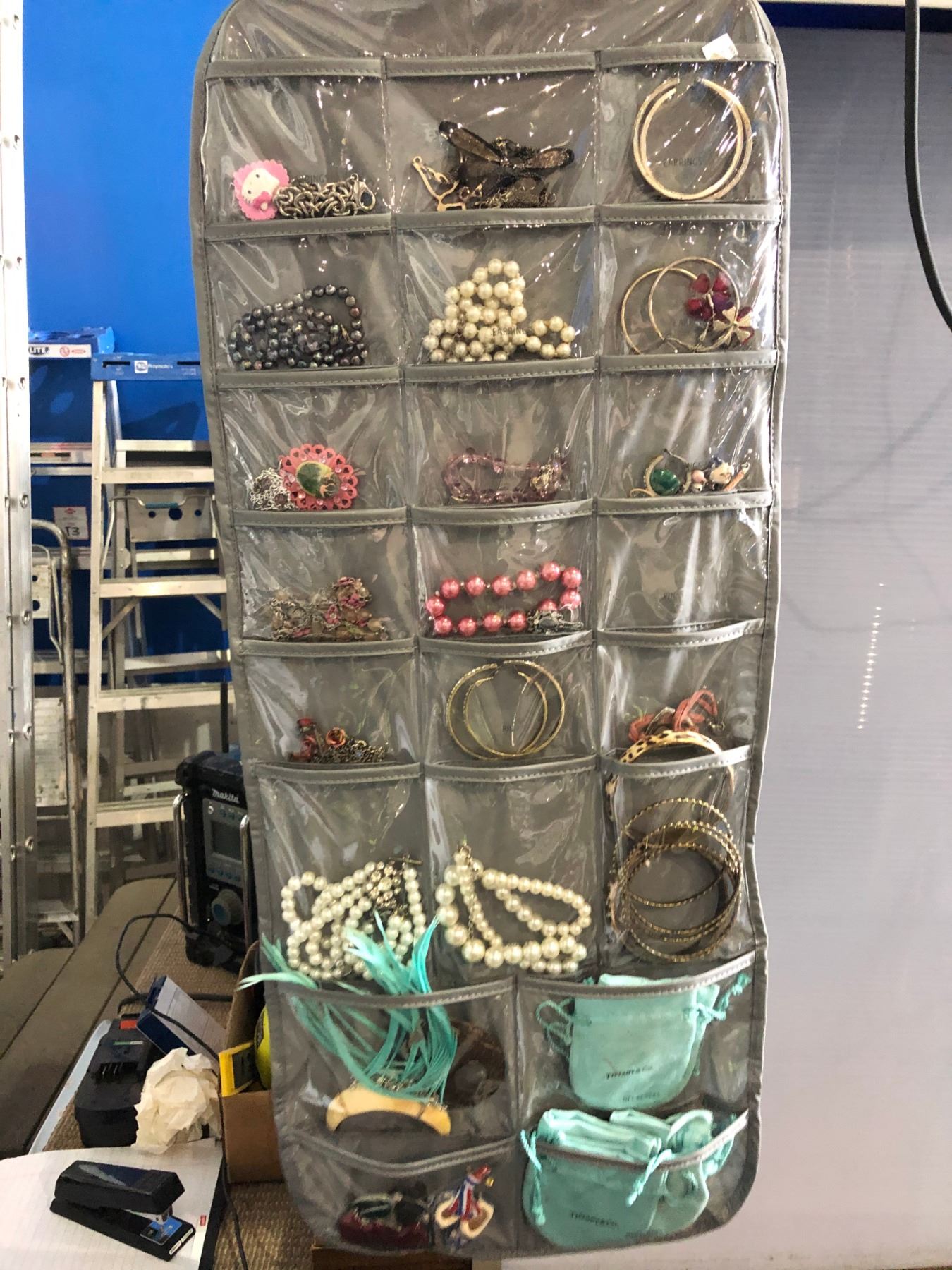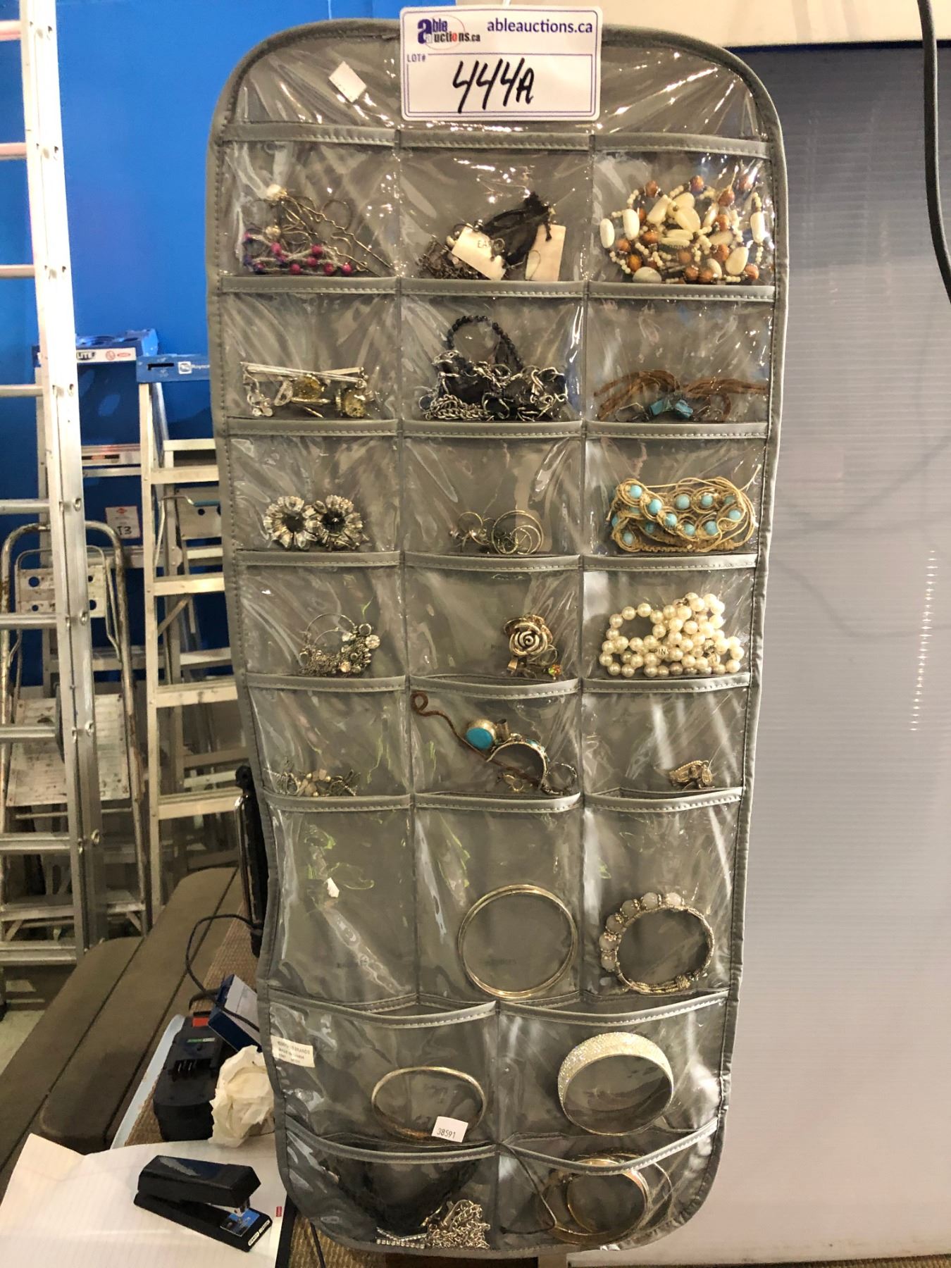 HANGING JEWELRY ORGANIZER WITH CONTENTS, SILVER AND COSTUME JEWELRY