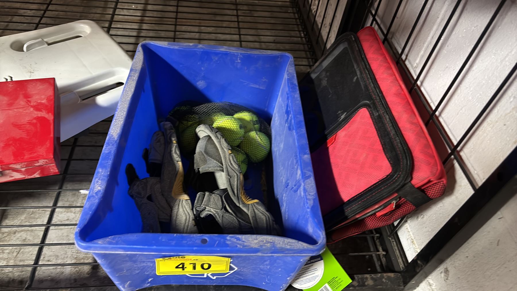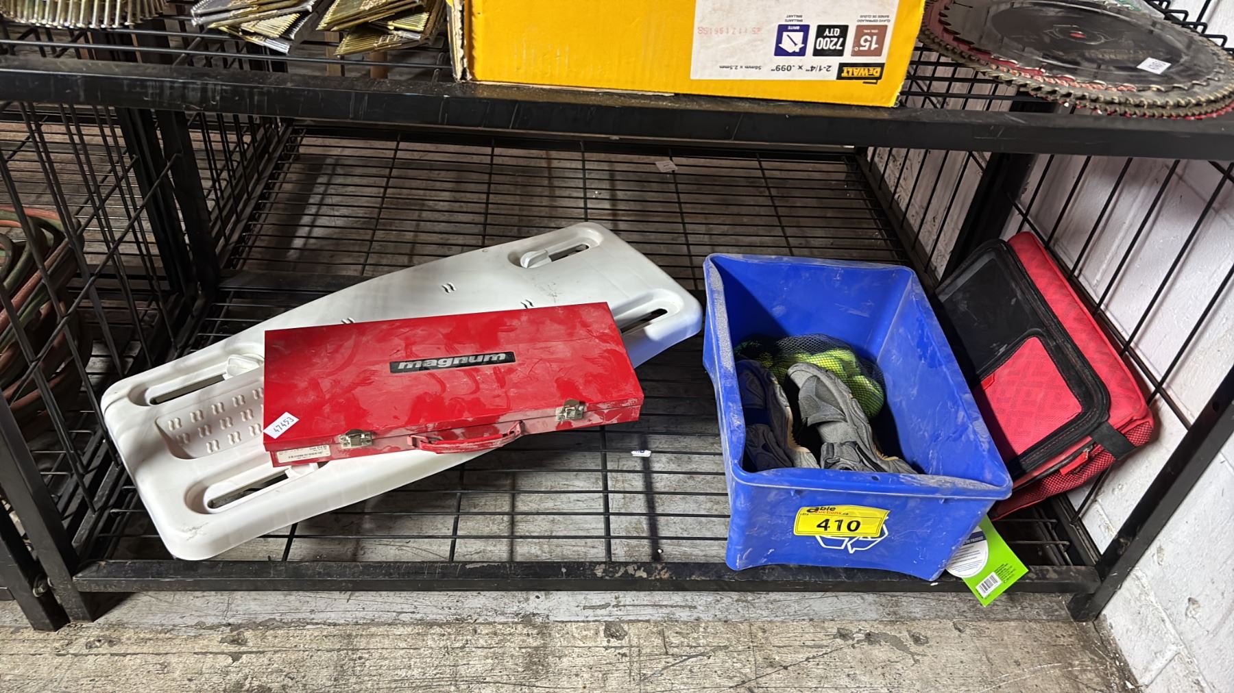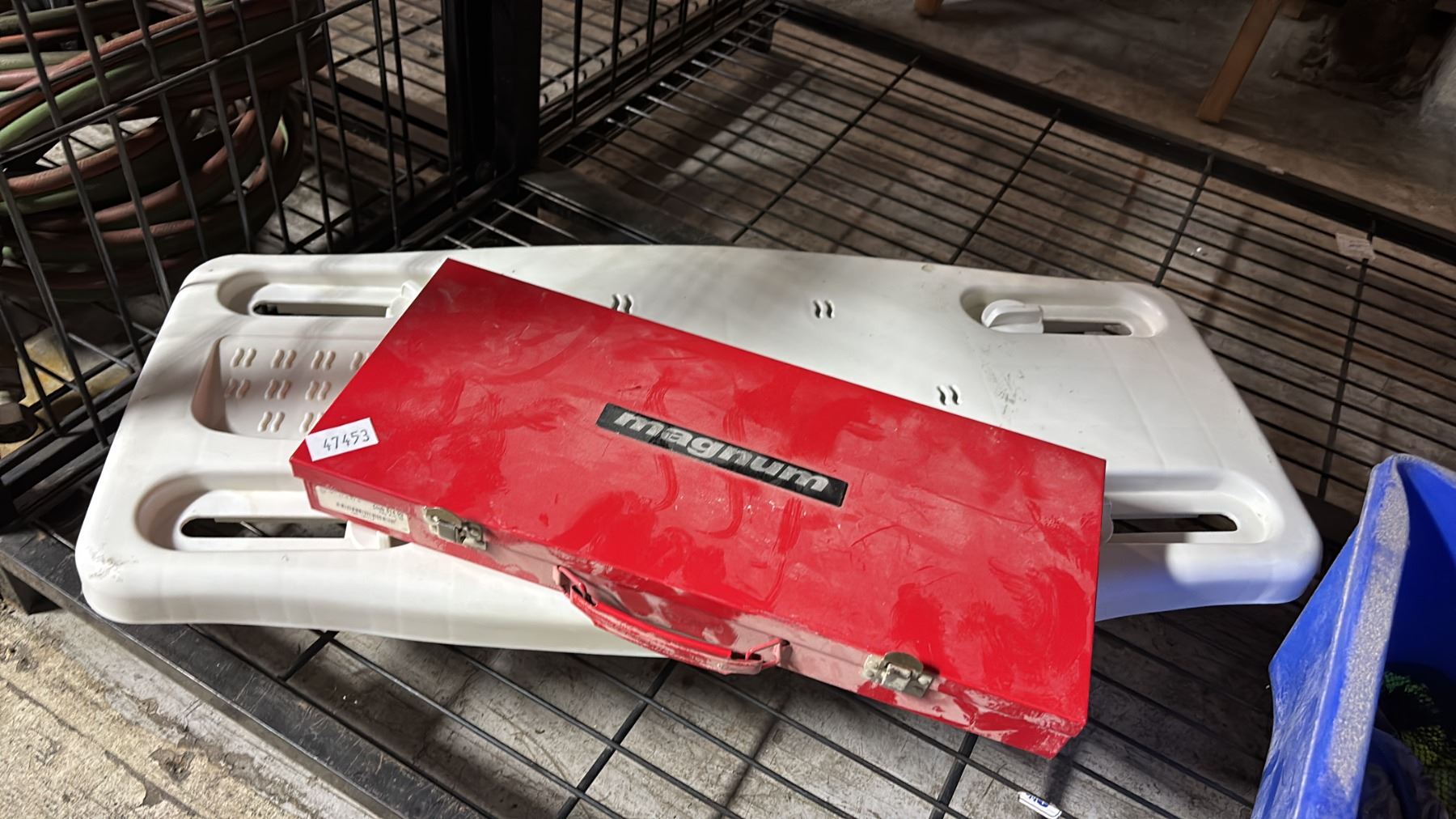 HARD TOP COOLER, CAREX TUB BENCH, MAGNUM TOOL BOX (EMPTY) & SMALL TOTE OF SANDALS & TENNIS BALLS