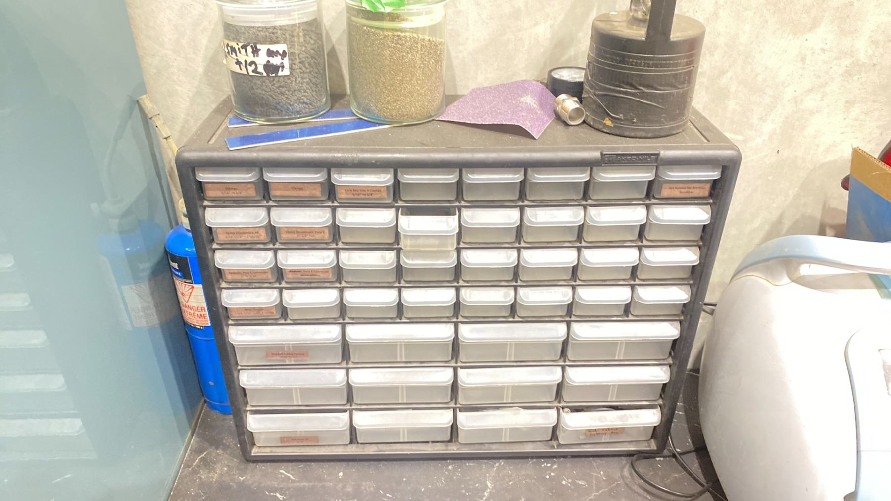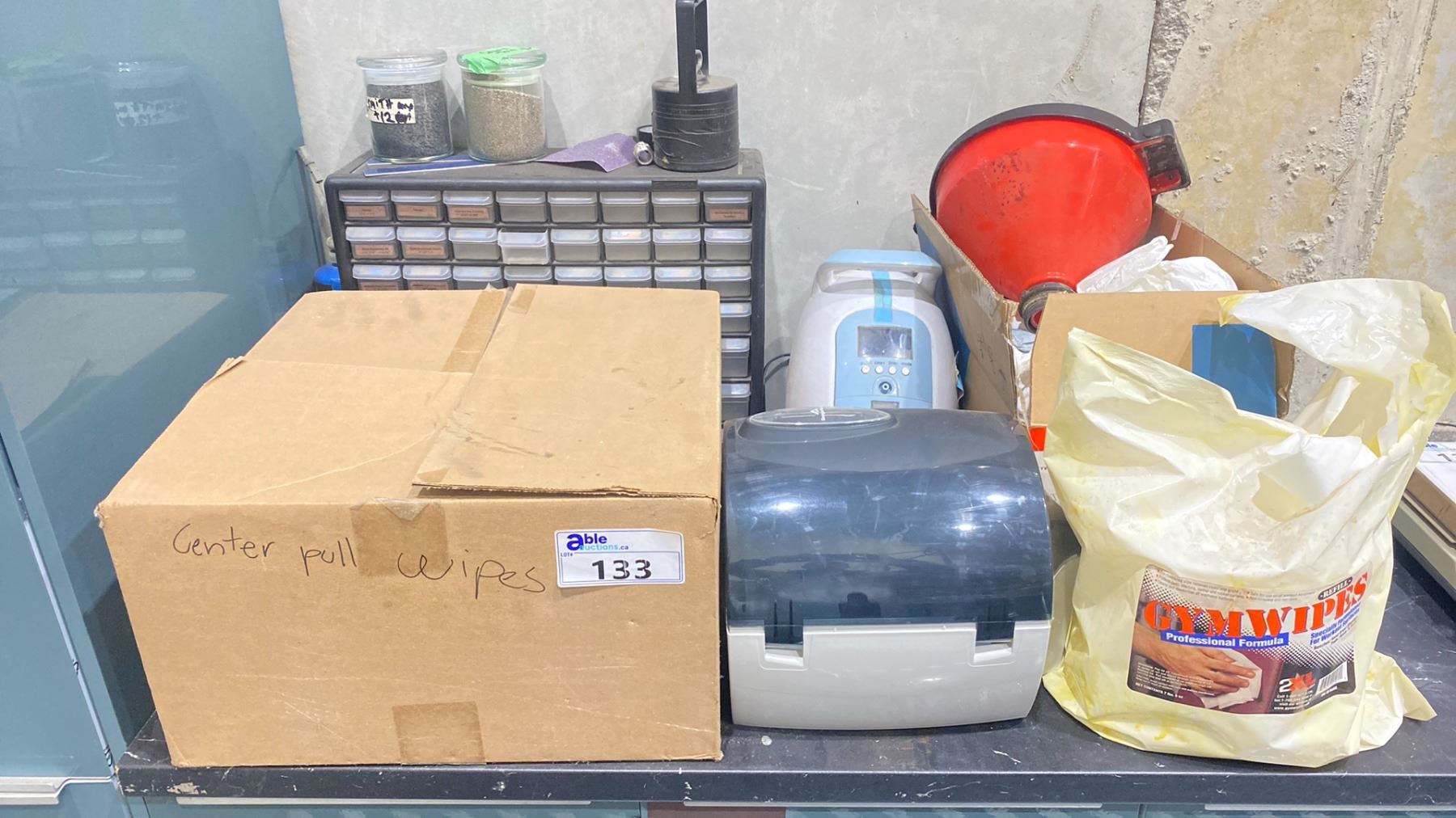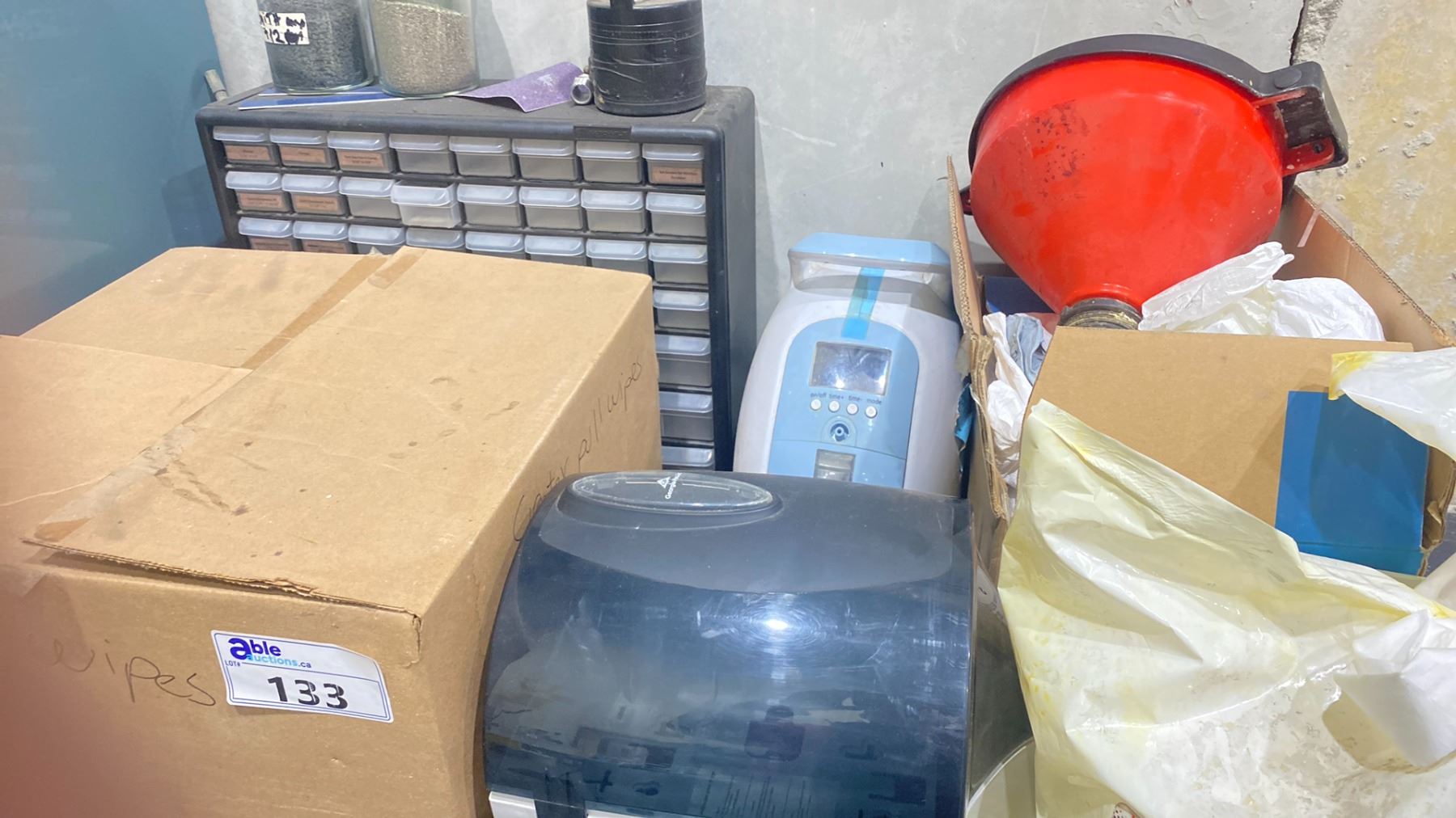 HARDWARE SORTER, BOX OF GYM WIPES, PAPER TOWEL DISPENSER, HANDLE OXYGEN CONCENTRATOR & A BOX OF