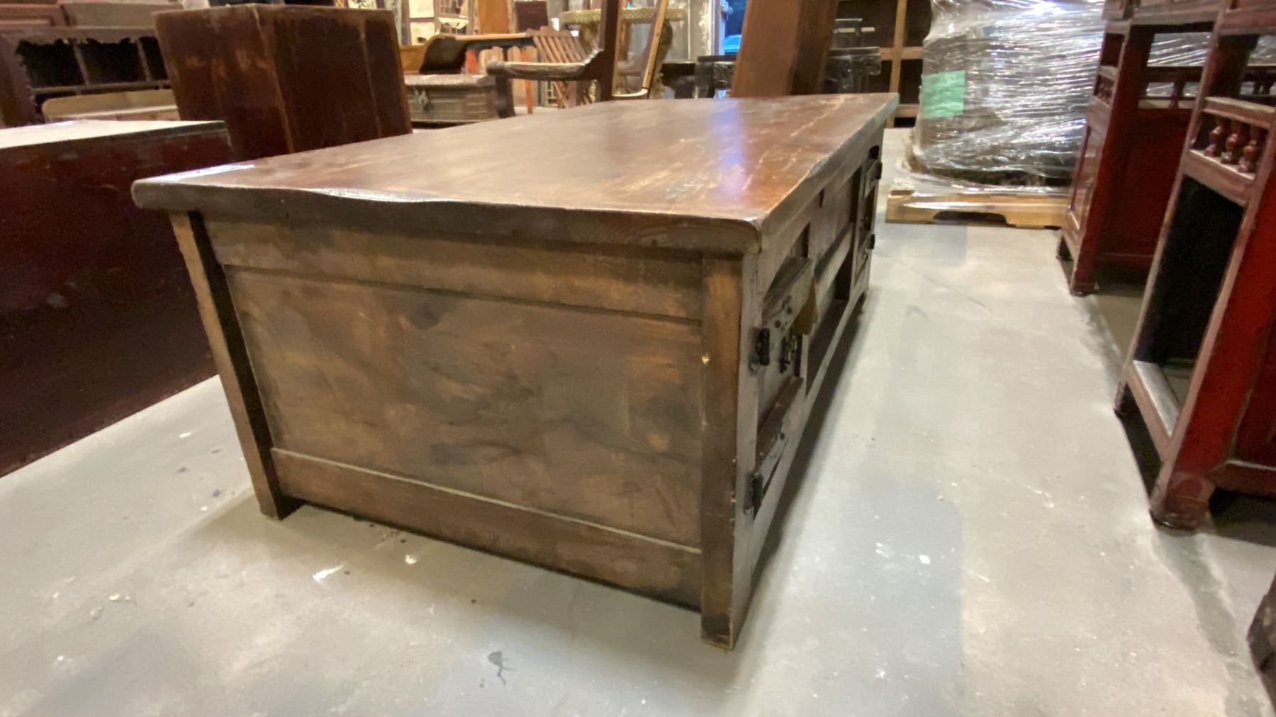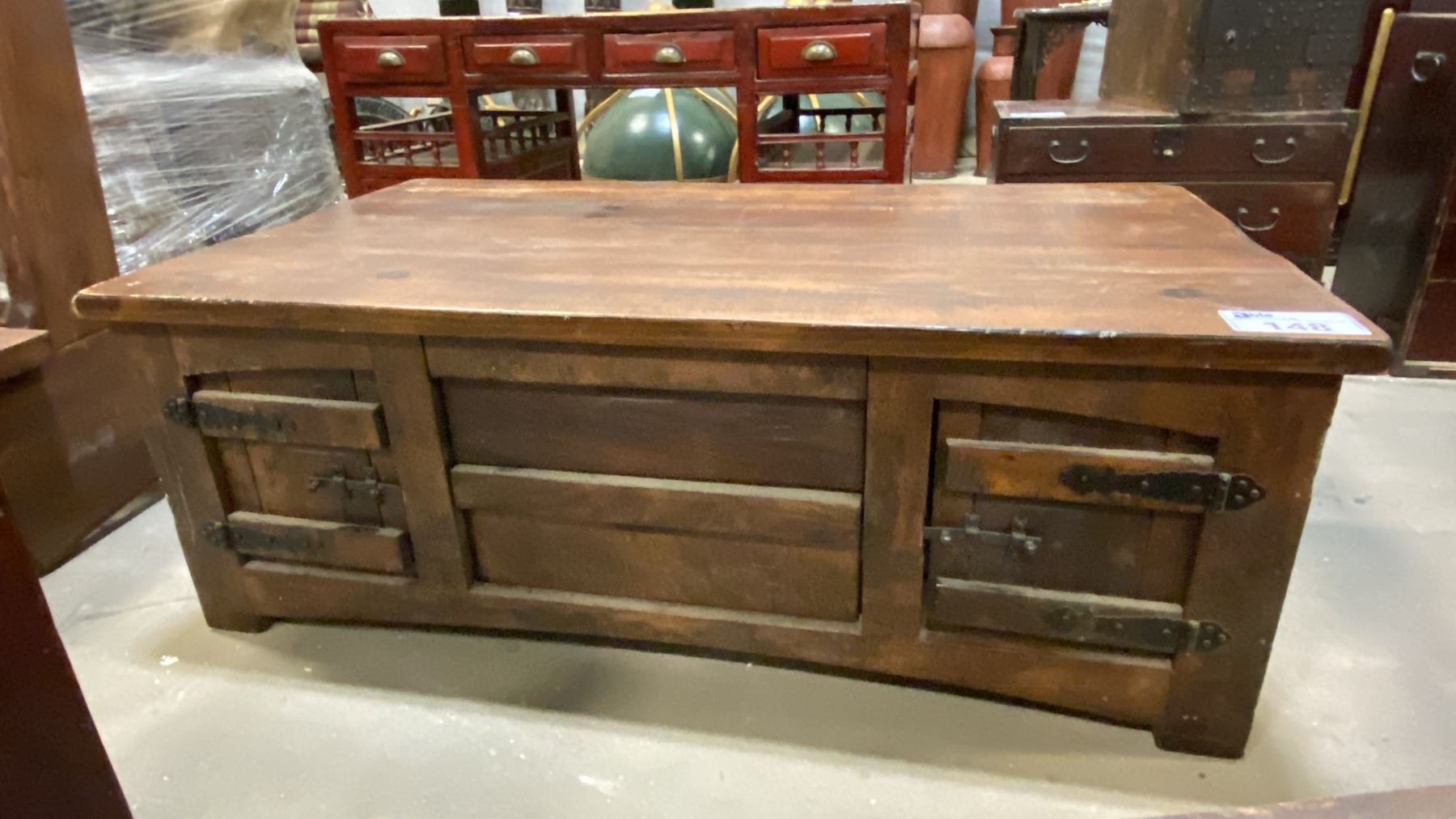HARDWOOD WITH METAL ACCENTS RUSTIC COFFEE TABLE WITH DRAWERS & CUPBOARDS ON BOTH SIDES