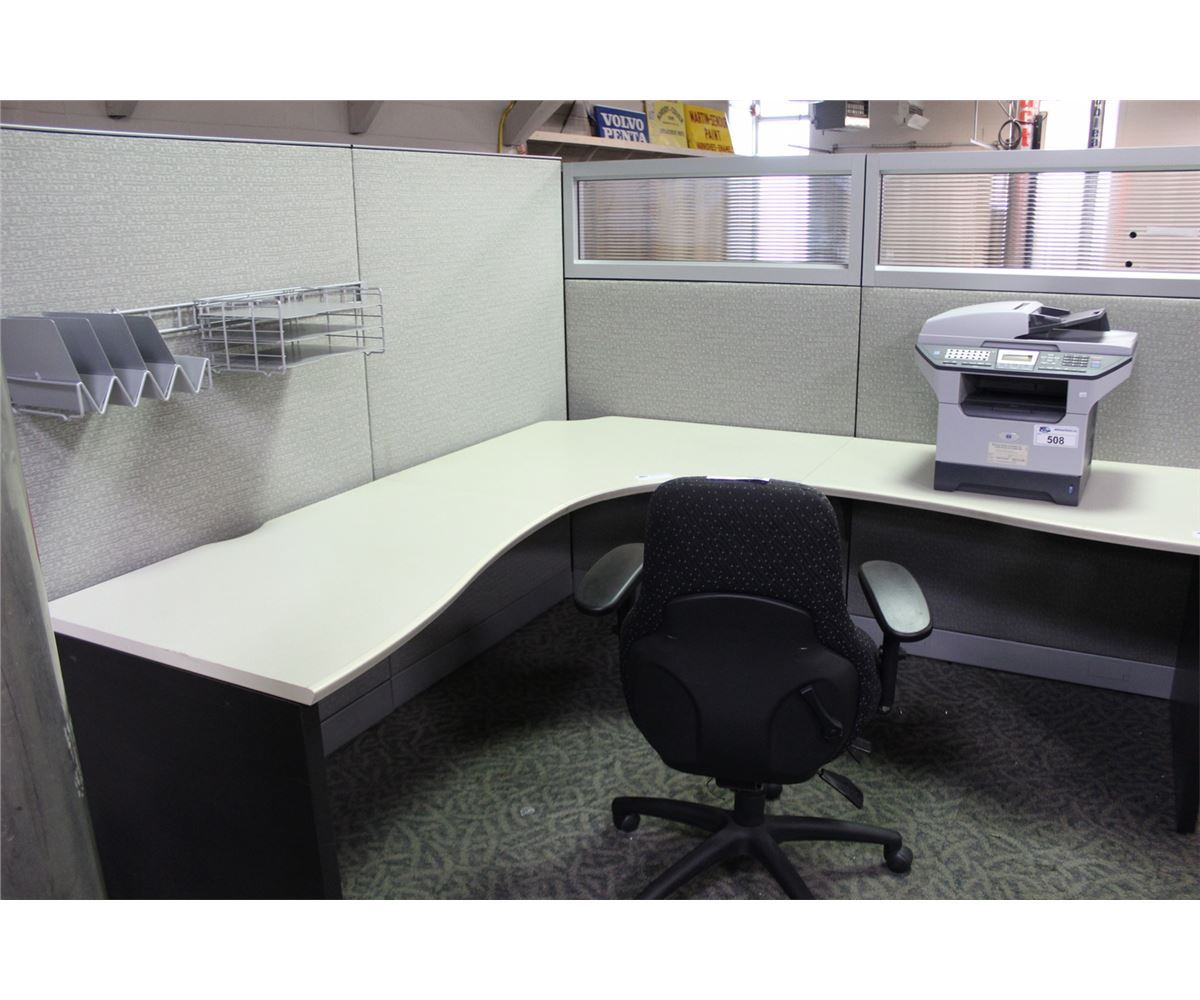 HAWORTH PREMISE ENHANCED 7' X 7' CORNER WORKSTATION, C/W PARTIAL GLAZED PANELING AND RAIL
