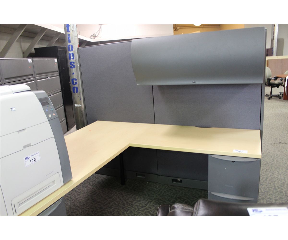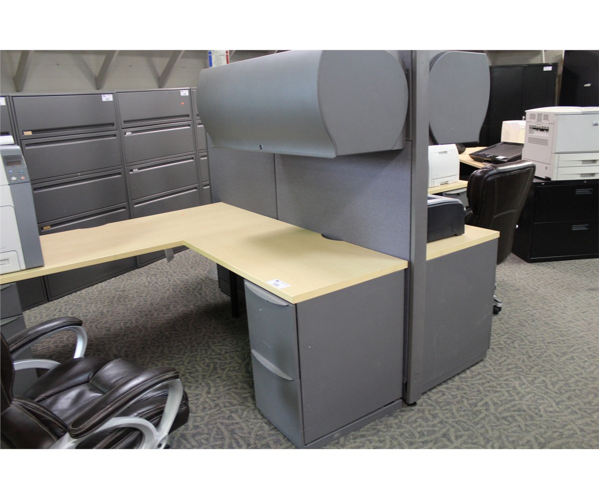 HAWORTH PREMISE MAPLE AND GREY 2 PERSON WORK STATION C/W OVERHEAD STORAGE BINS