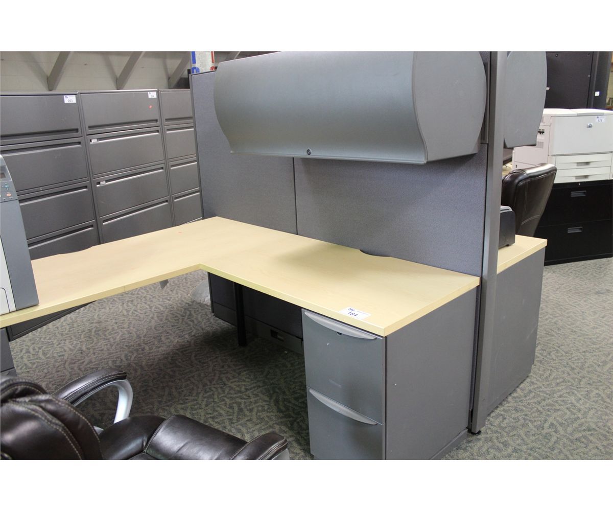 HAWORTH PREMISE MAPLE AND GREY 2 PERSON WORK STATION C/W OVERHEAD STORAGE BINS