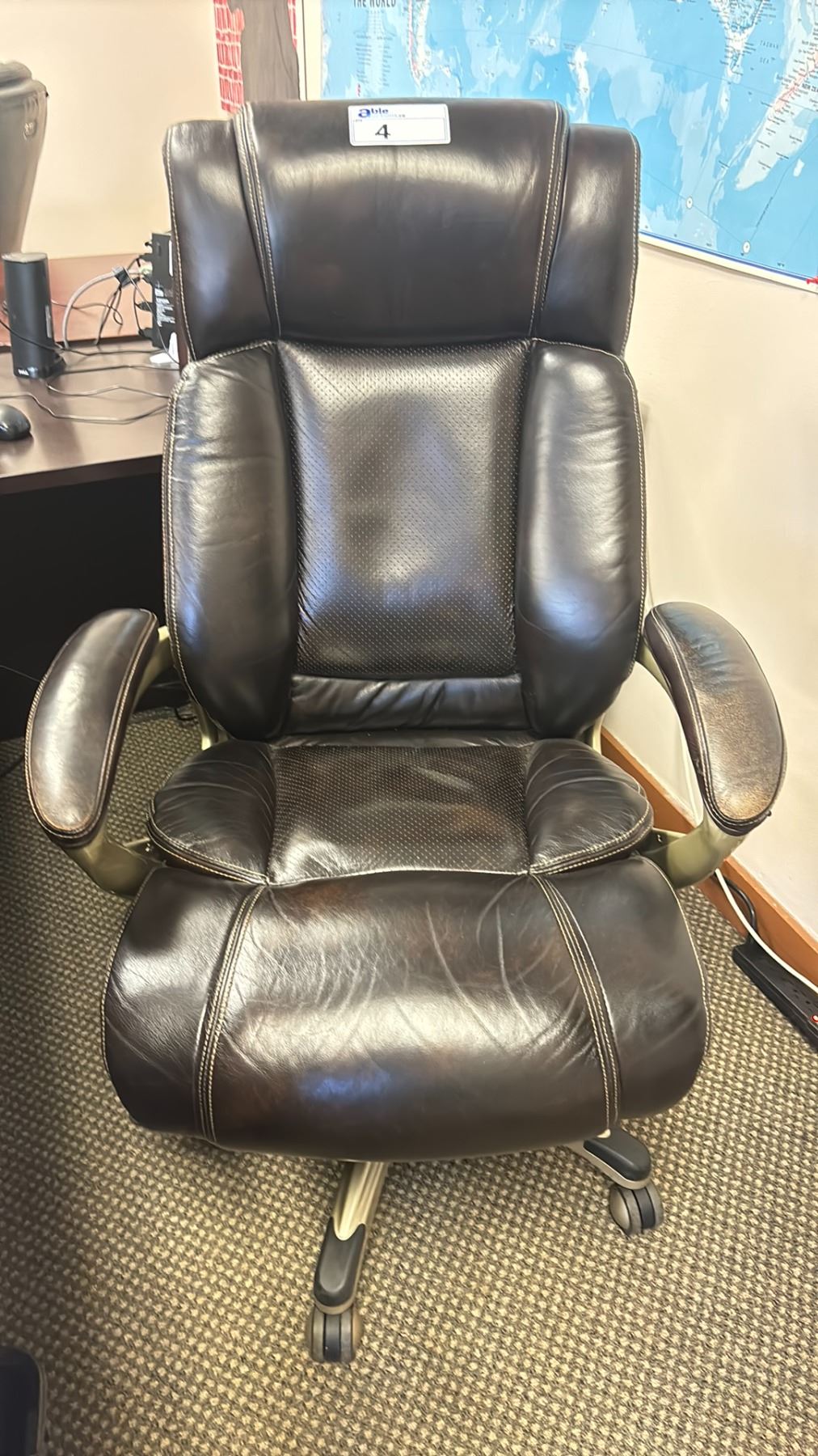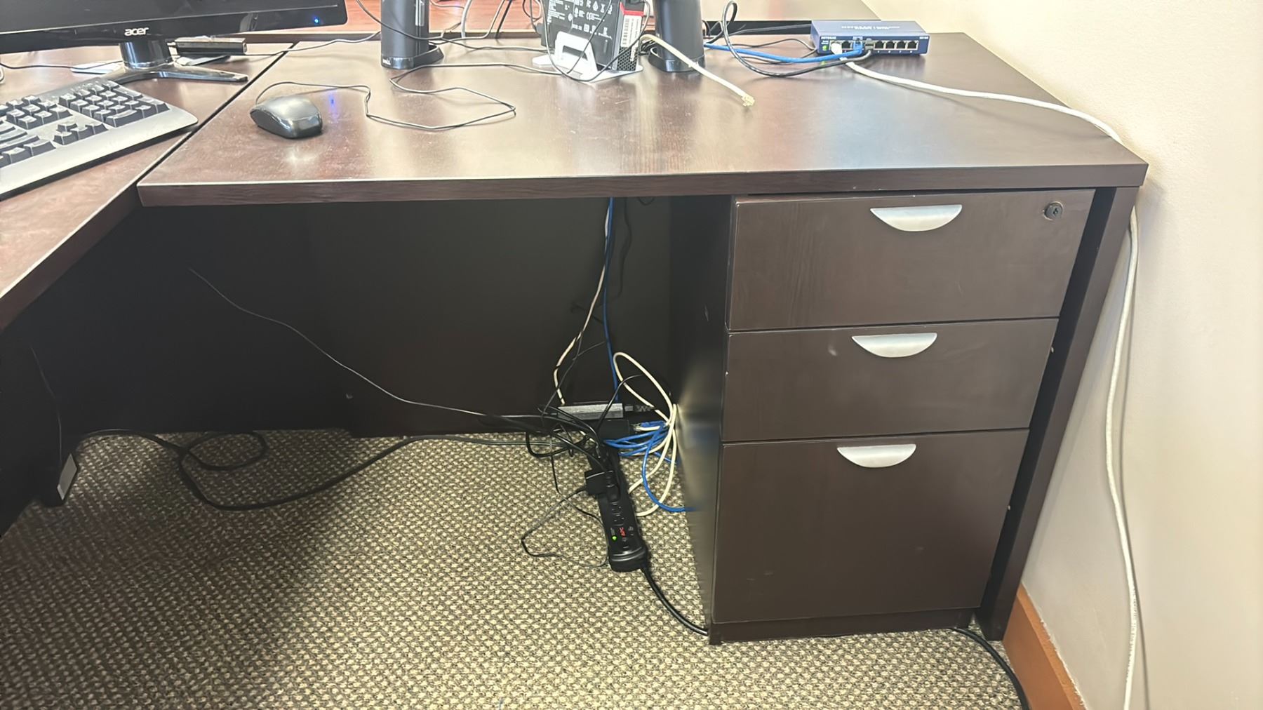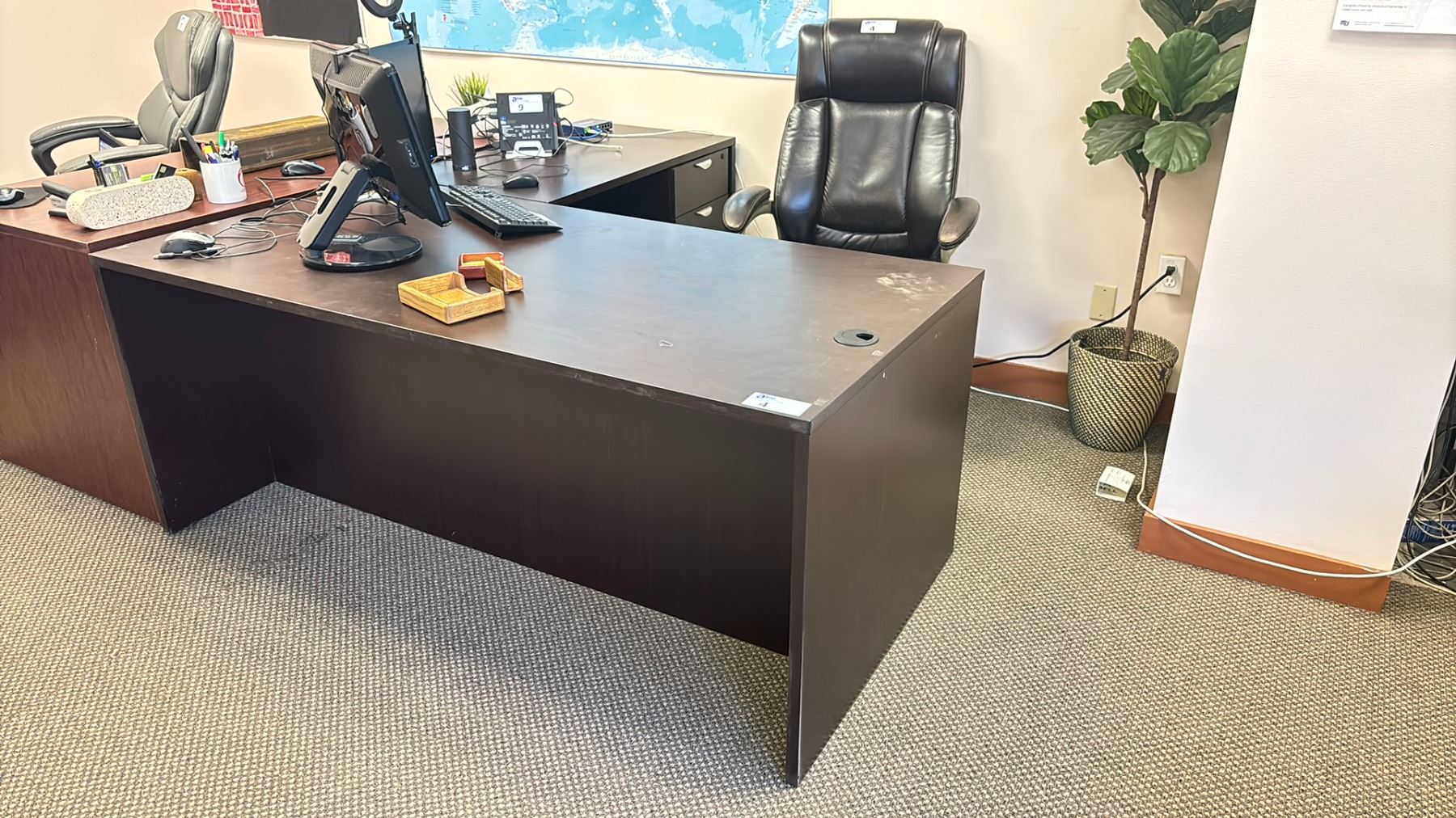 HEARTWOOD DARK WOOD L-SHAPED EXECUTIVE DESK WITH BLACK LEATHER HIBACK CHAIR