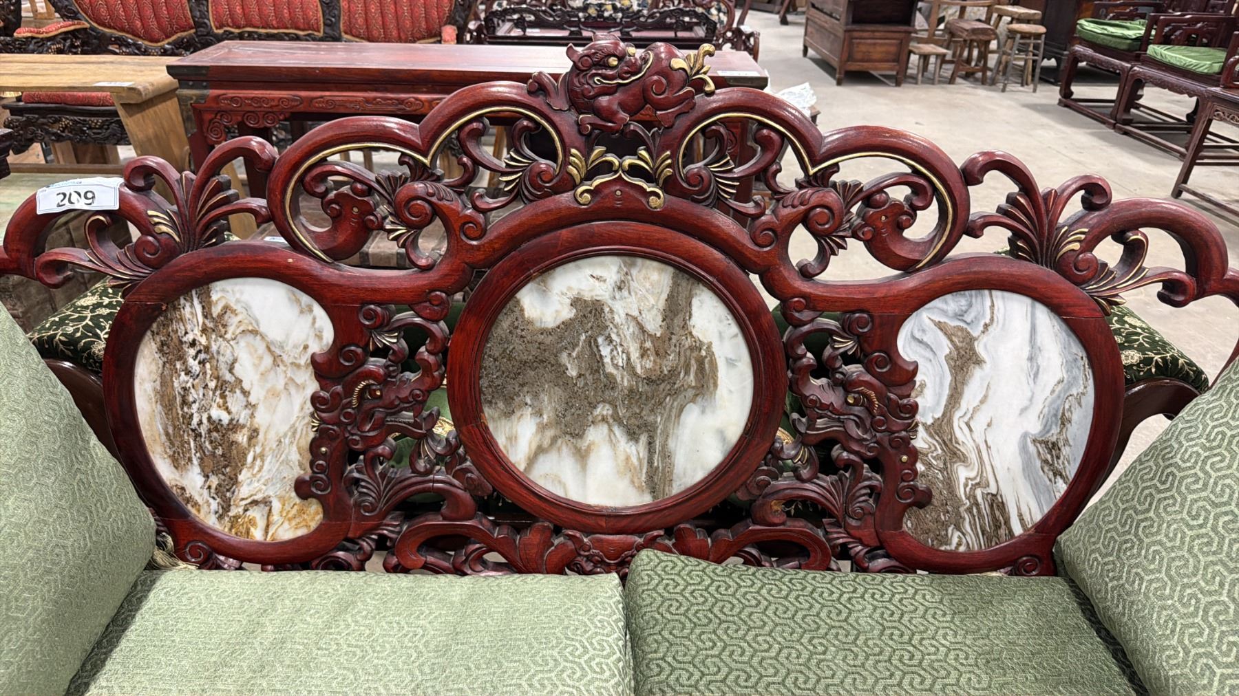 HEAVILY CARVED ASIAN BENCH WITH MARBLE INSERTS & DRAGON MOTIF