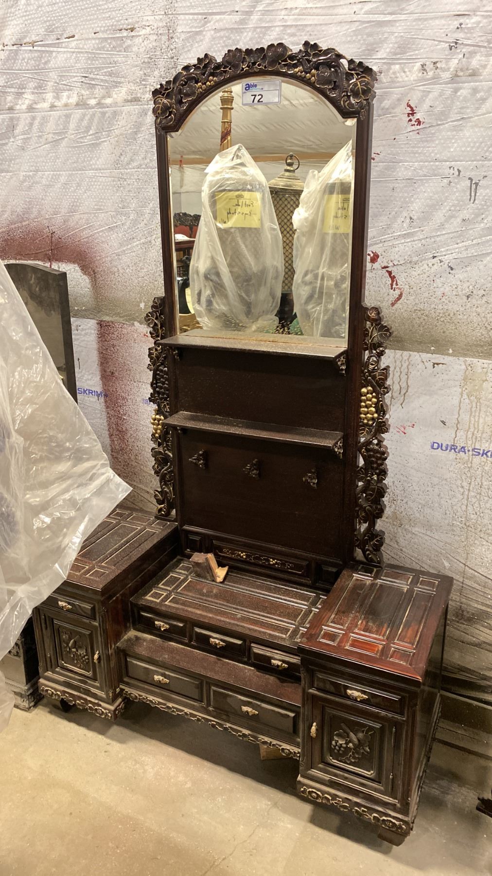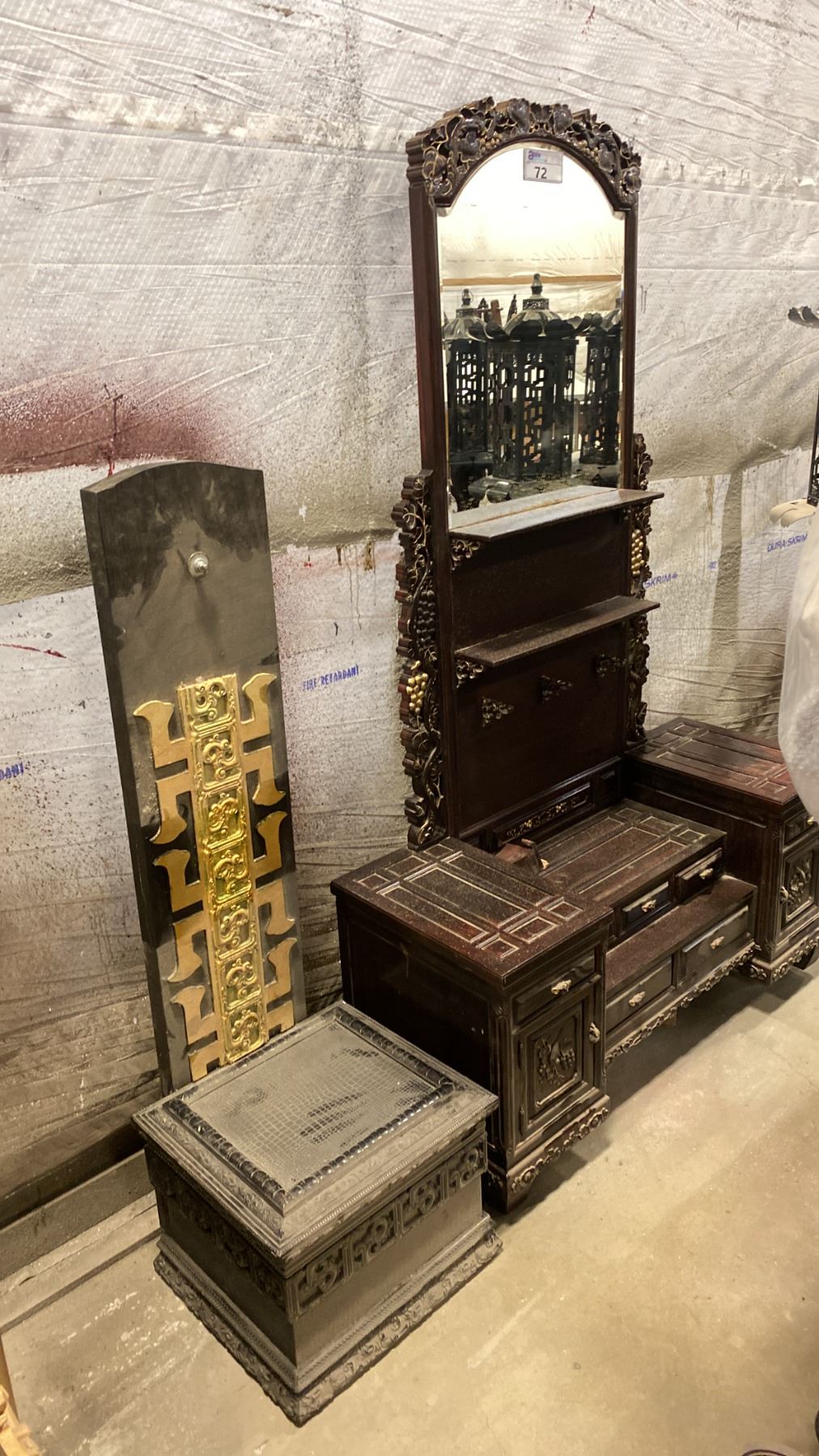 HEAVILY CARVED ASIAN VANITY DRESSER * 1 LEG NEEDS REPAIR* & PRAYER STAND