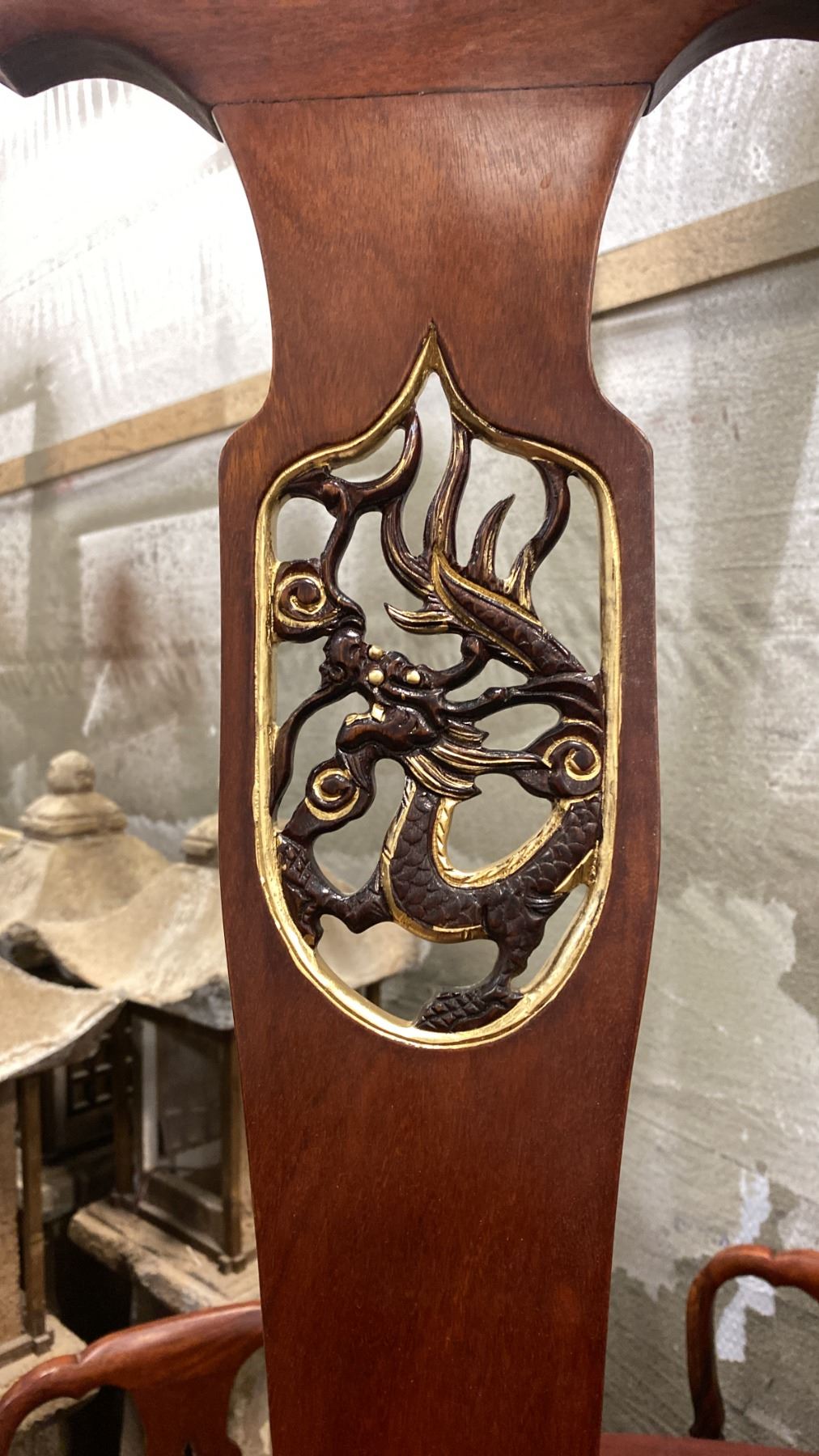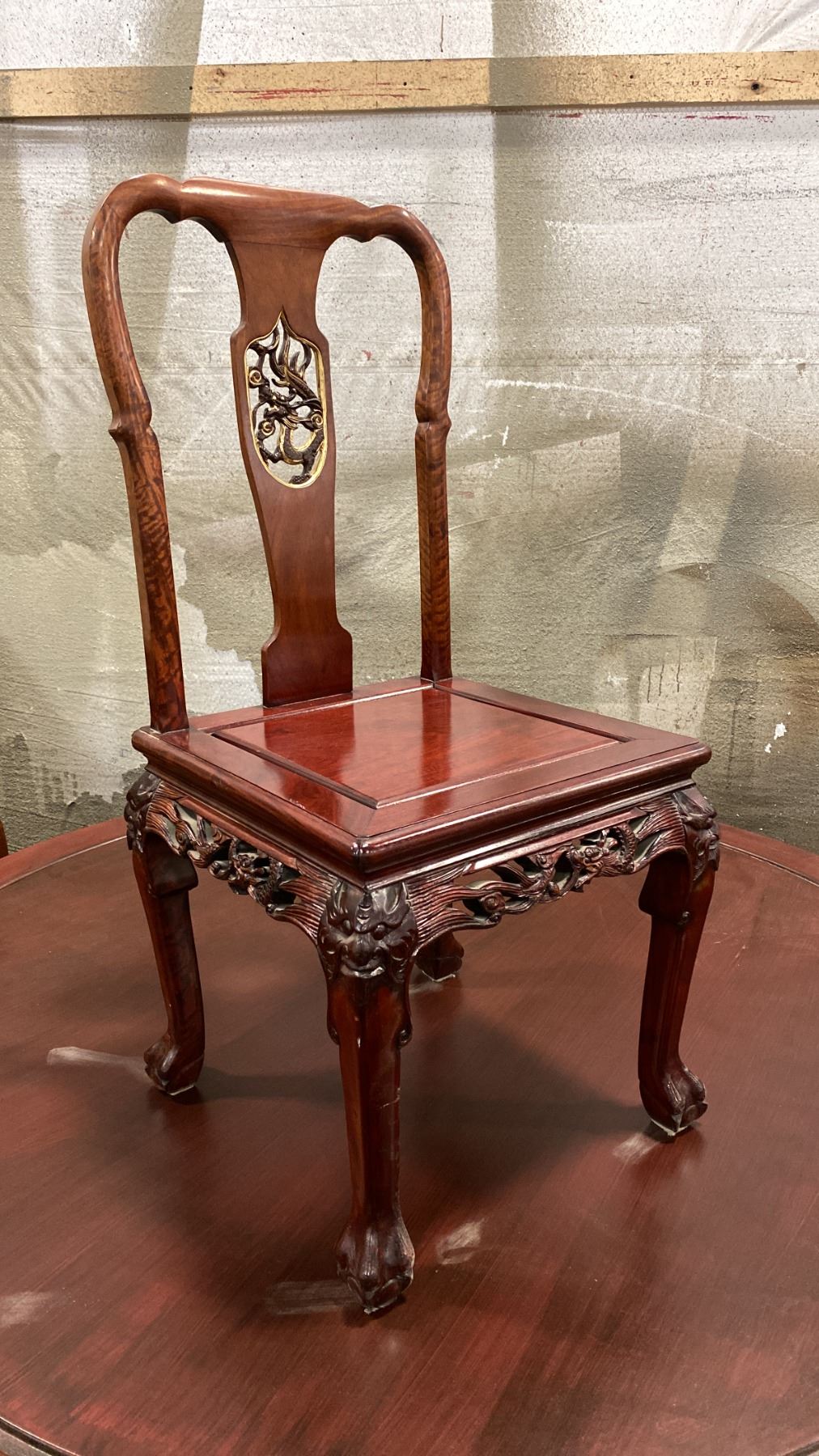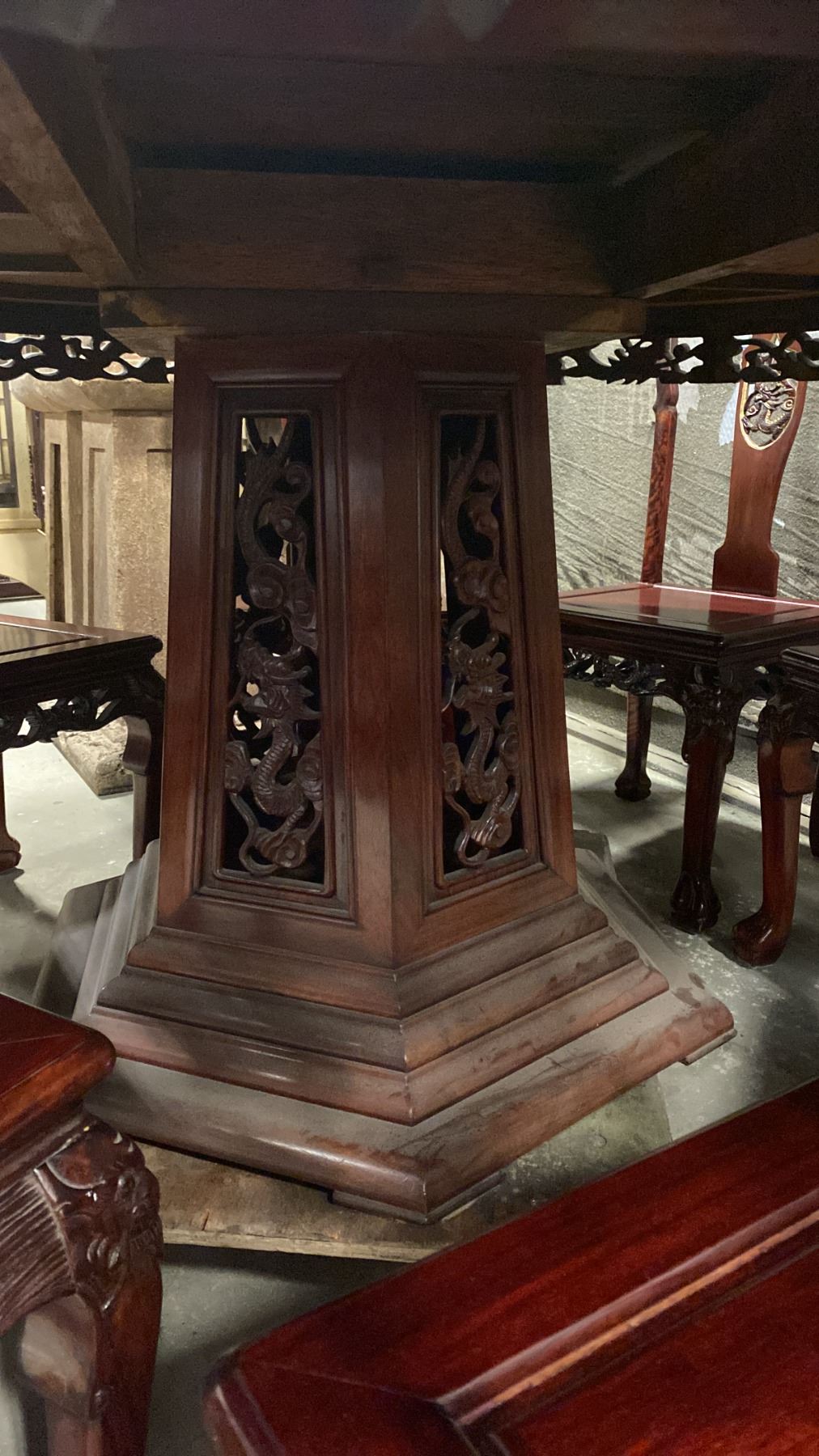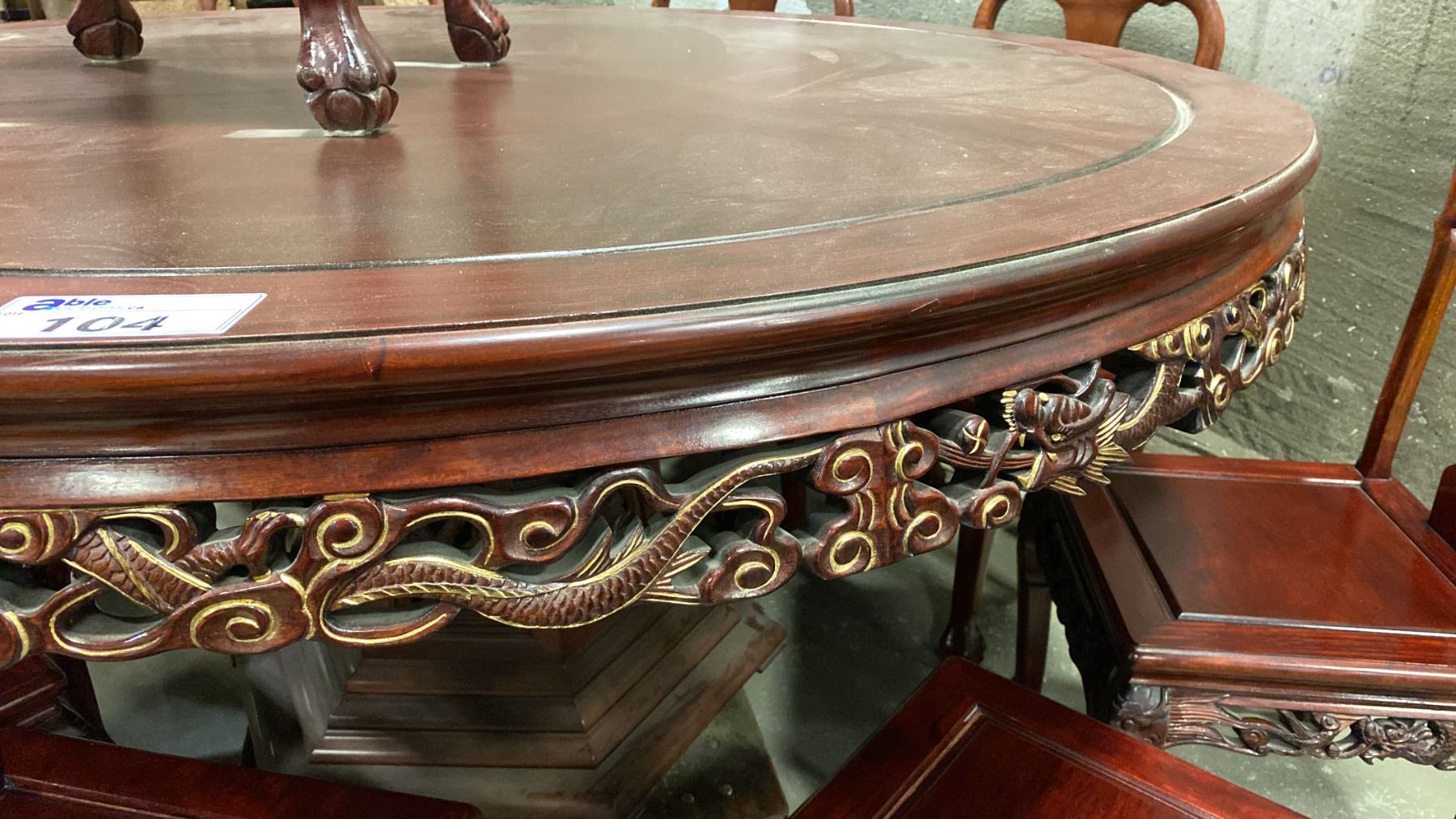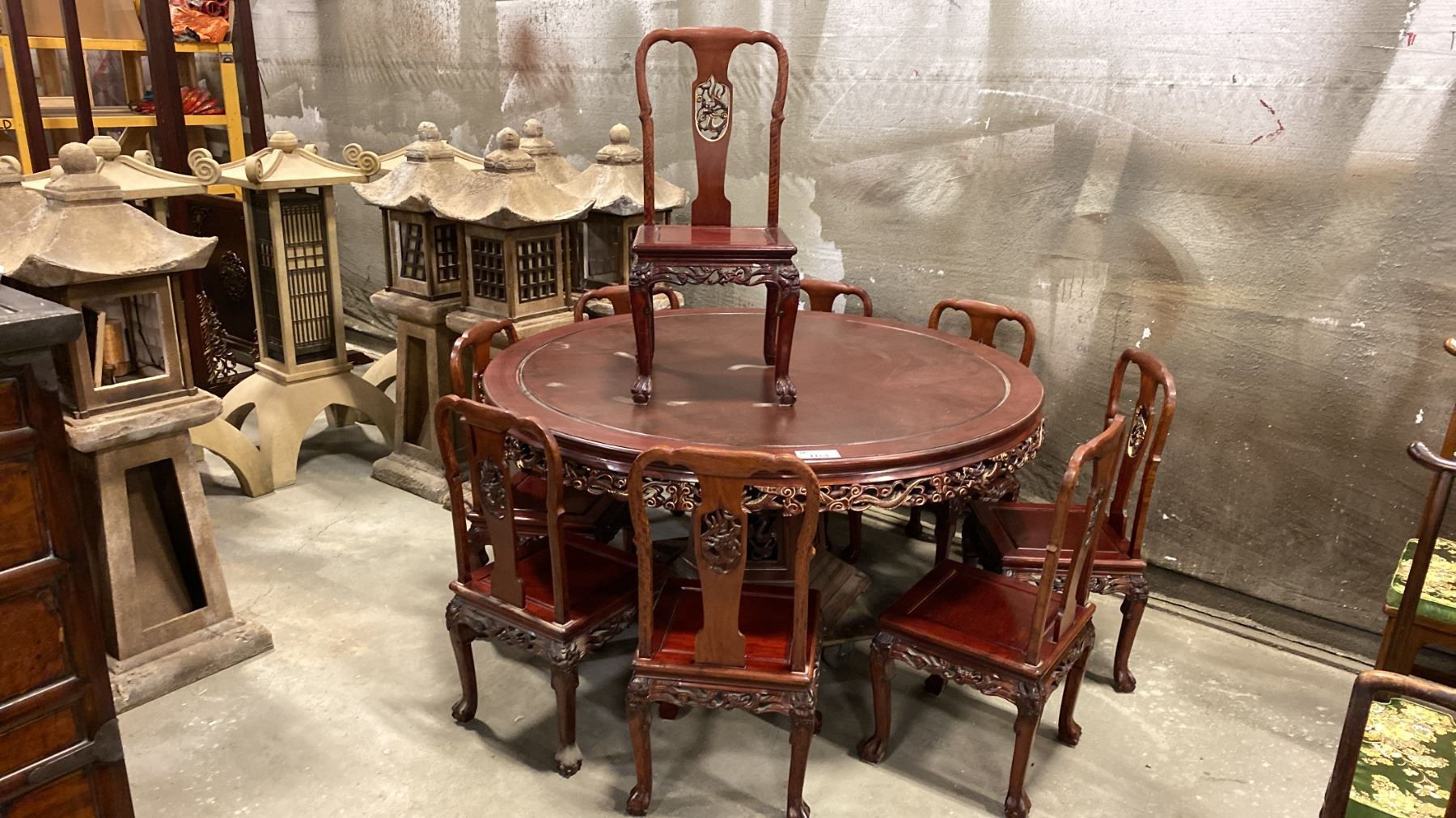 HEAVILY CARVED HARDWOOD ASIAN DINING TABLE WITH 9 SIDE CHAIRS 65" DIAMETER TOP