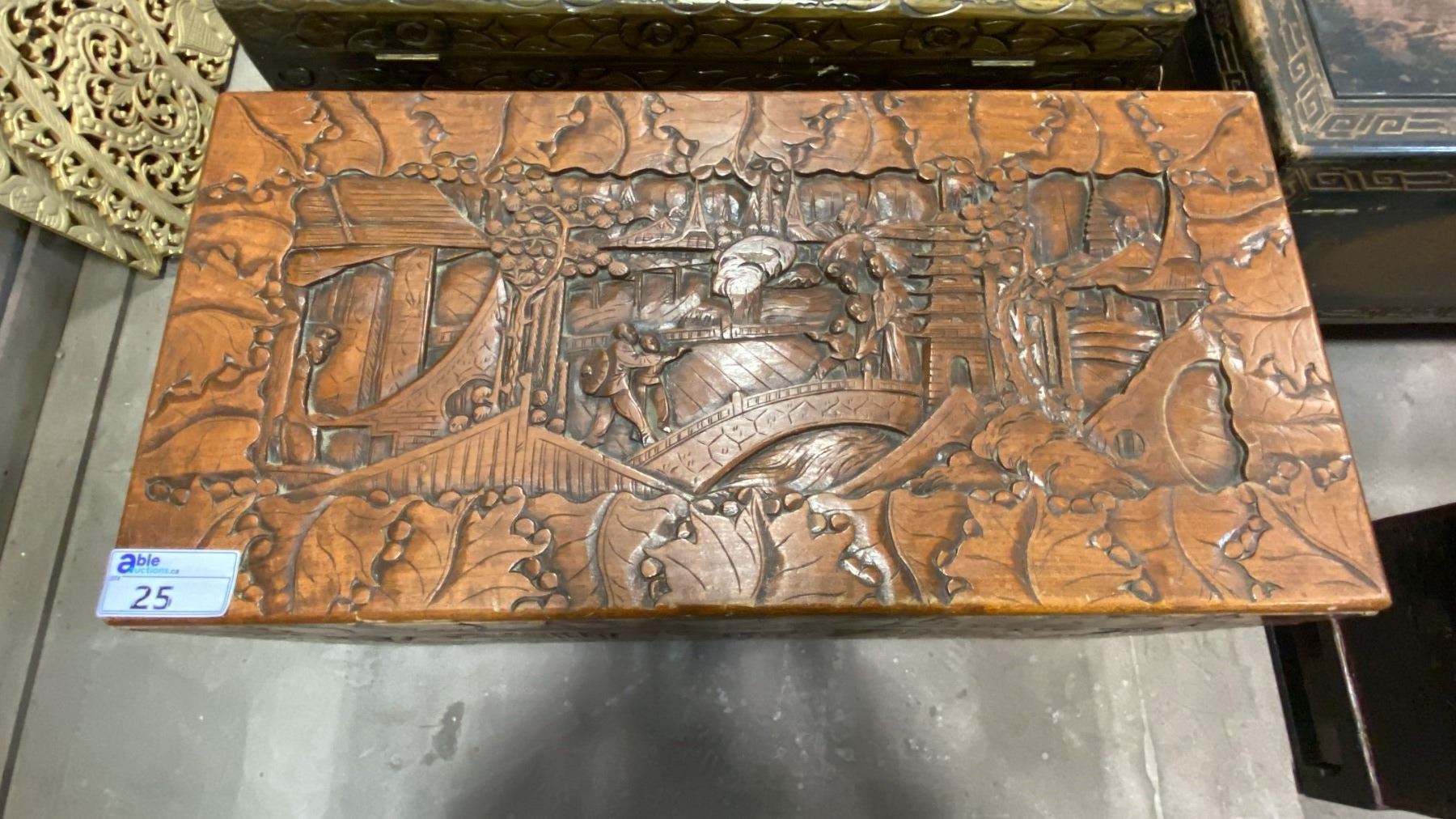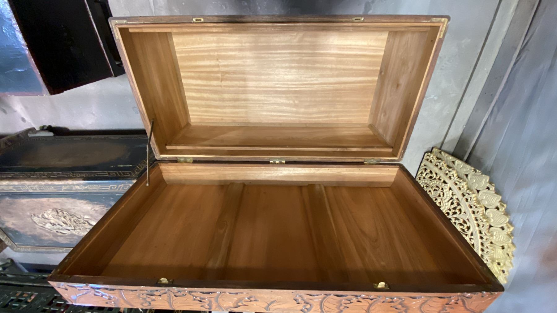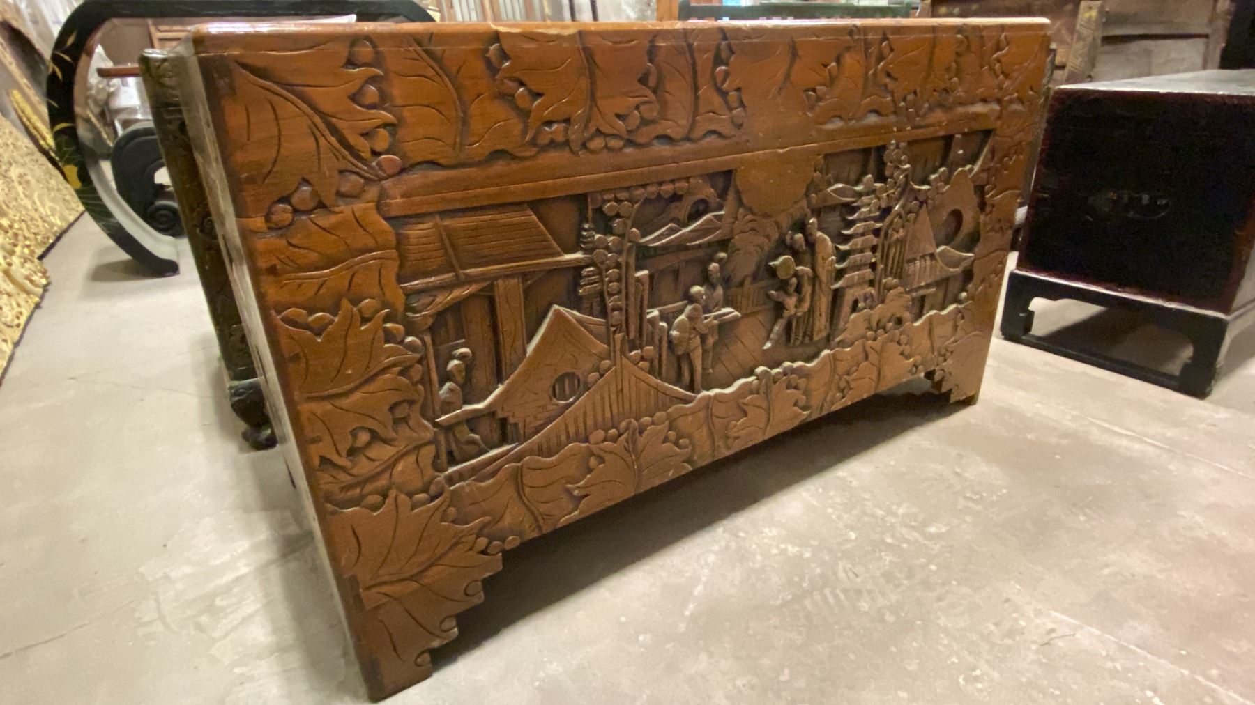 HEAVILY CARVED MAHOGANY ASIAN STORAGE TRUNK