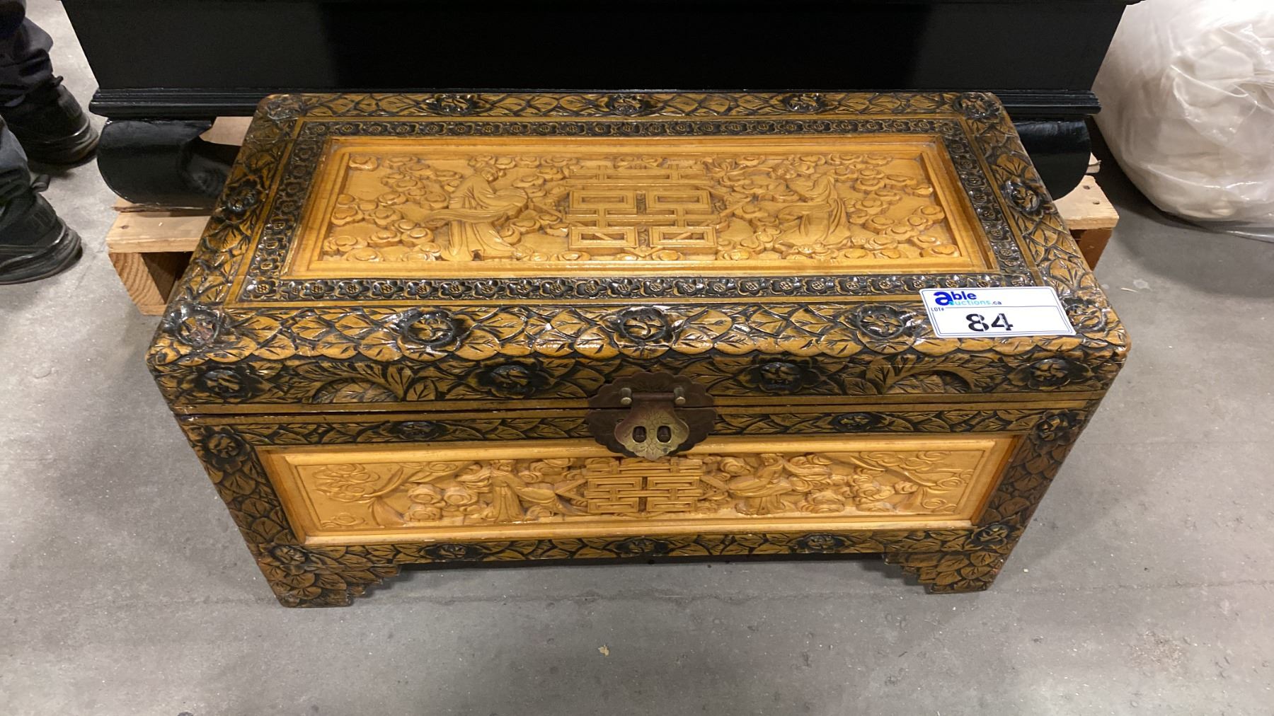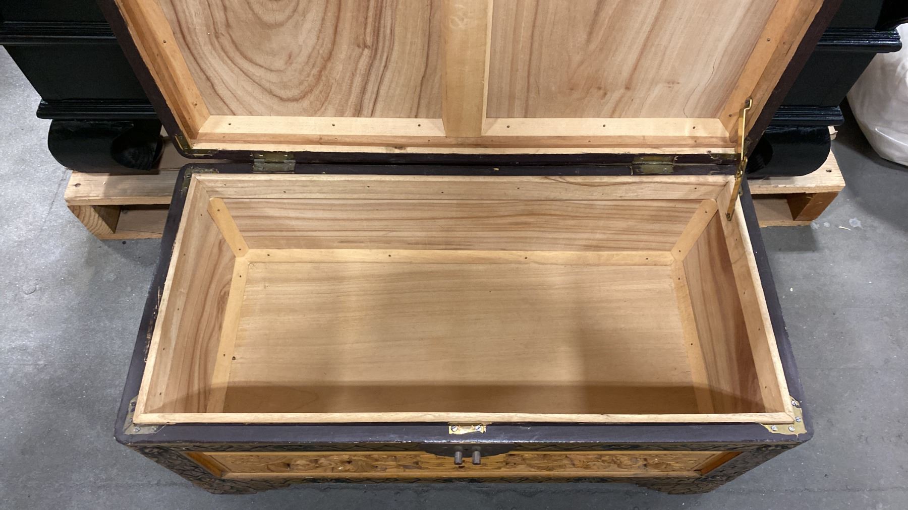 HEAVILY CARVED MAHOGANY STORAGE TRUNK