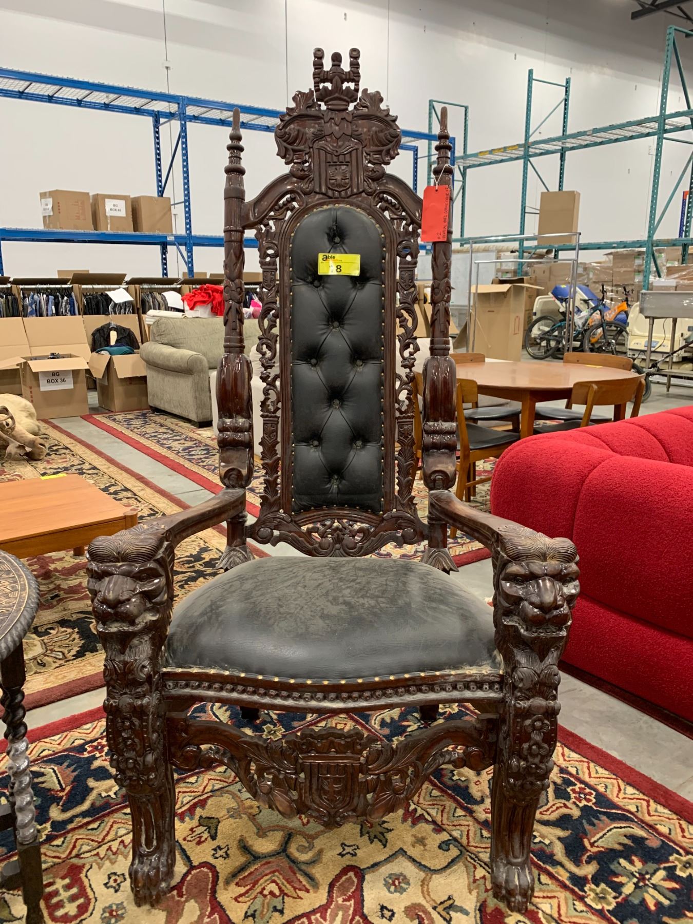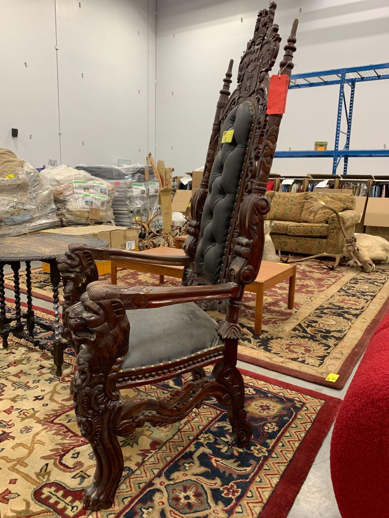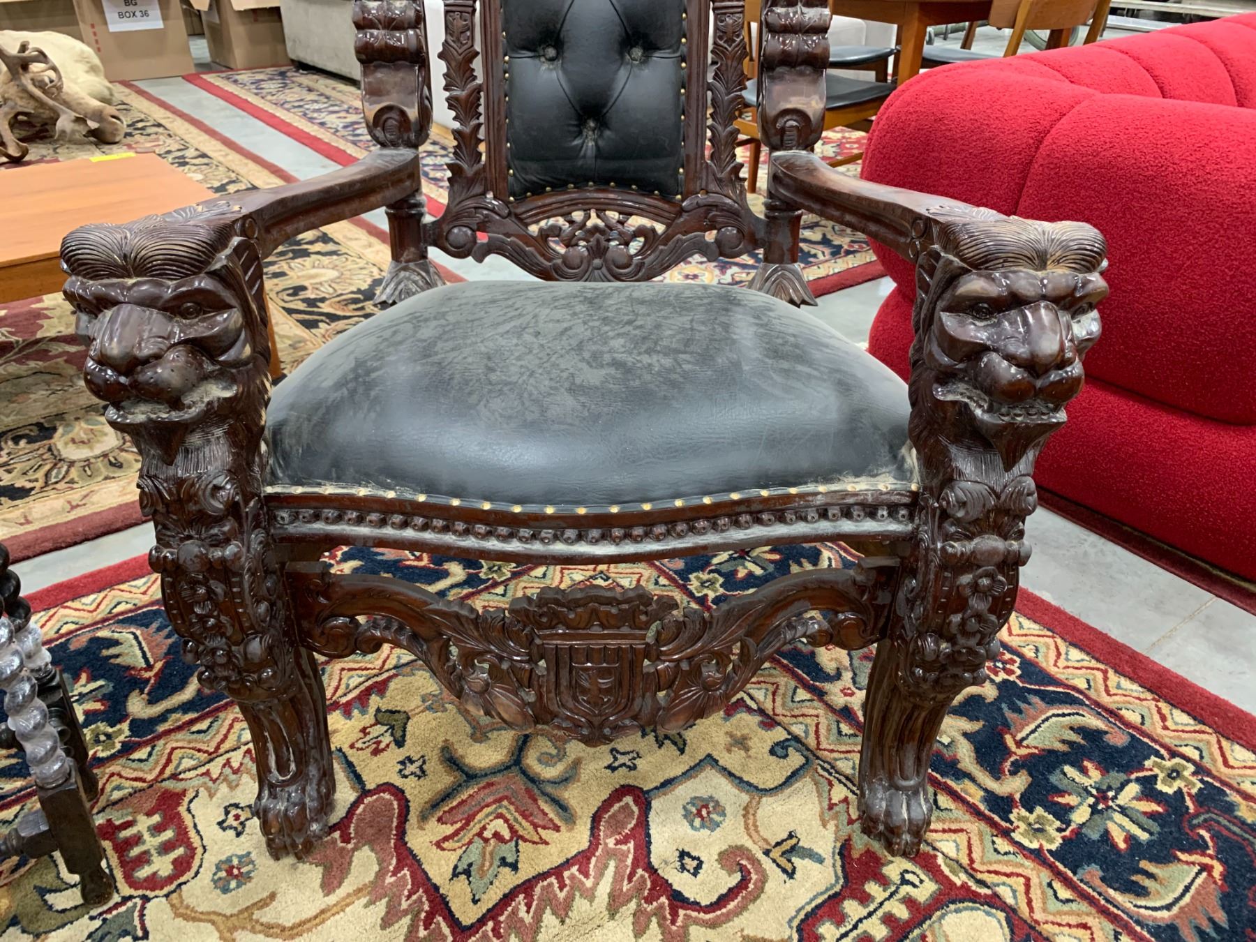 HEAVILY CARVED WOOD AND LEATHER ARMCHAIR H 70" W 34" D 22"