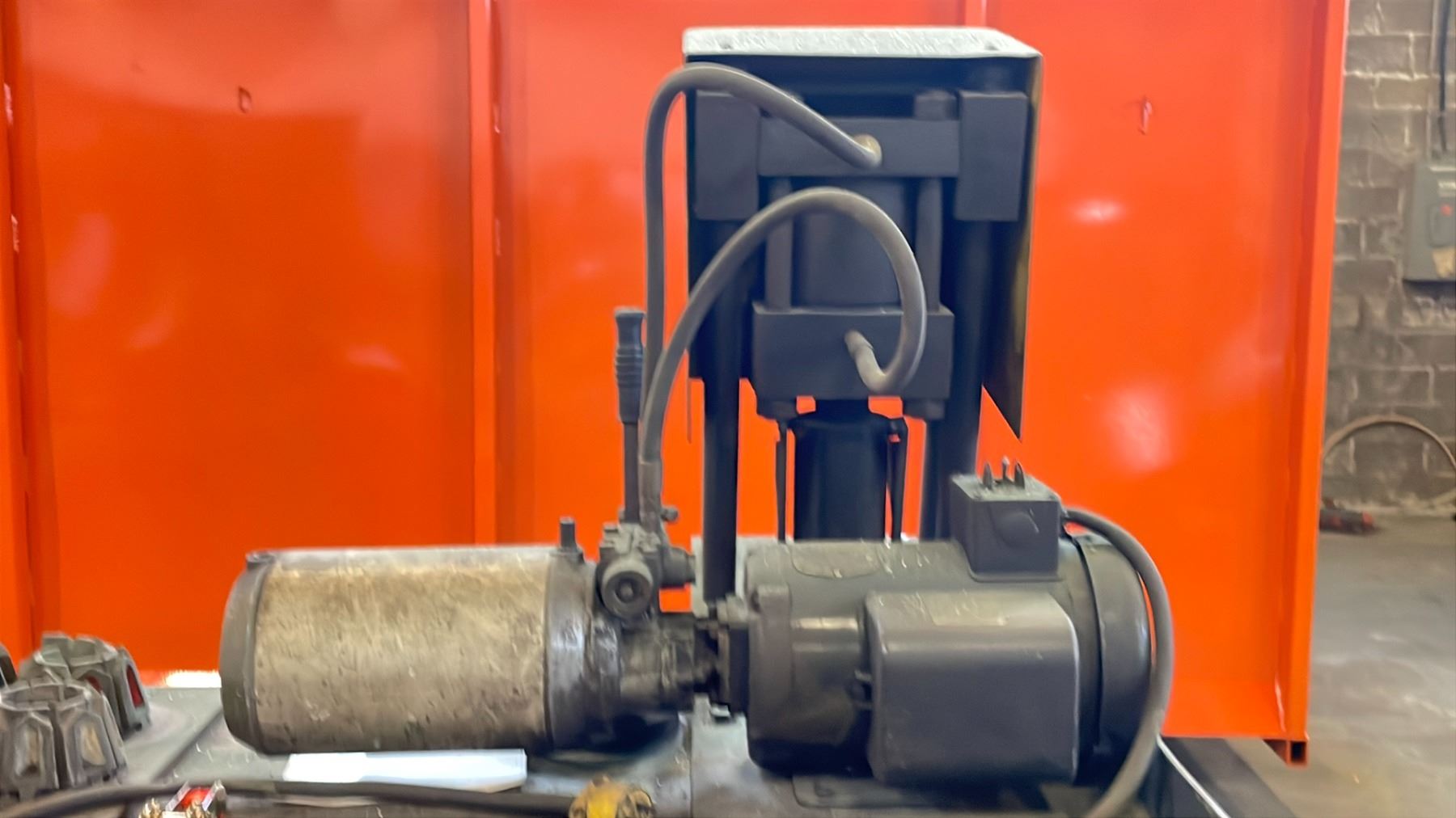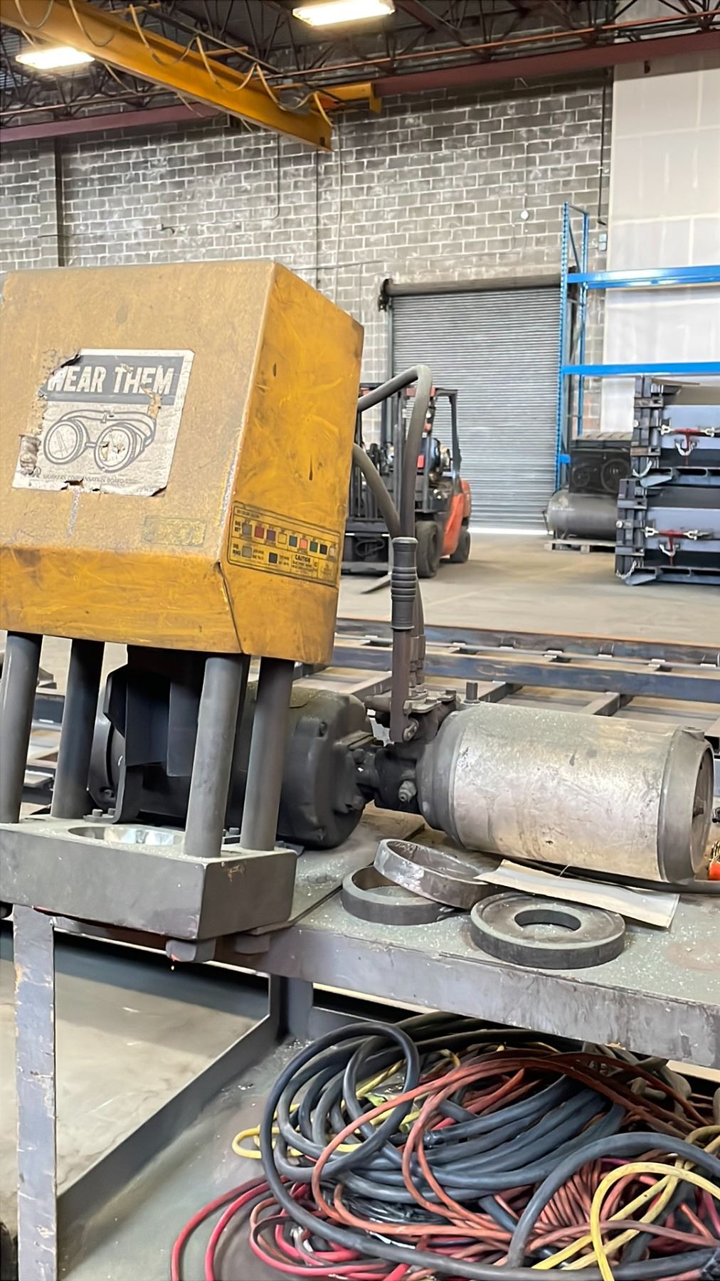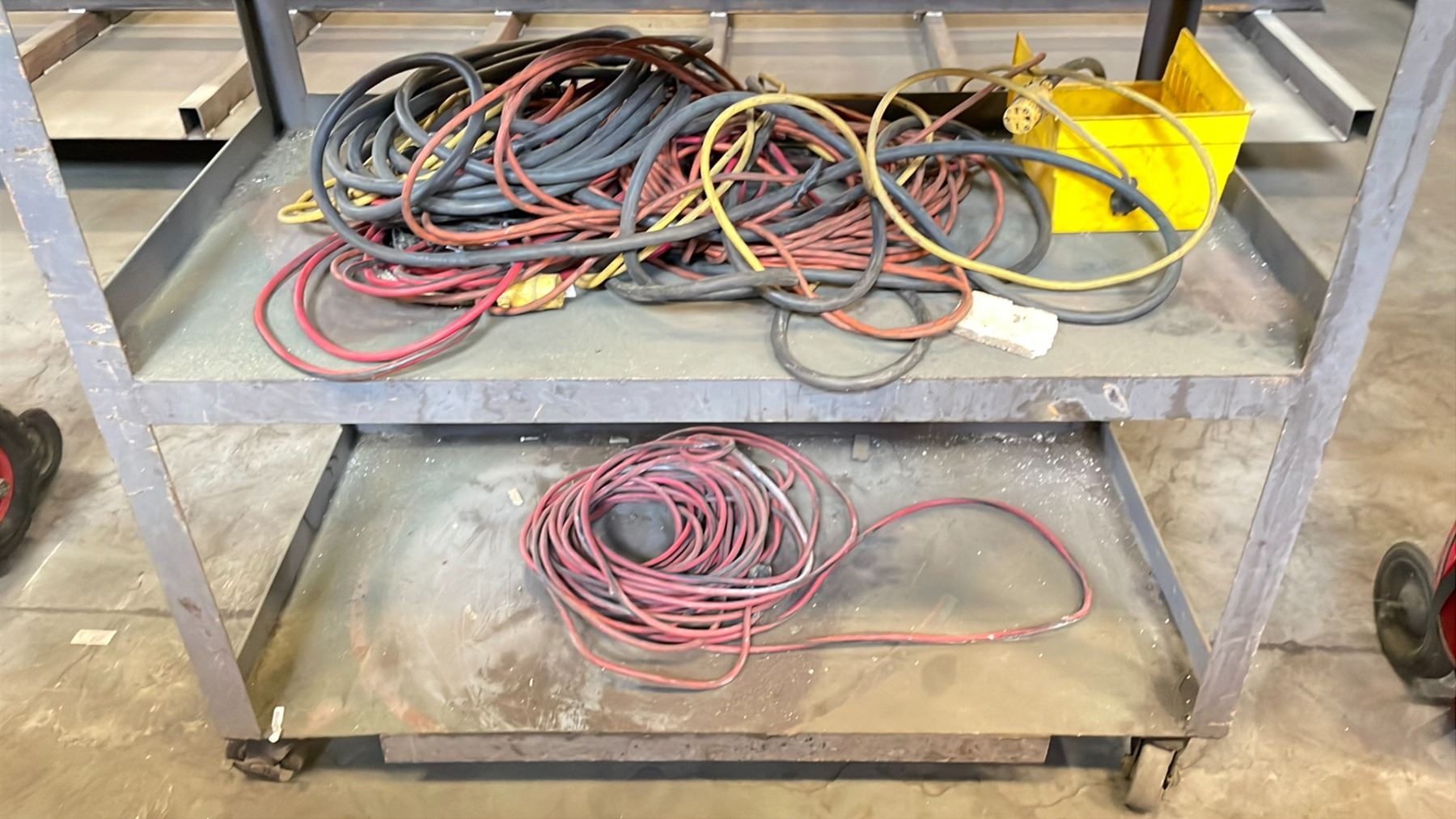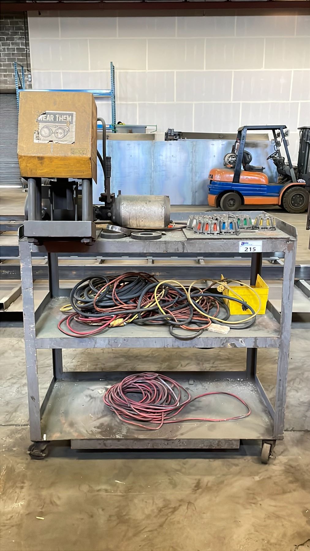 HEAVY DUTY 3 SHELF ROLLING CART WITH ELECTRIC HYDRAULIC PRESS, CONTENTS INCLUDED, INCLUDING GROUP OF EXTENSION CORDS AND SOME SCRAP METAL