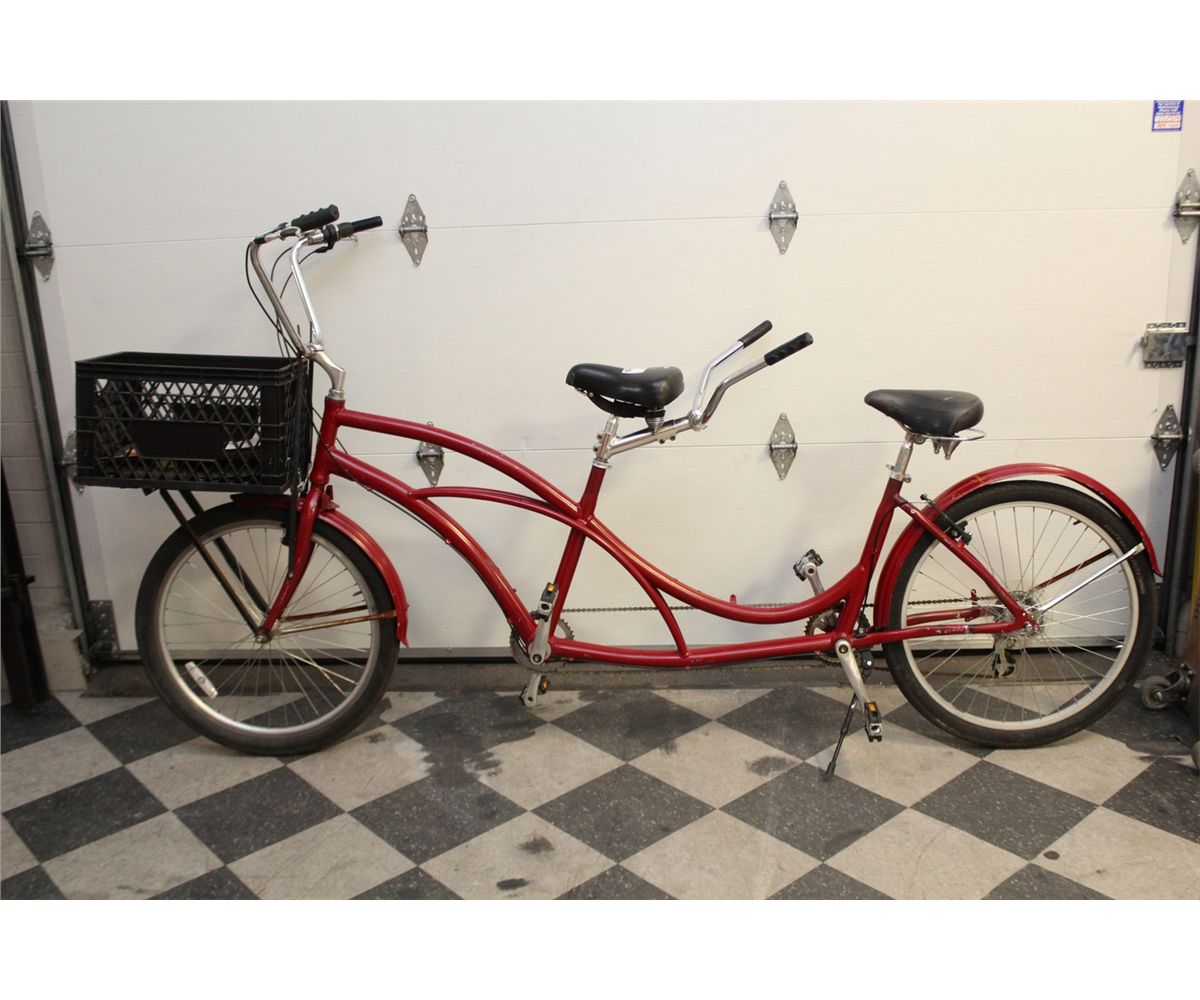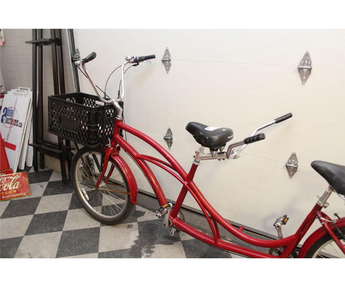 HEAVY DUTY BICYCLE BUILT FOR 2, WITH SCHWINN SEATS WITH WORKING BELL