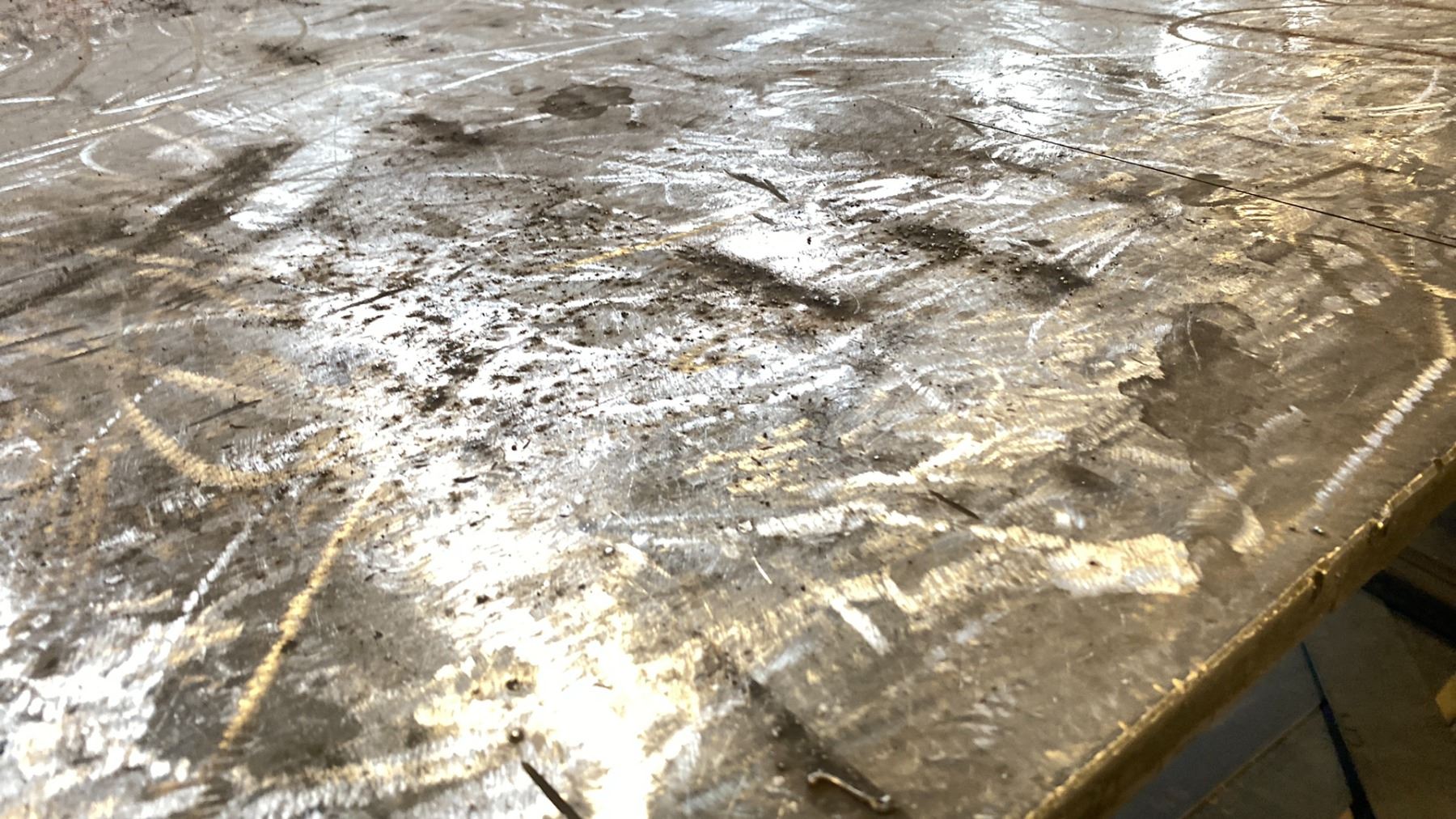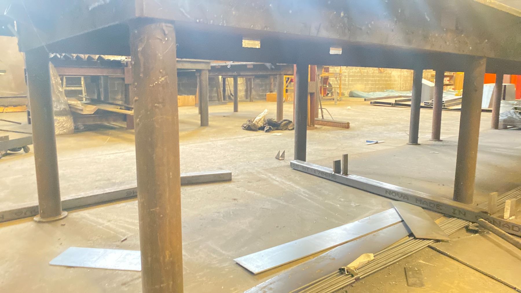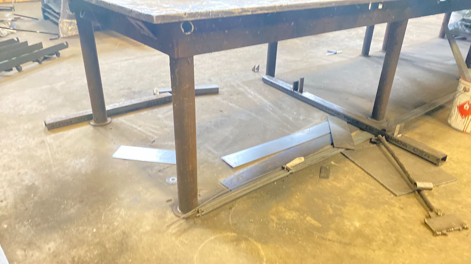 HEAVY DUTY STEEL WORK TABLE WITH 1" THICK TOP X 12' ACROSS X 5' WIDE X 3' HIGH * HAS FORKLIFT SLOTS, CONTENTS NOT INCLUDED * *FRI SEP 5 OR SAT SEP 6 REMOVAL