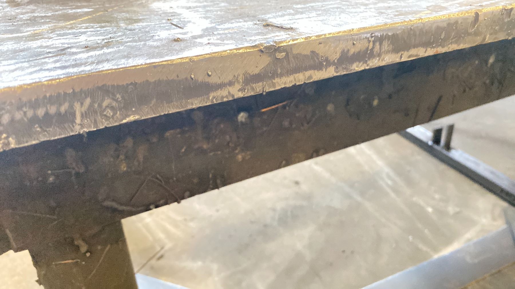 HEAVY DUTY STEEL WORK TABLE WITH 1  THICK TOP X 12' ACROSS X 5' WIDE X 3' HIGH