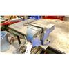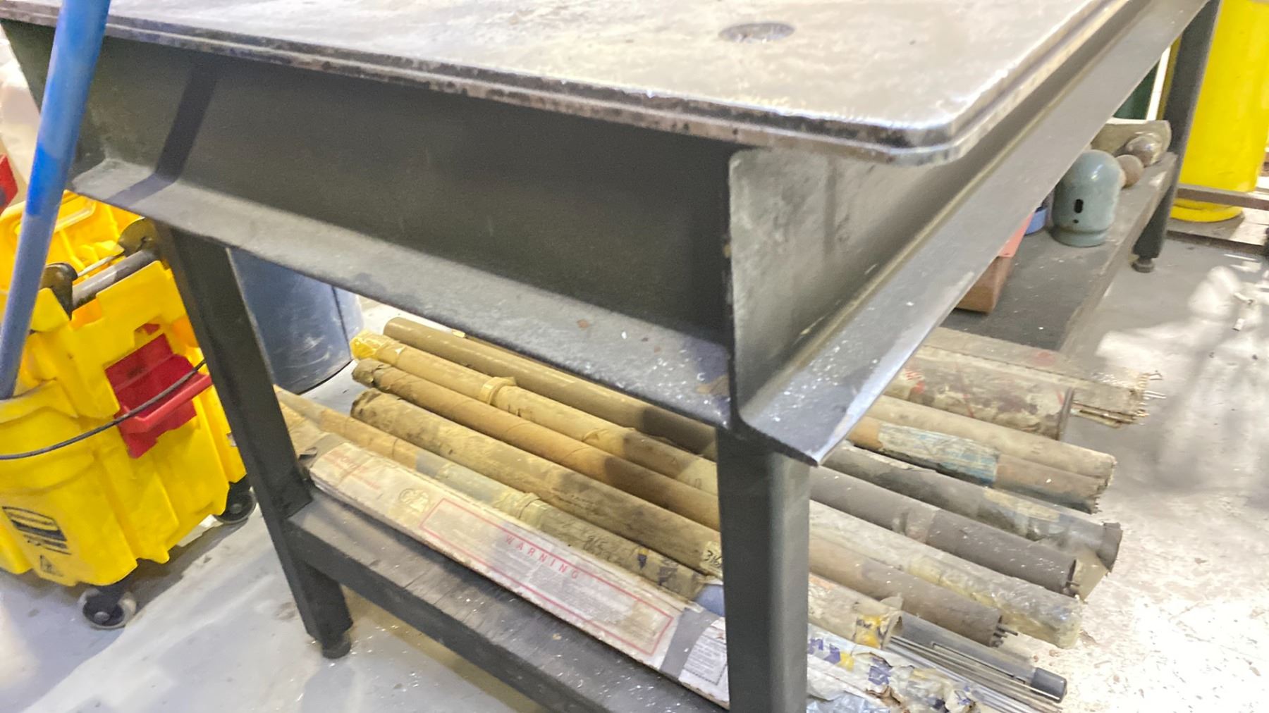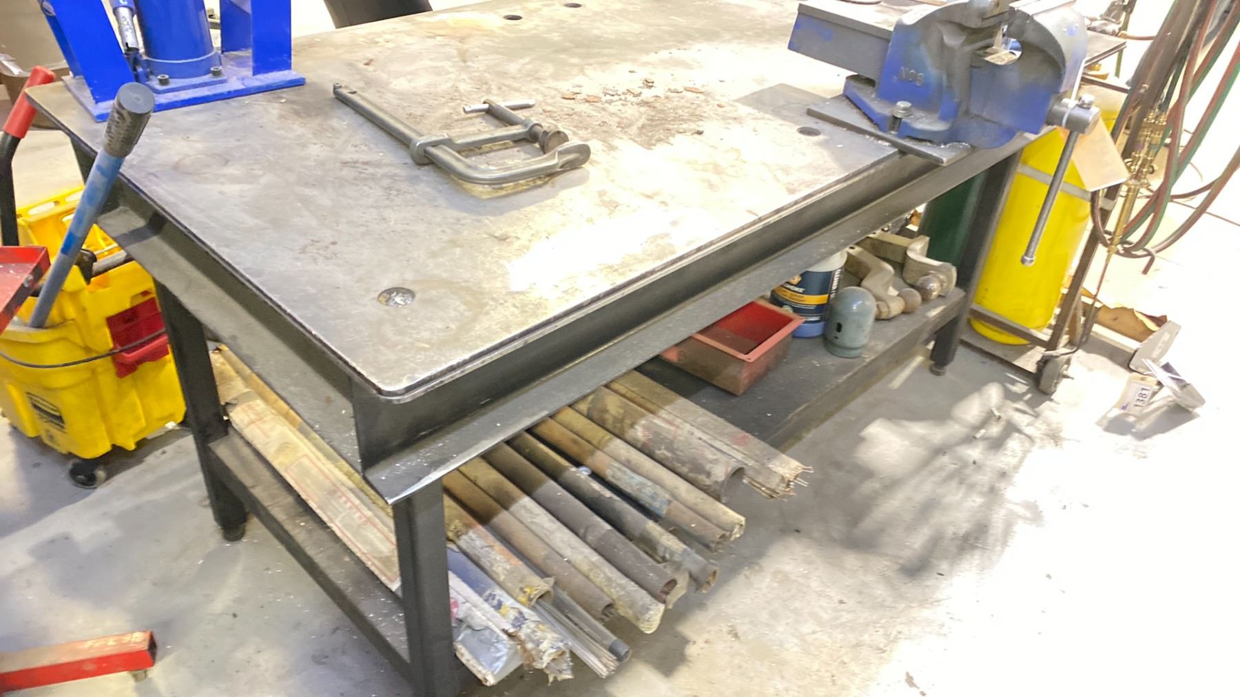 HEAVY DUTY WELDING TABLE. CAME FROM CN. 6'X38"X36"H. SOLID METAL. 6" VISE. CONTENTS NOT INCLUDED