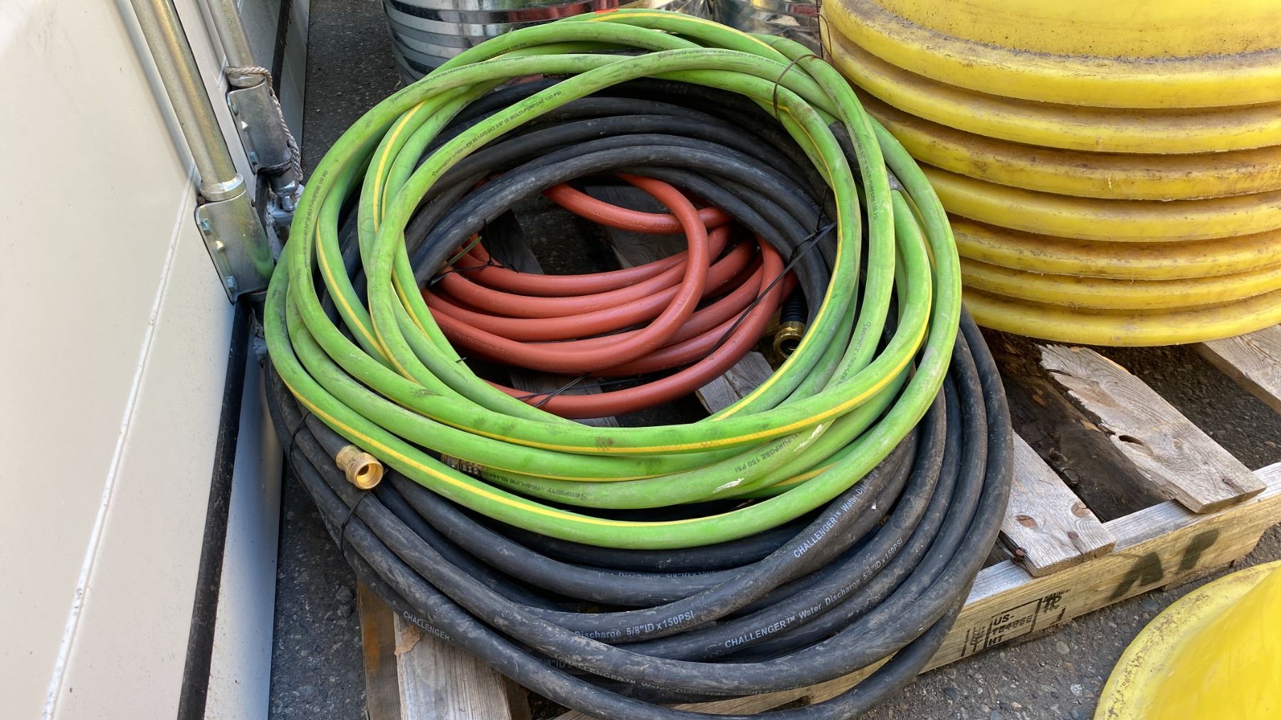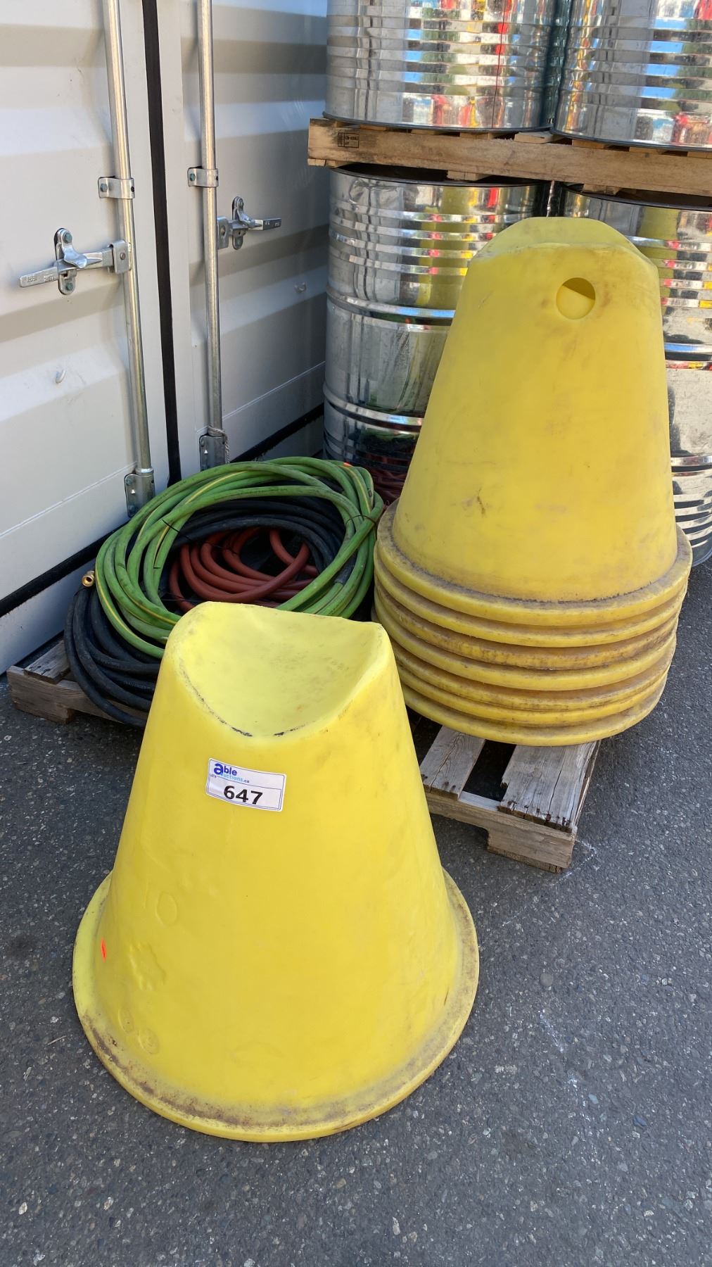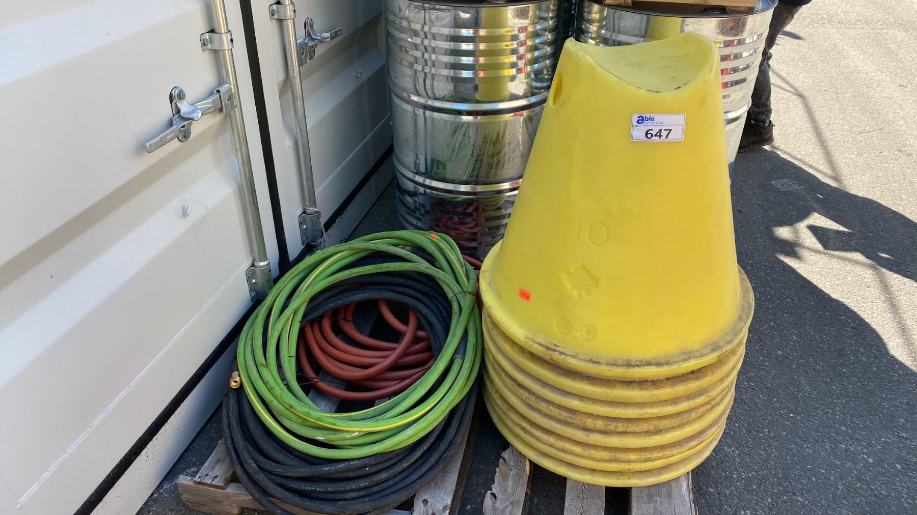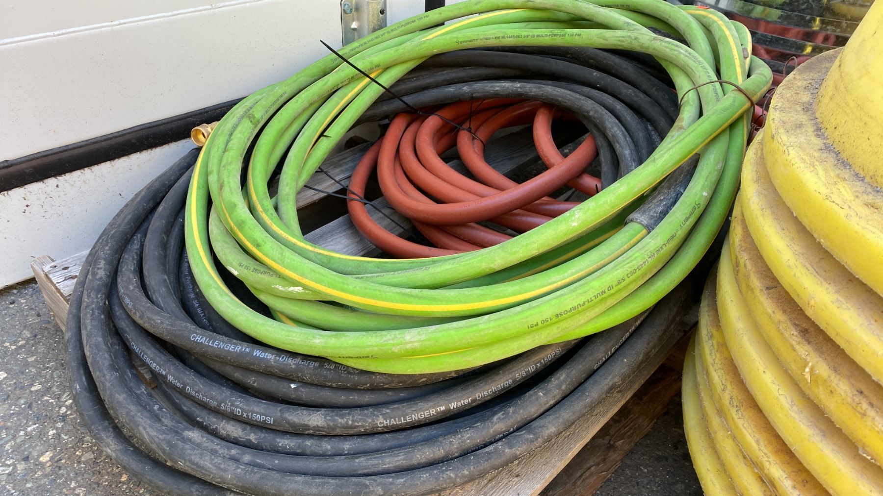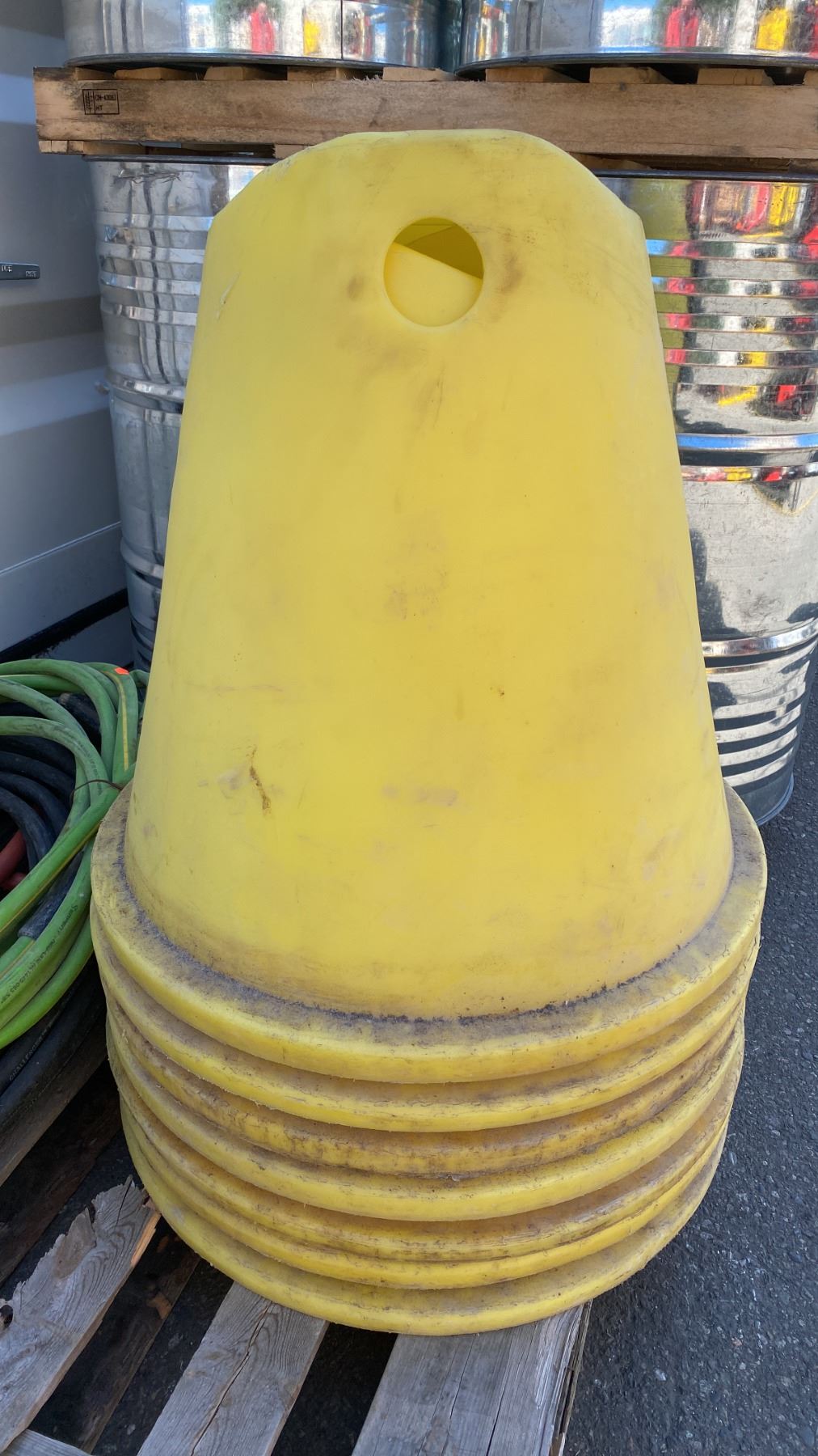HEAVY YELLOW PLASTIC PIPE STAND CONES WITH ASSORTED WATER LINE HOSE