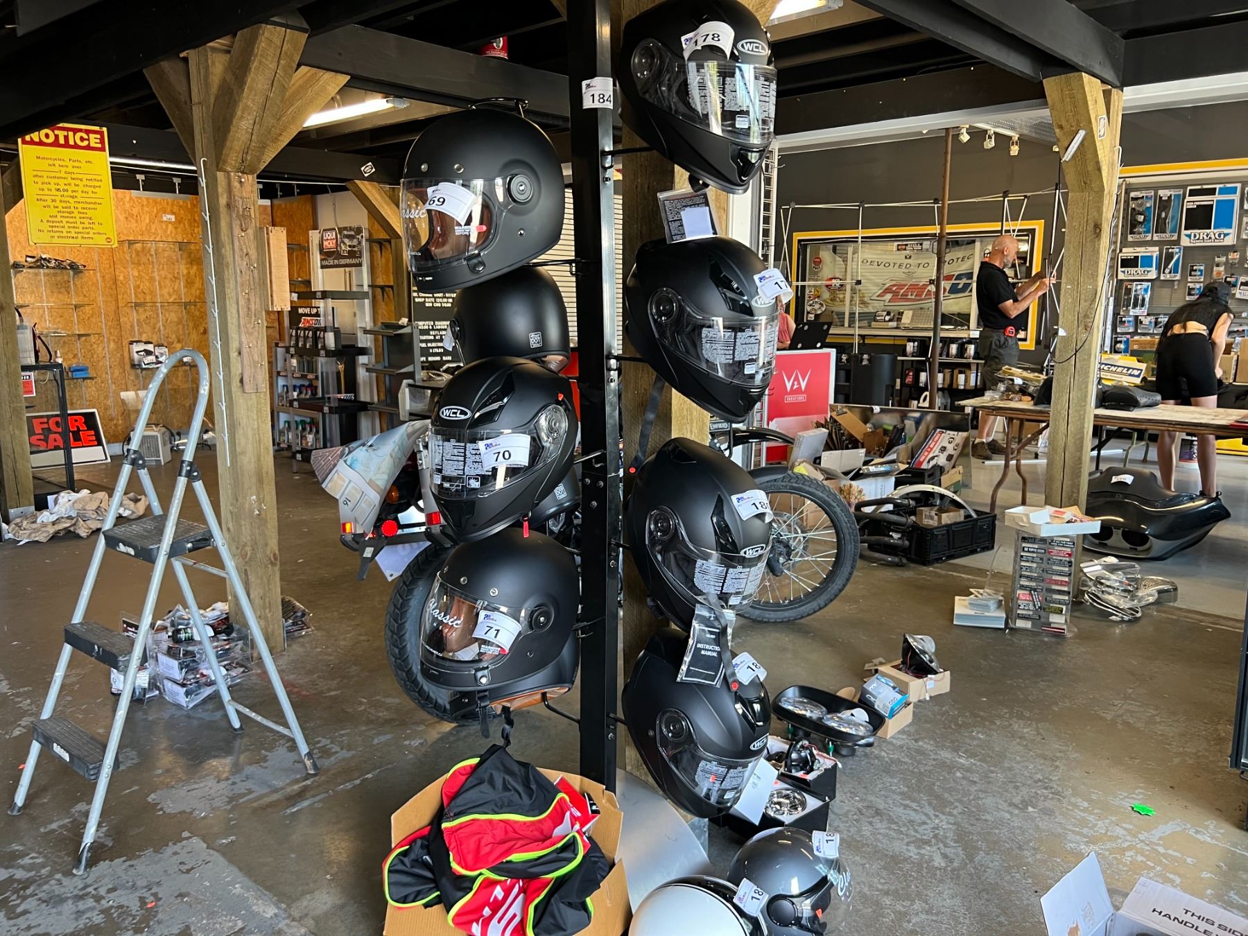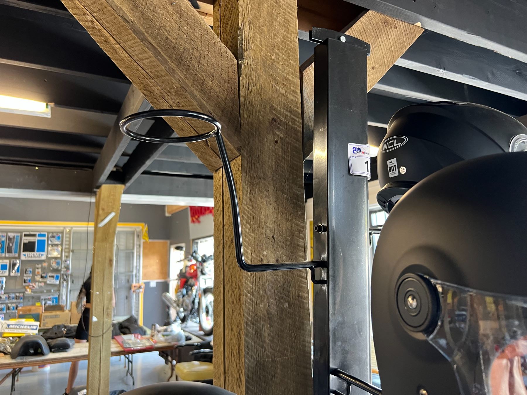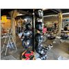HELMET DISPLAY RACK (79"H FITS 11 HELMETS) WITH BOX MISC. HELMET BAGS