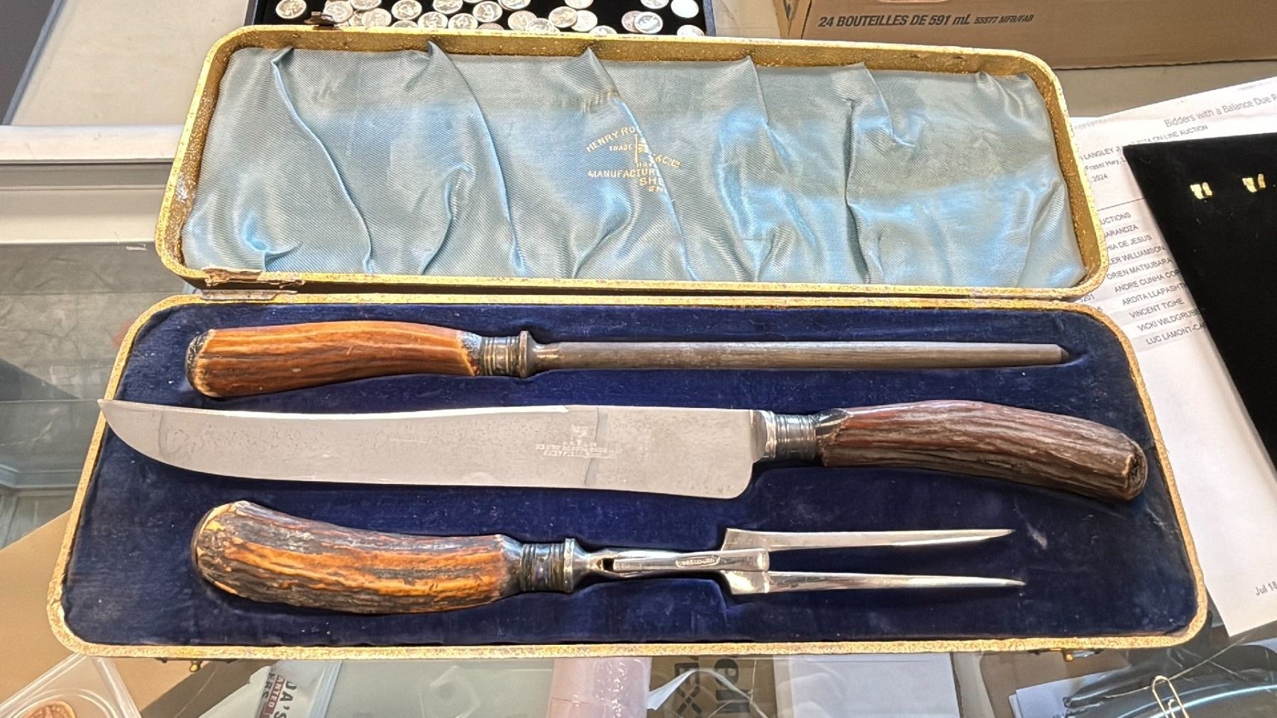 HENRY ROGERS SONS & CO SHEFFIELD ENGLAND ANTLER HANDLE CARVING SET