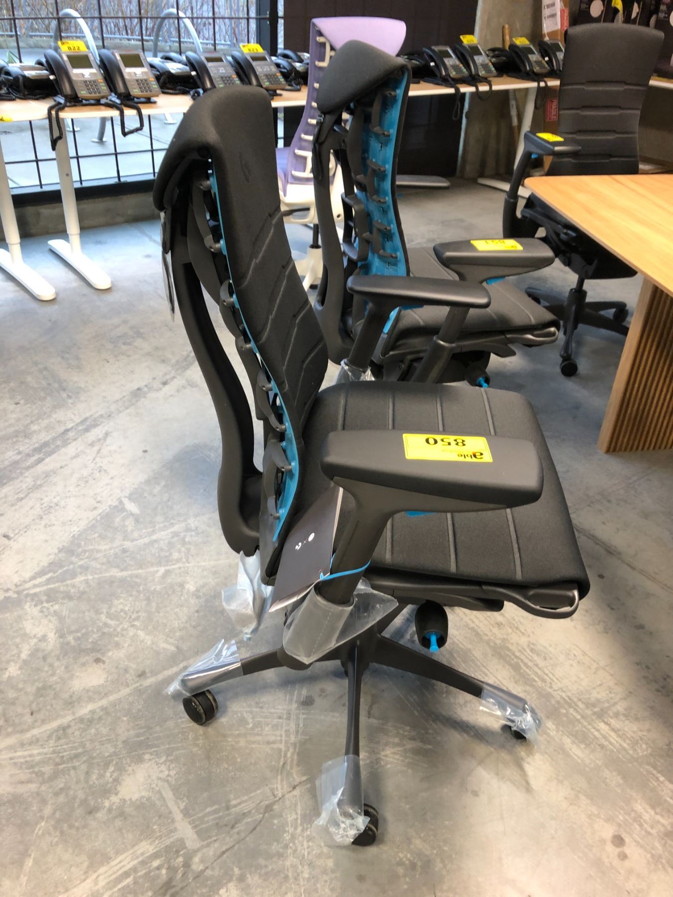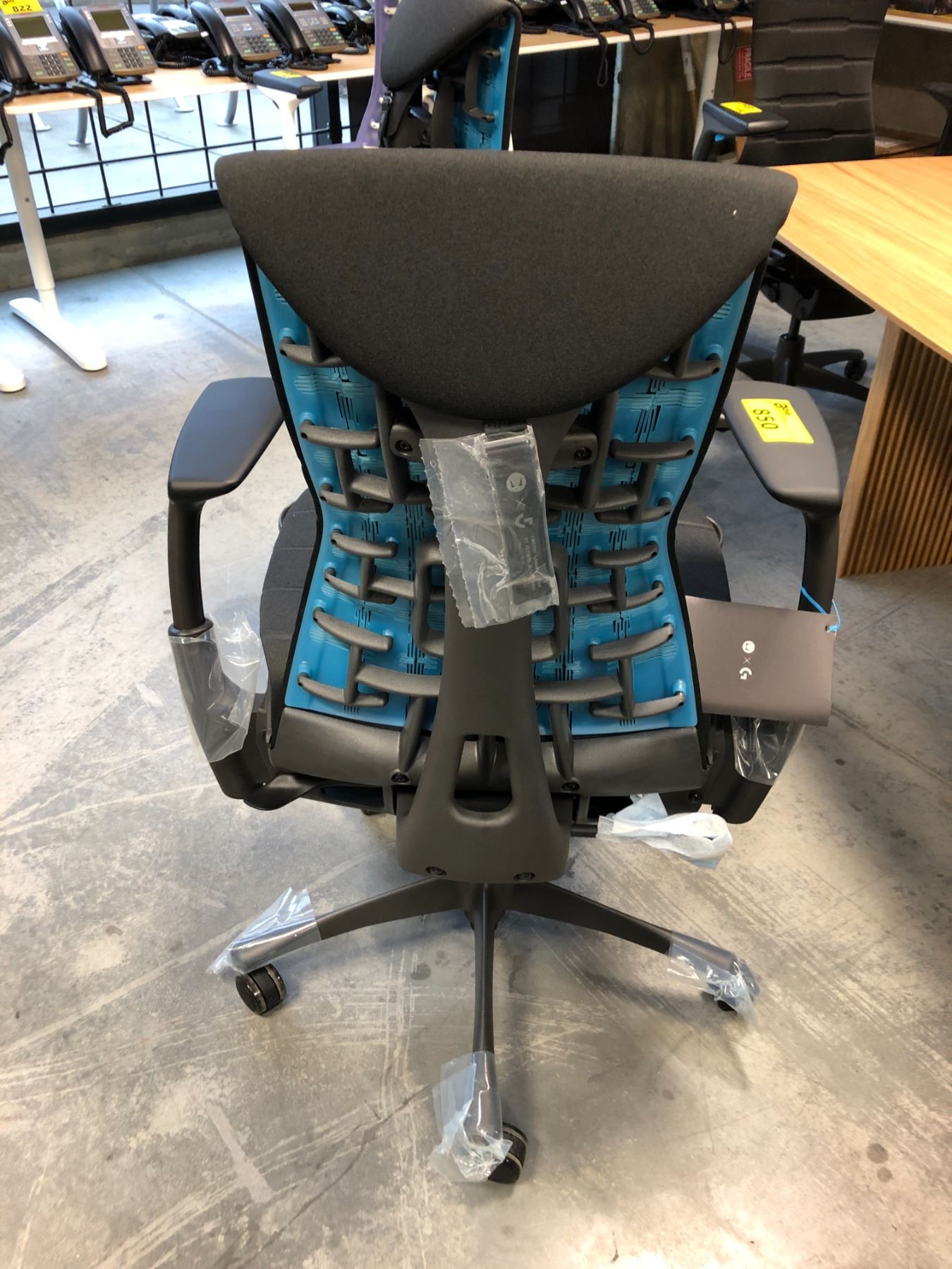 HERMAN MILLER EMBODY BLACK/CYAN FULLY ADJUSTABLE GAMING CHAIR, RETAIL PRICE $2,620