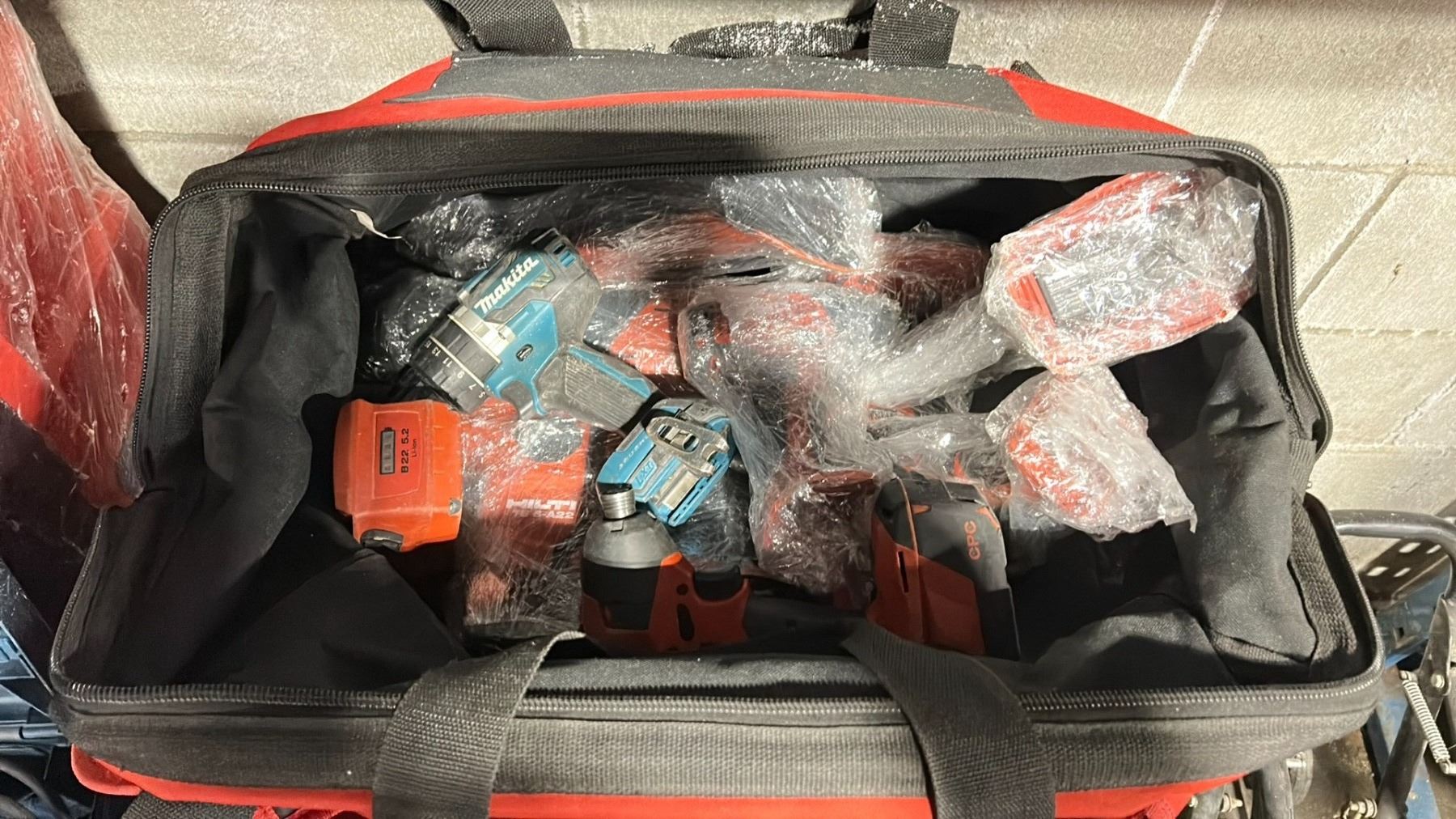 HILTI SOFT TOOL BAG WITH ASSORTED INDUSTRIAL HILTI CORDLESS TOOLS & BATTERIES