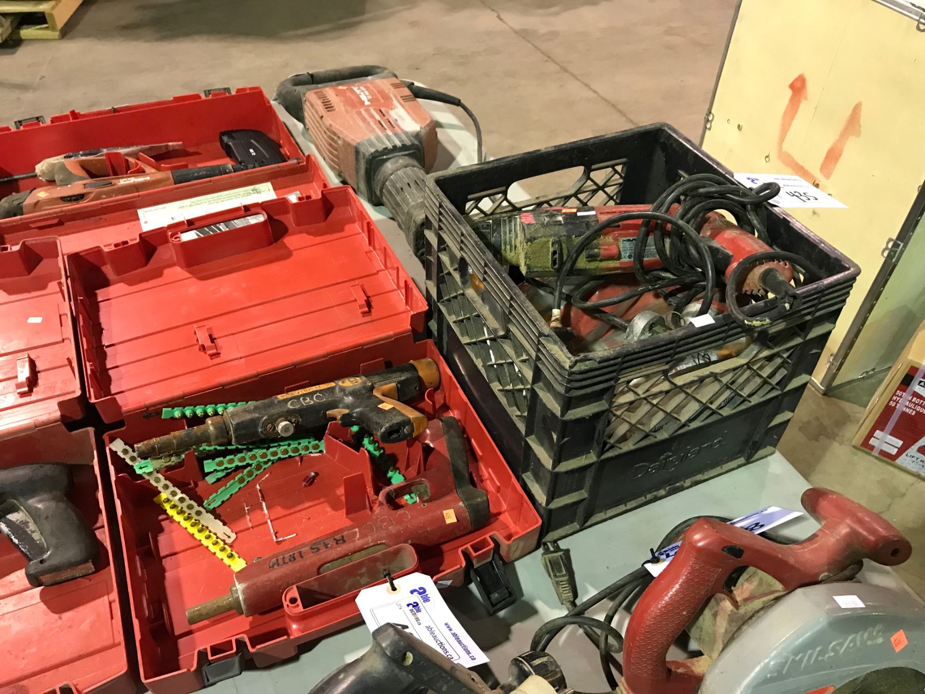 HILTI T10 HAMMER DRILL, 2 STUD GUNS AND BIN OF ASSORTED HILTI COMPOUND