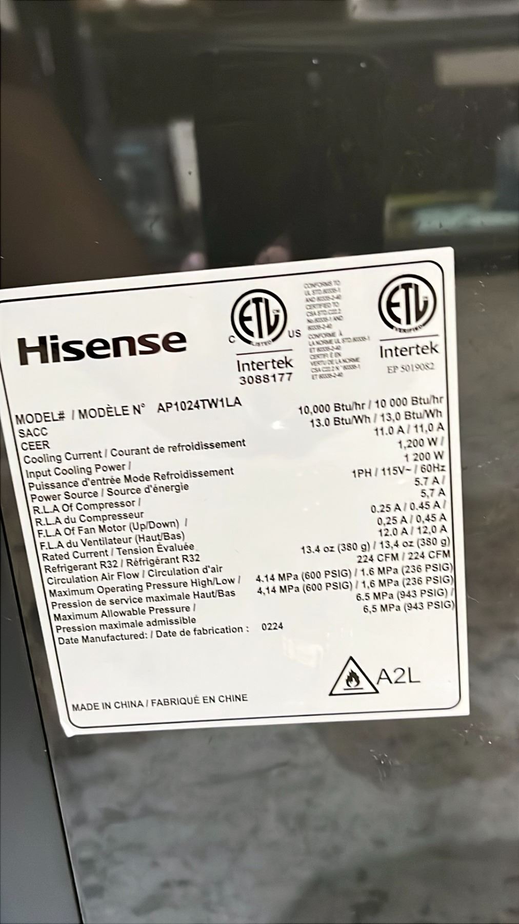 HISENSE 10,000 BTU PORTABLE DUAL HOSE AIR CONDITIONER WITH HOSES & REMOTE (NO ACCESSORIES)