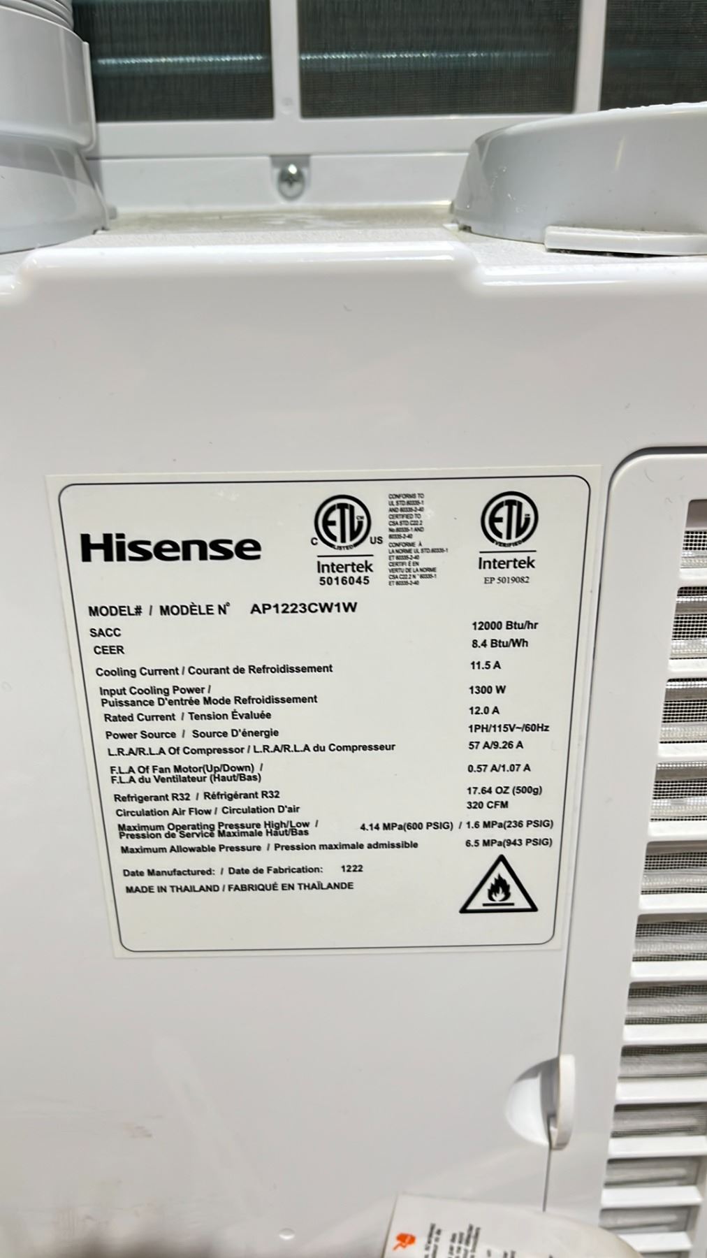 HISENSE 12,000 BTU PORTABLE AIR CONDITIONER WITH HOSE (NO REMOTE, NO ACCESSORIES)