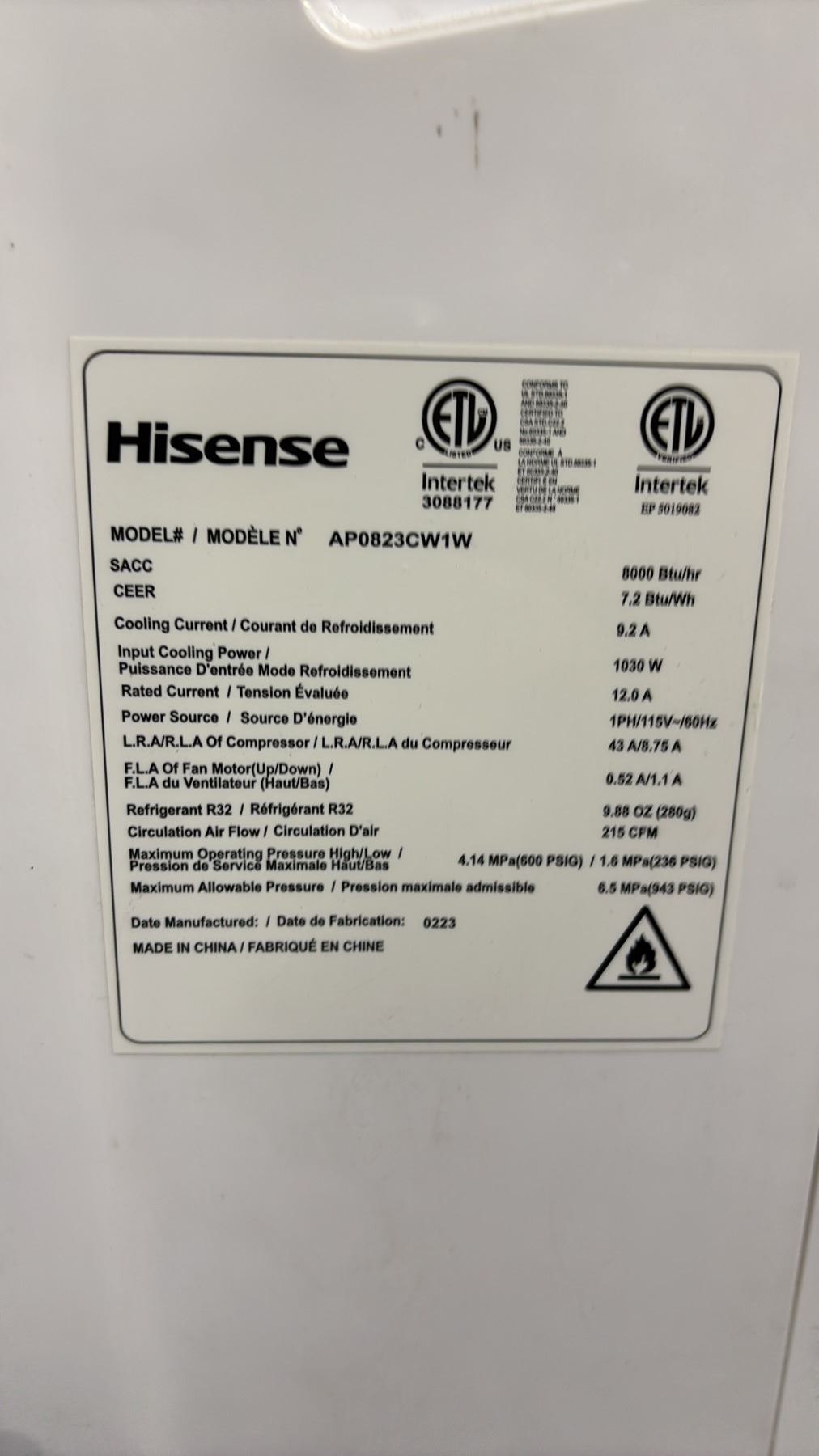 HISENSE 8,000 BTU PORTABLE AIR CONDITIONER (NO HOSE, NO REMOTE, NO ACCESSORIES)