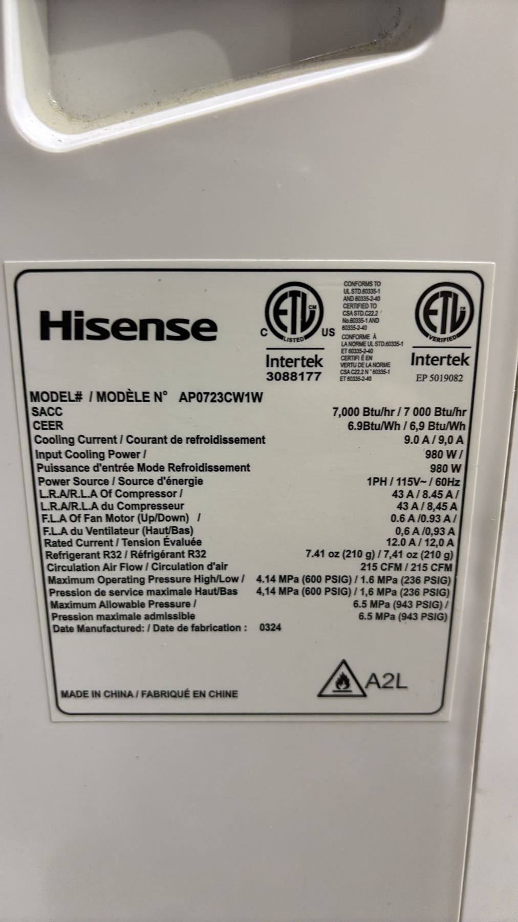 HISENSE 8,000 BTU PORTABLE AIR CONDITIONER (NO HOSE, NO REMOTE, NO ACCESSORIES)