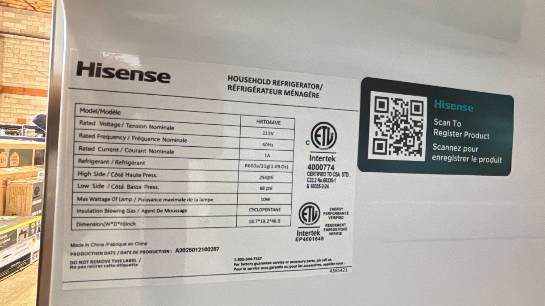 HISENSE HRT044VE STAINLESS STEEL LOOK 19"W TOP FREEZER 4.4 CU. FT REFRIGERATOR