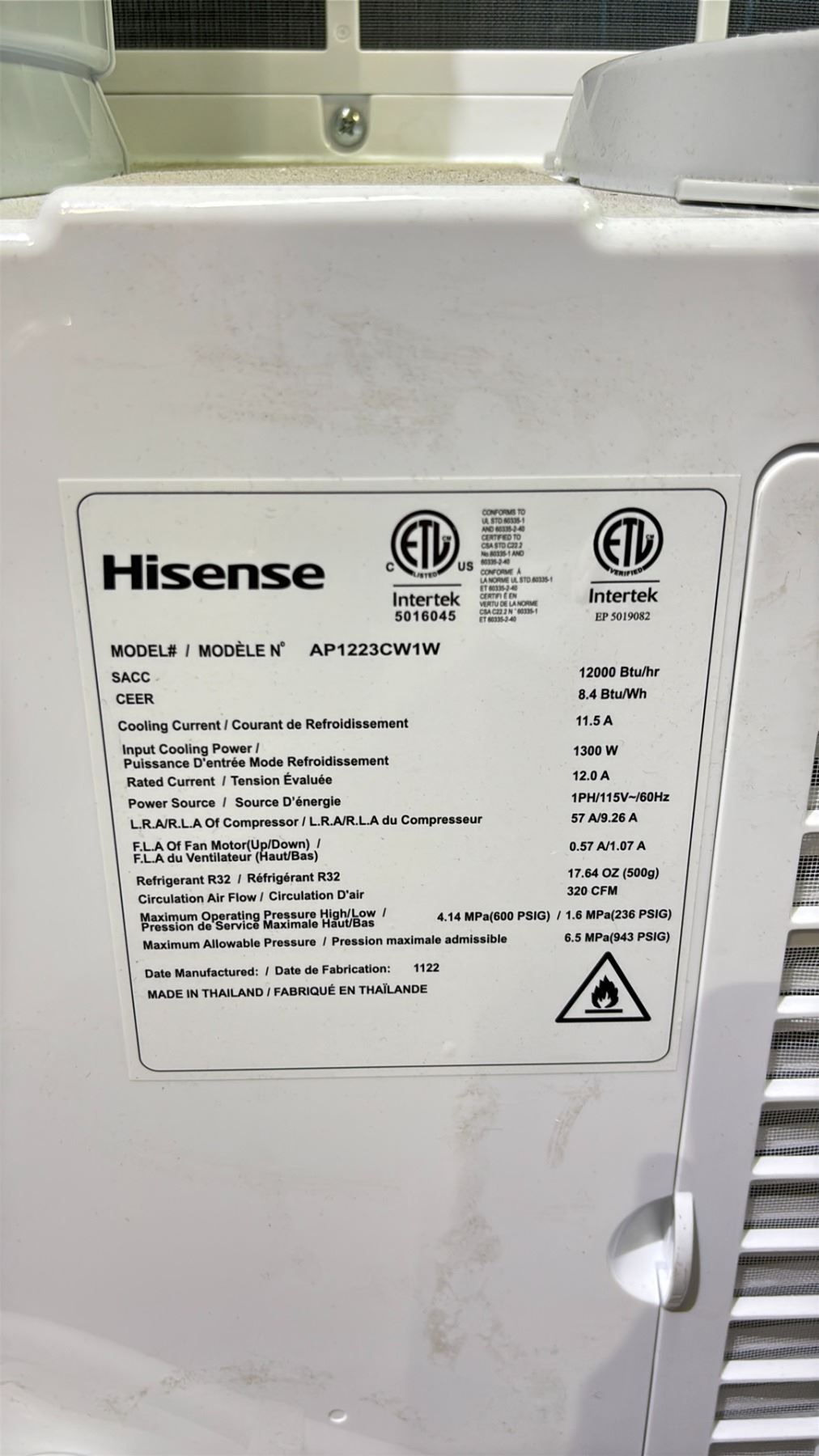 HISENSE PORTABLE AIR CONDITIONER AP1223CW1W WITH HOSE & REMOTE