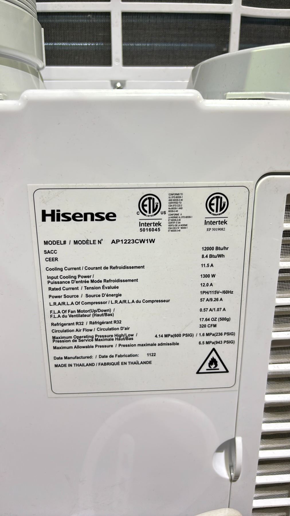 HISENSE PORTABLE AIR CONDITIONER AP1223CW1W WITH HOSE & REMOTE