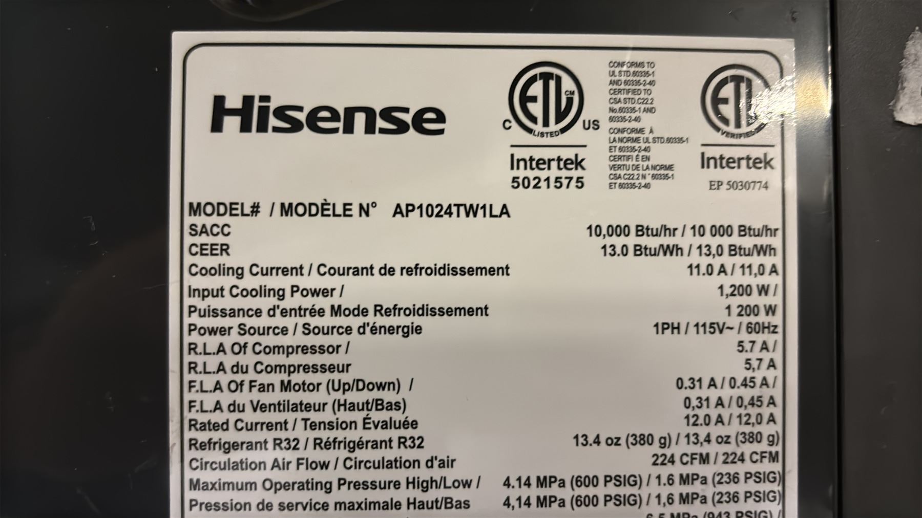 HISENSE PORTABLE AIR CONDITIONER WITH HOSE & WINDOW ATTACHMENT *NO REMOTE*