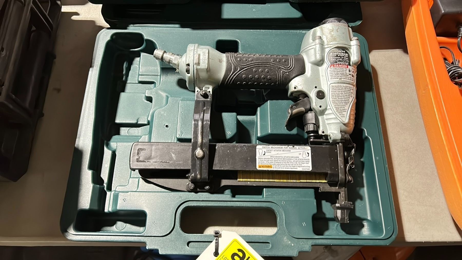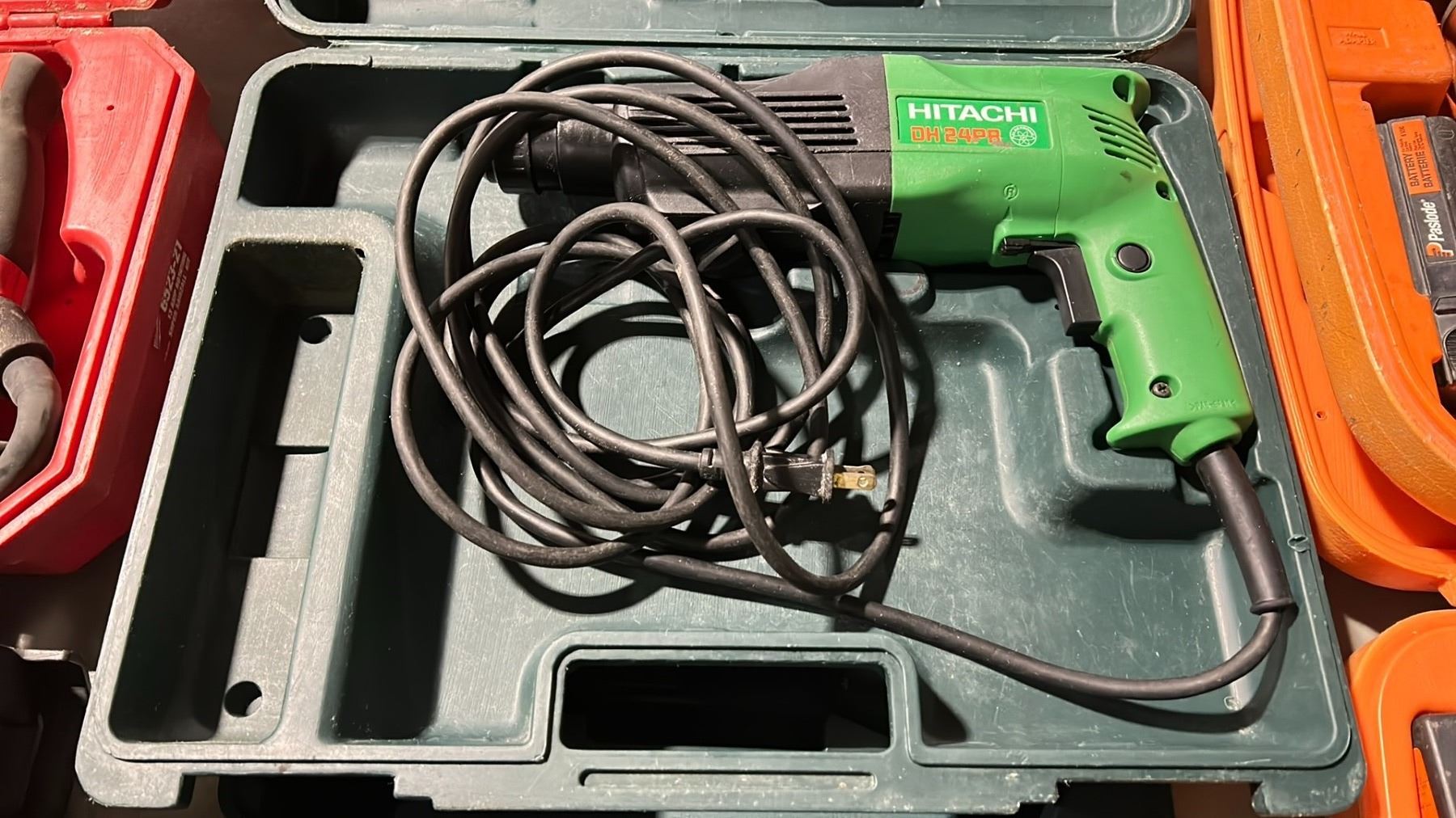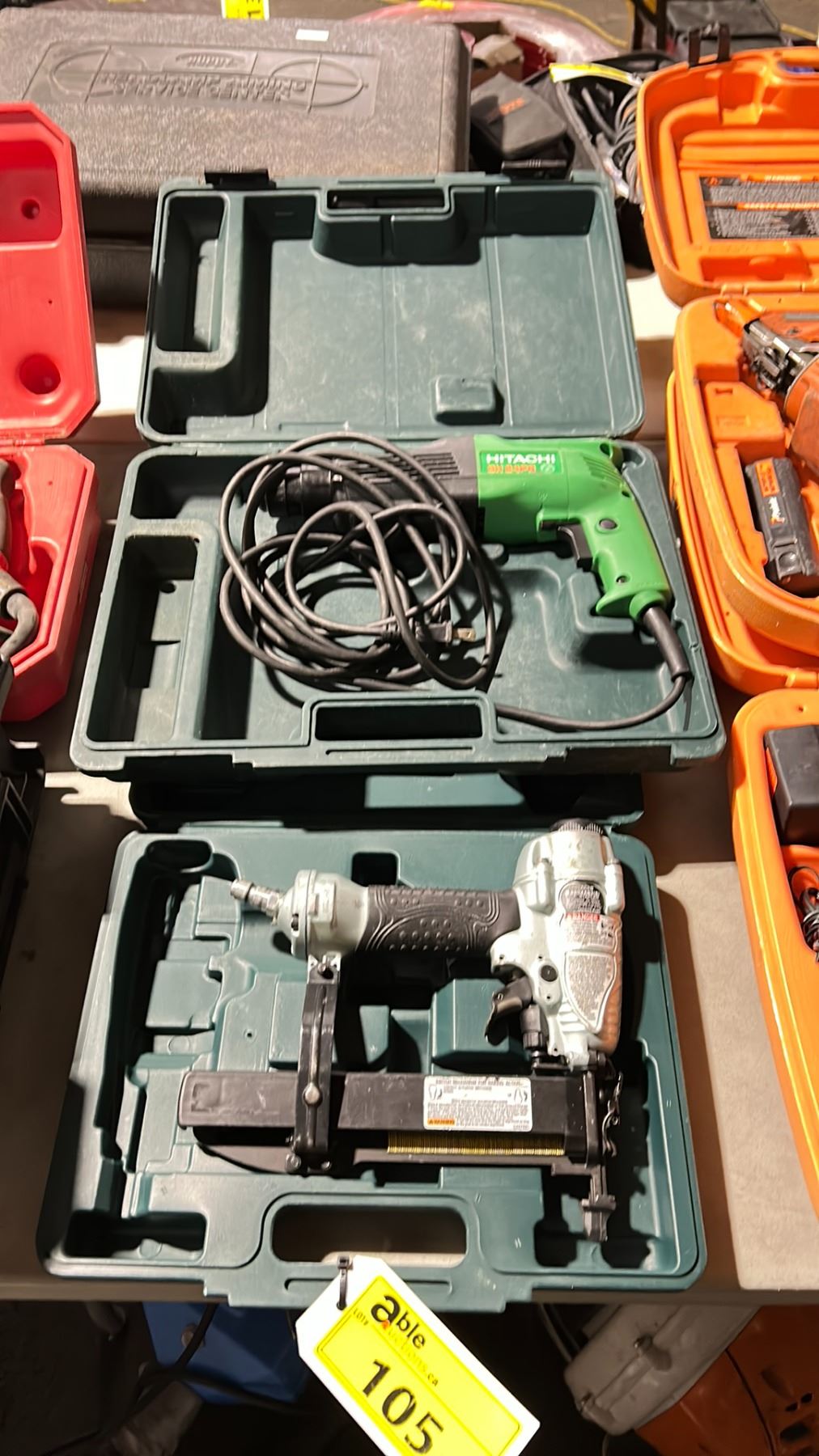 HITACHI N3804AB3S PNEUMATIC STAPLE GUN IN HARD TRANSPORT CASE & HITACHI DH24PR ELECTRIC HAMMER DRILL IN HARD TRANSPORT CASE