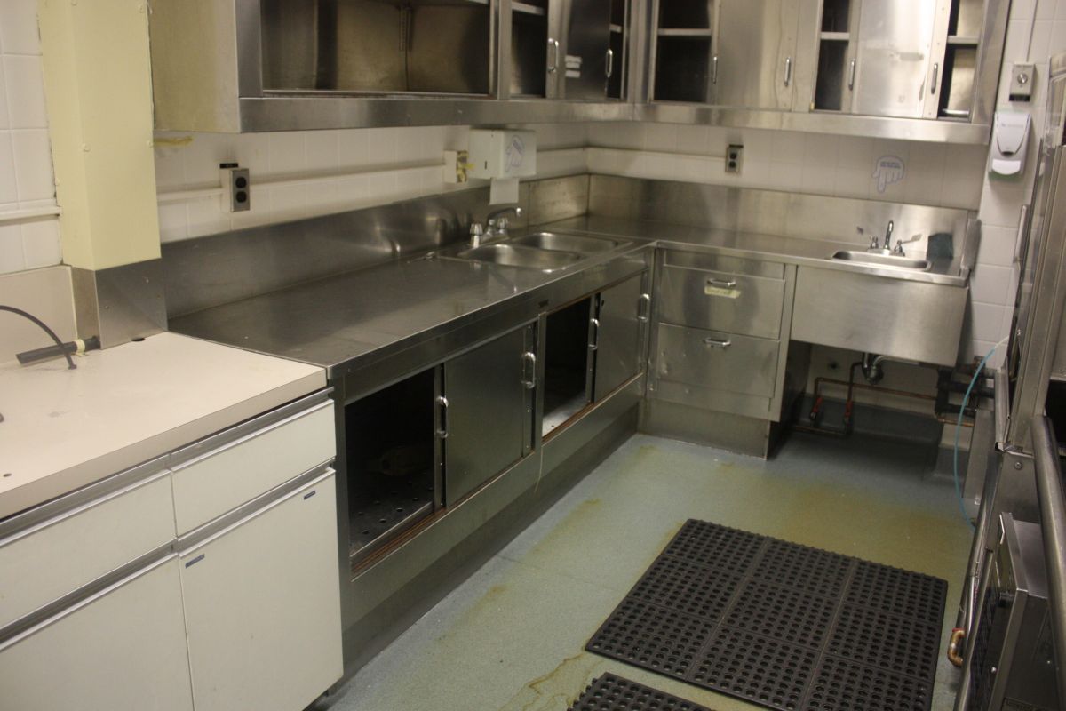 HOBART DISH WASHING STATION INCLUDING DISHWASHER, FEED TABLE, STORAGE CORNER RINSE SINK AND GARBURATOR