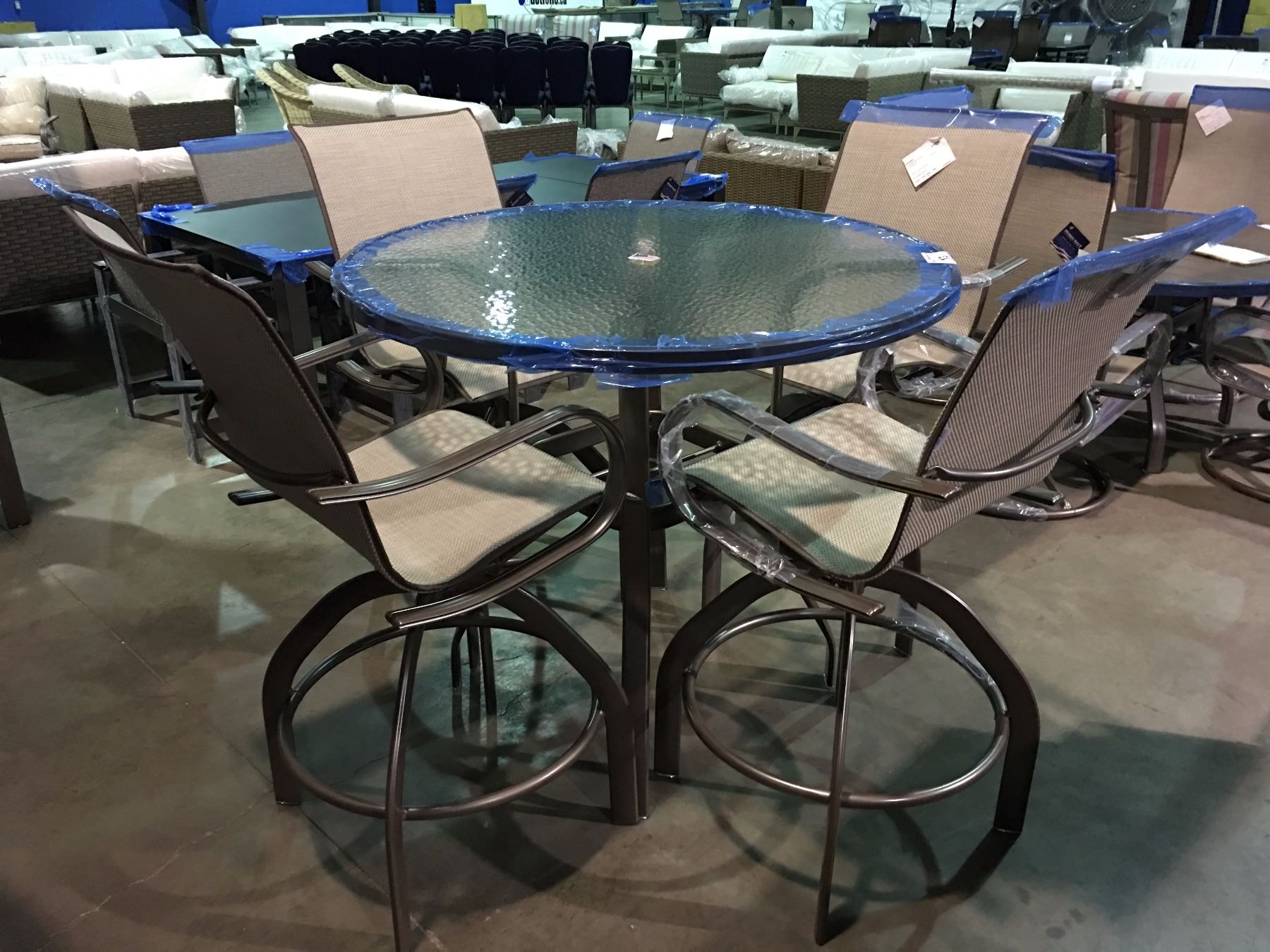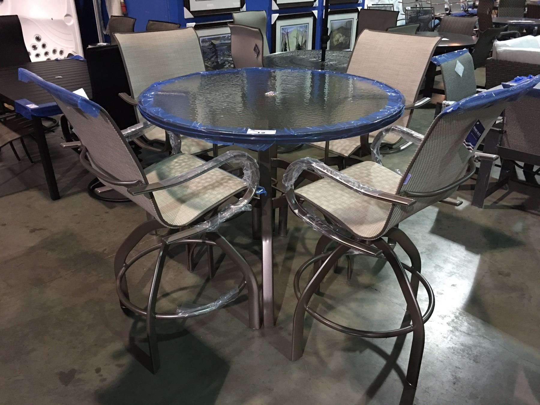 HOME CREST 48" DIAMETER ROUND GLASS PATIO BAR TABLE WITH 4 CHAIRS - POWDER SHALE