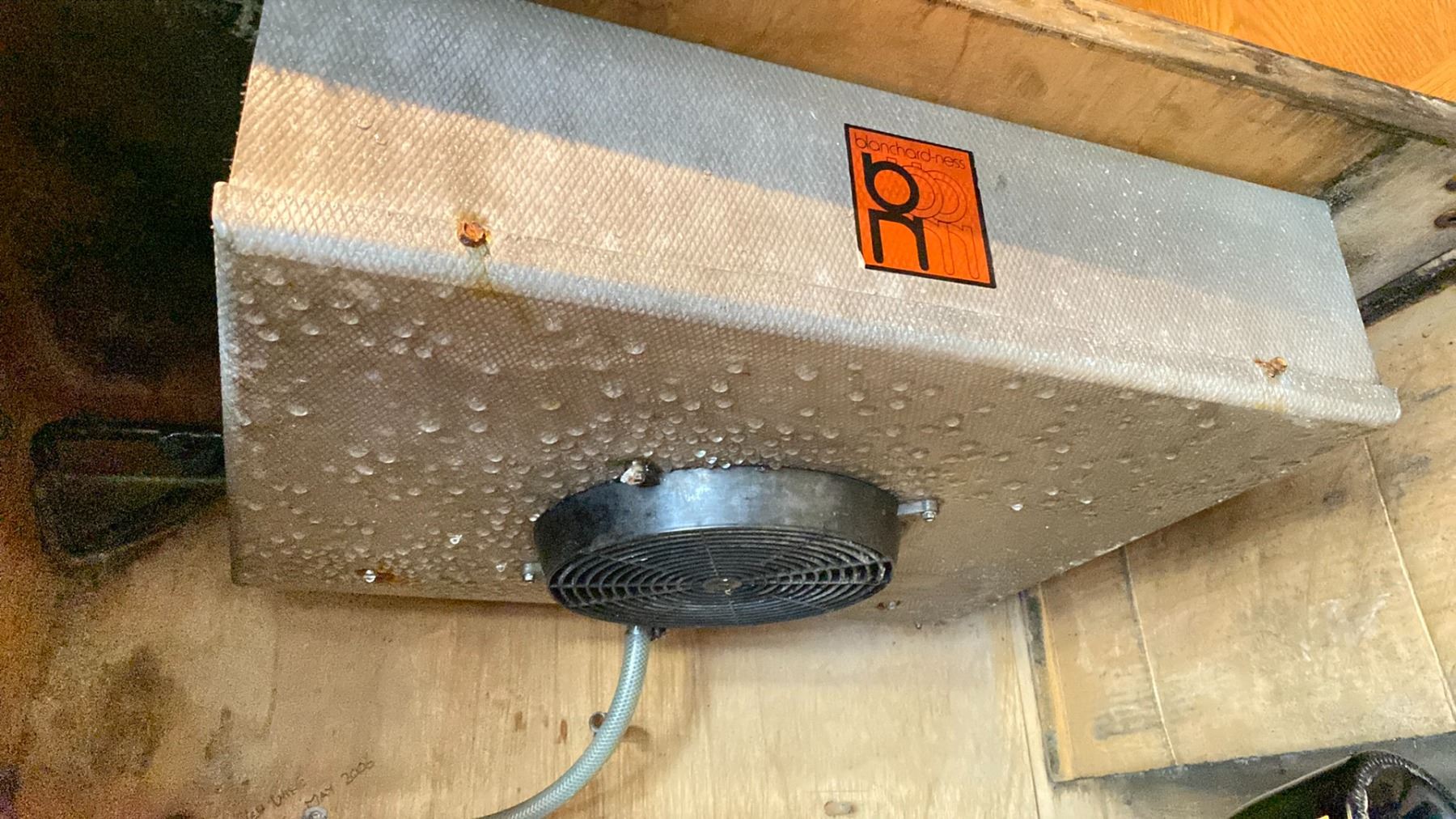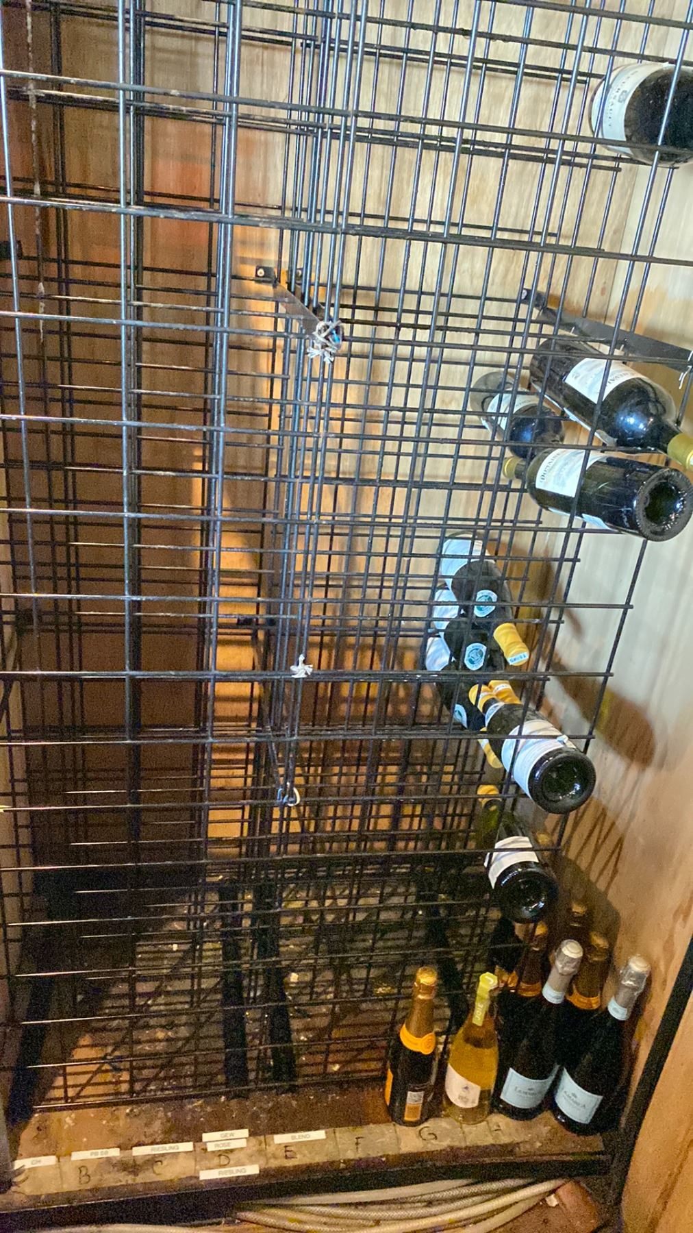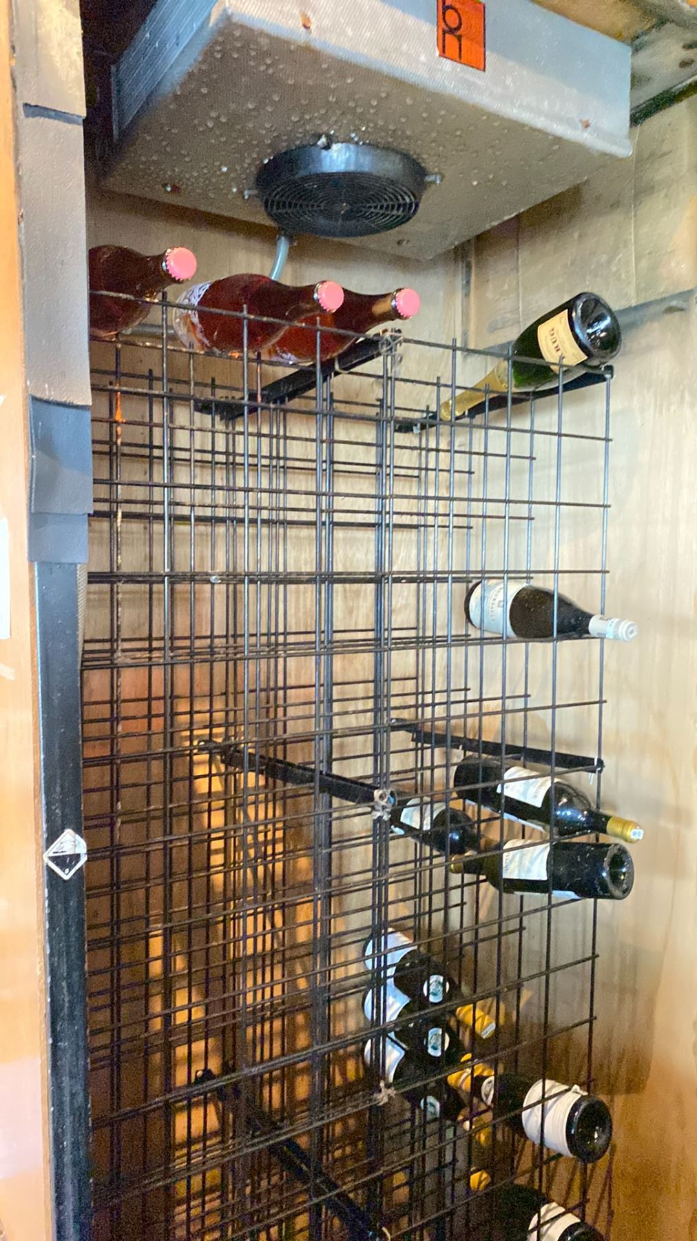 HOME MADE WOODEN BAR COOLER WITH CHILLER FAN AND BLACK METAL WINE RACKING APPROX 8FT H X 3.5 FT W X 3.5 FT D CONTENTS NOT INCLUDED