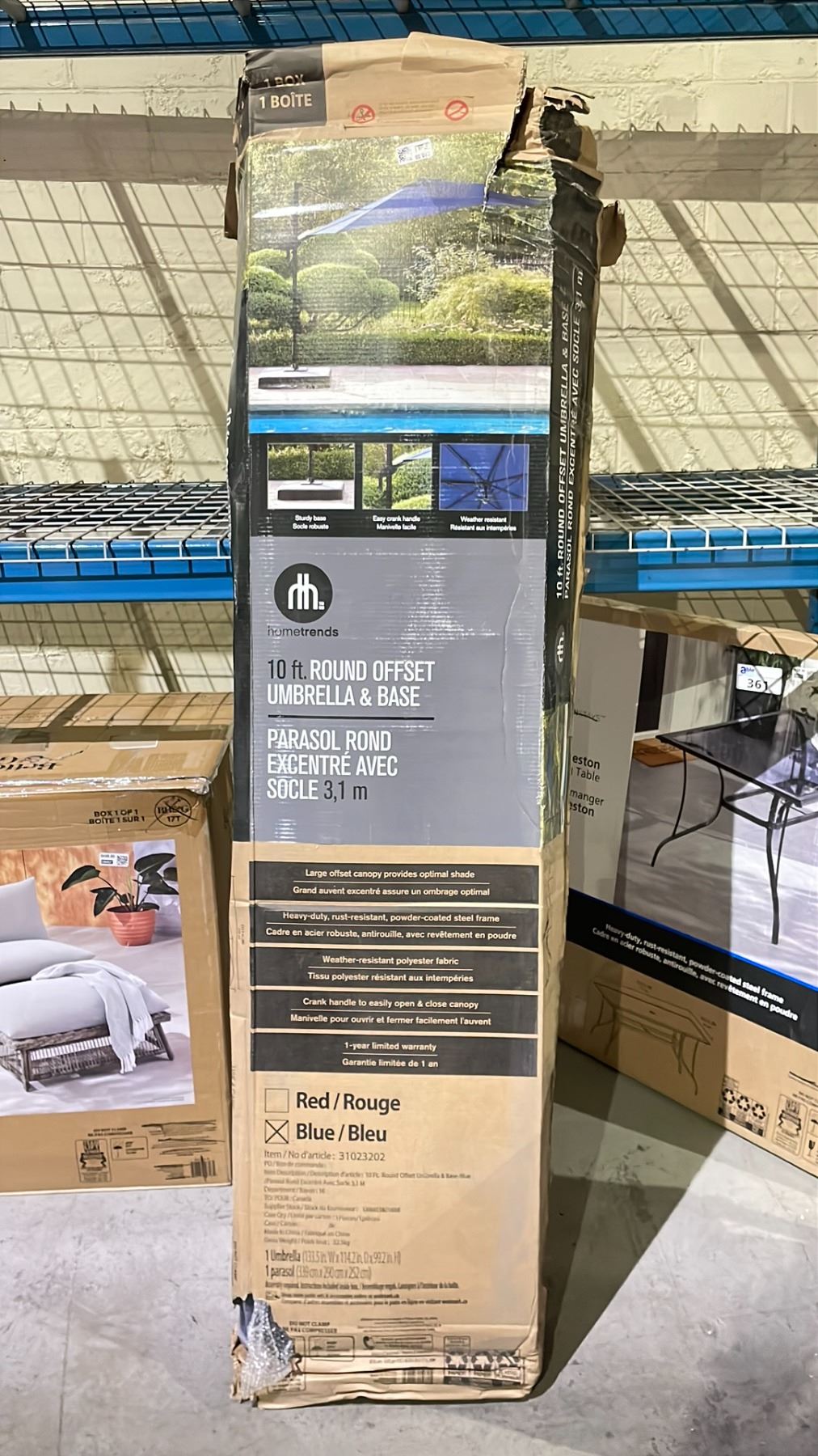 HOMETRENDS 10' ROUND OFFSET UMBRELLA & BASE (MAY BE MISSING PARTS & PIECES)