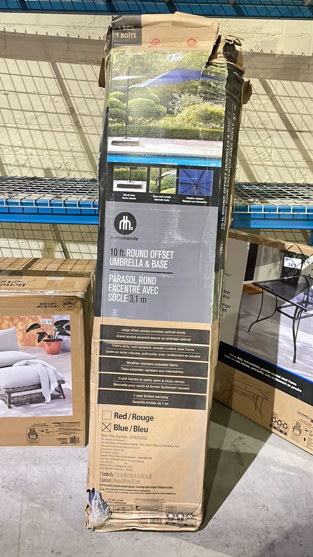 HOMETRENDS 10' ROUND OFFSET UMBRELLA & BASE (MAY BE MISSING PARTS & PIECES)