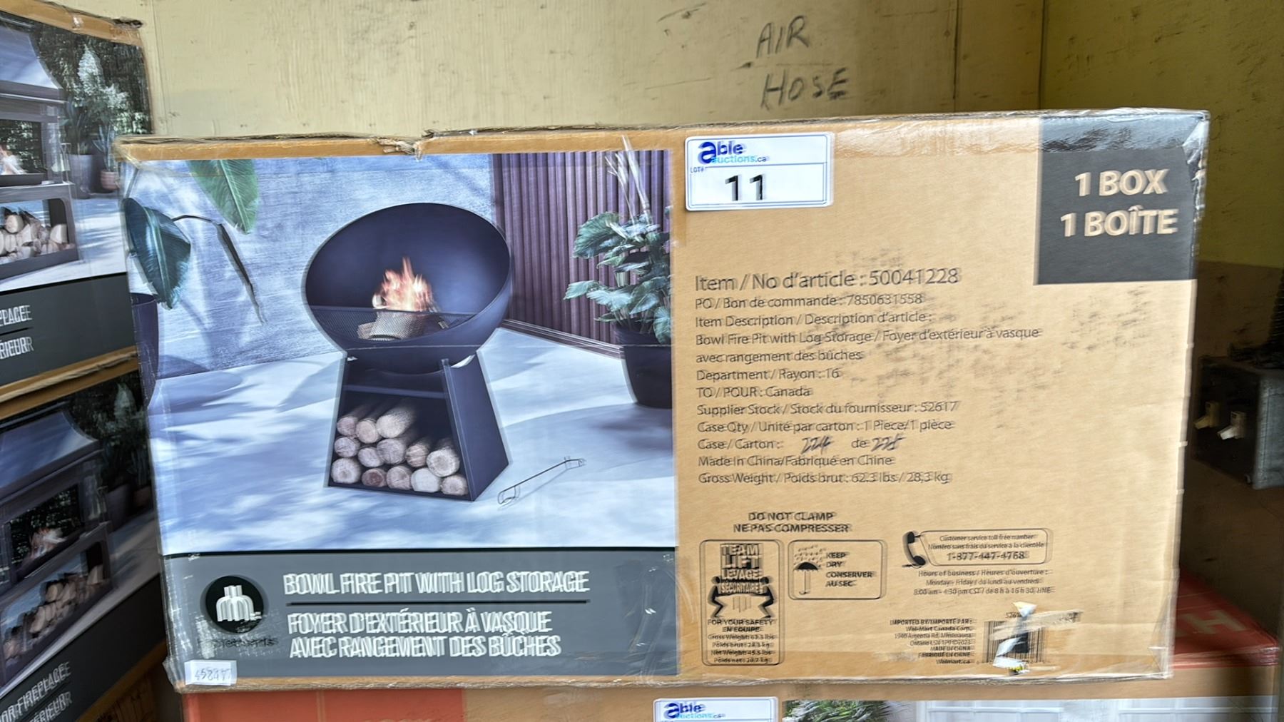 HOMETRENDS BOWL FIRE PIT WITH LOG STORAGE (IN BOX - MAY BE MISSING SOME HARDWARE)